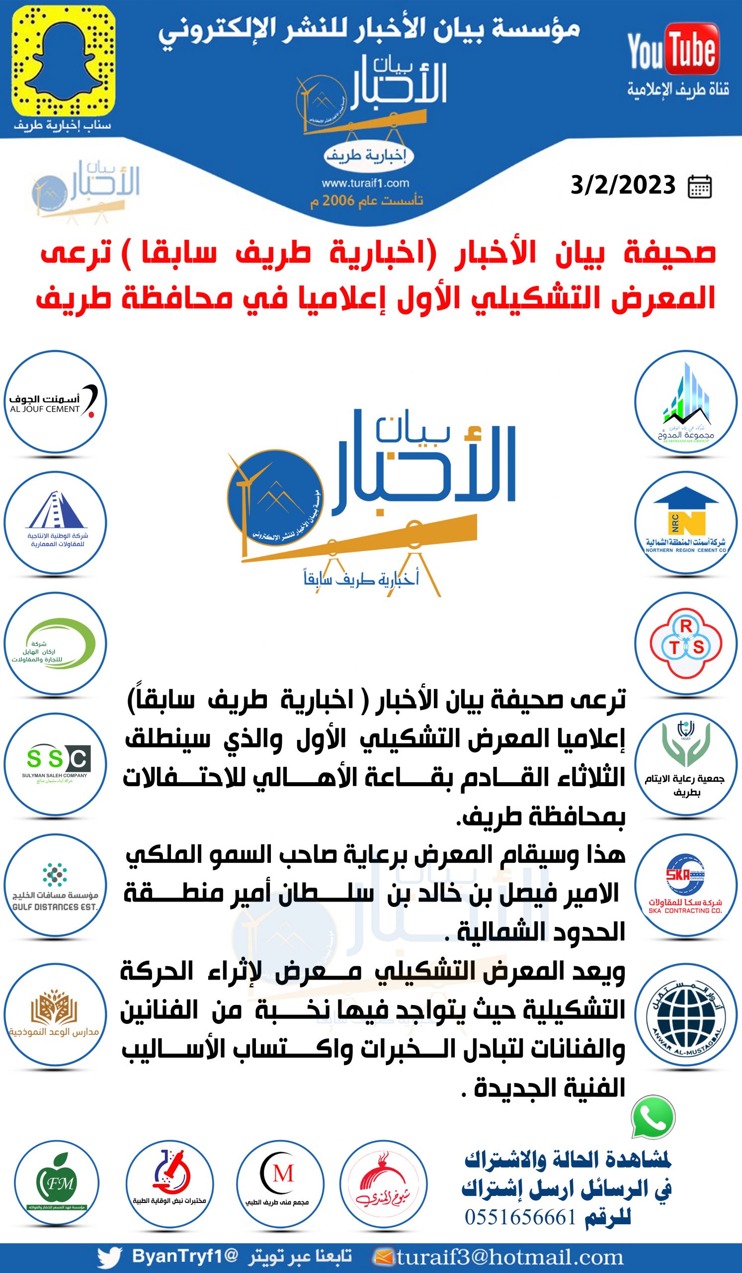 ترعى صحيفة بيان الأخبار ( اخبارية طريف سابقاً) إعلاميا المعرض التشكيلي الأول والذي سينطلق الثلاثاء القادم بقاعة الأهالي للاحتفالات بمحافظة طريف.