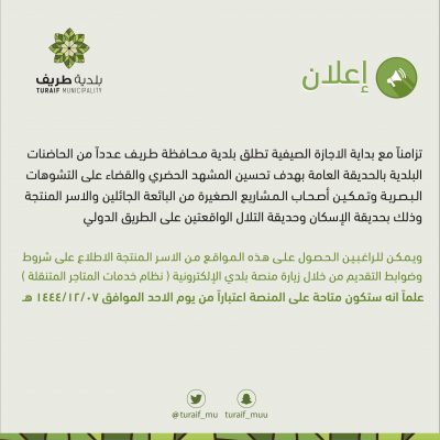 تزامناً مع بداية الاجازة الصيفية تطلق بلدية محافظة طريف عدداً من الحاضنات البلدية بالحديقة العامة بهدف تحسين المشهد الحضري والقضاء على التشوهات البصرية وتمكين أصحاب المشاريع الصغيرة من البائعة الجائلين والاسر المنتجة وذلك بحديقة الإسكان وحديقة التلال الواقعتين على الطريق الدولي.