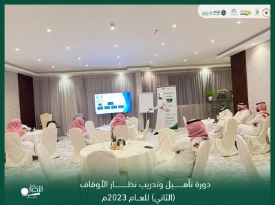 أقامت جمعية نماء للخدمات الوقفية بمنطقة الحدود الشمالية – أوقافنا بالتعاون مع جمعية أحد بالمدينة المنورة وبدعم من مؤسسة سليمان أبانمي الأهلية دورة تأهيل وتدريب نظار الأوقاف (الثاني) لعام 2023م ، تحت إشراف وتنظيم مركز الوعد النموذجي للتدريب التابع لجمعية رعاية الايتام بطريف.