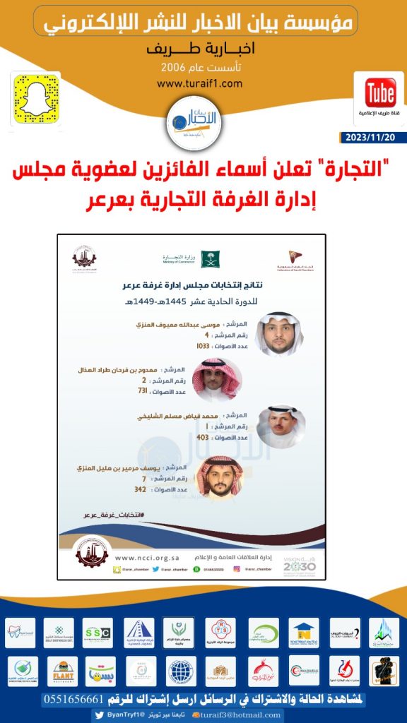 أعلنت لجنة الإشراف على انتخابات أعضاء مجلس إدارة الغرفة التجارية بعرعر للدورة الحادية عشر 1445-1449هـ، أسماء الفائزين، بعد انتهاء عملية الإدلاء بالأصوات مساء اليوم الأثنين عبر نظام التصويت الإلكتروني.
