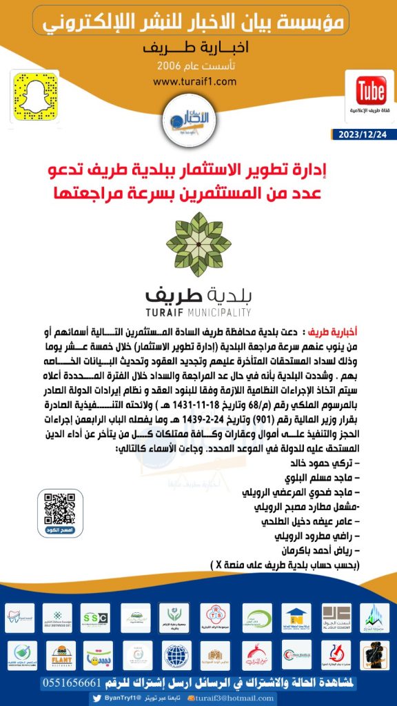 إدارة تطوير الاستثمار ببلدية طريف تدعو عدد من المستثمرين بسرعة مراجعتها