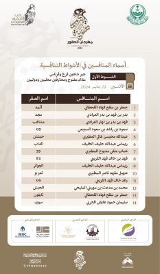 أعلن مهرجان الصقور بالحدود الشمالية في نسخته التاسعة والمقام بمحافظة طريف عن أسماء المنافسين في الأشواط التنافسية لليوم الخامس وجاءت كالتالي: