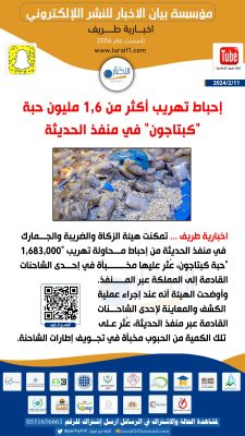 أهم الأخبار في الصحف السعودية هذا اليوم > إحباط تهريب أكثر من 1,6 مليون حبة “كبتاجون” في منفذ الحديثة