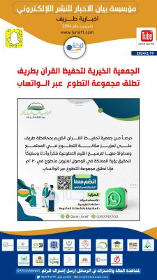 أعلنت الجمعية الخيرية لتحفيظ القرآن الكريم بمحافظة طريف عن مجموعة التطوع عبر الواتساب