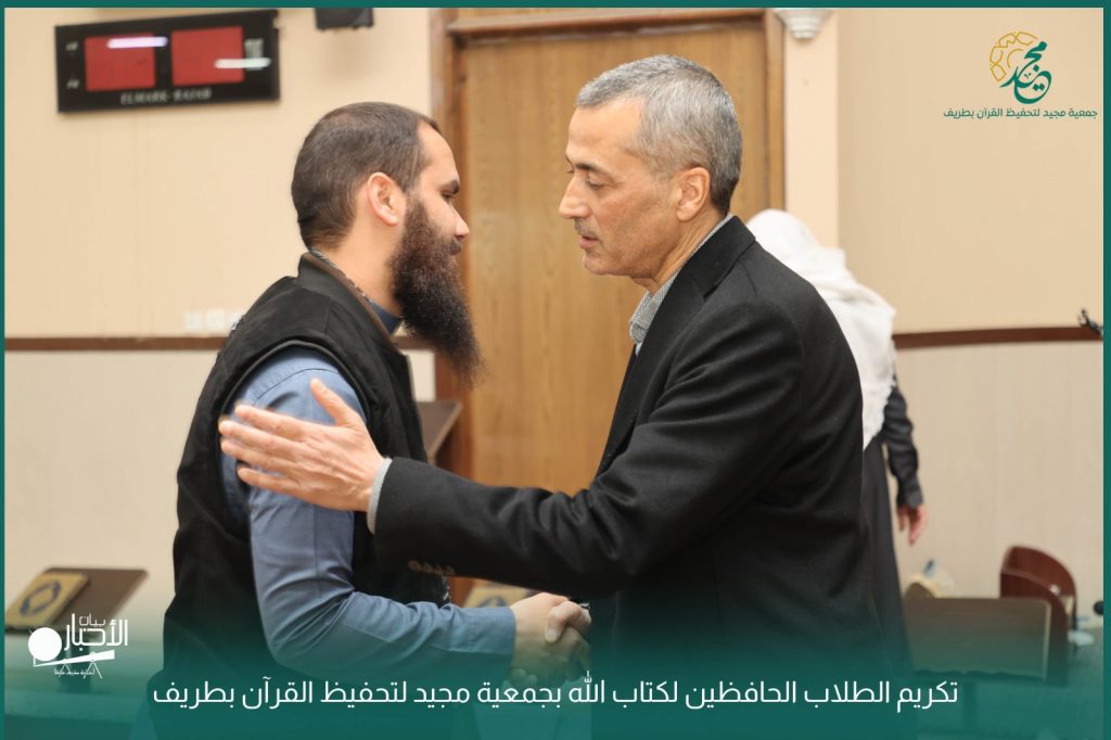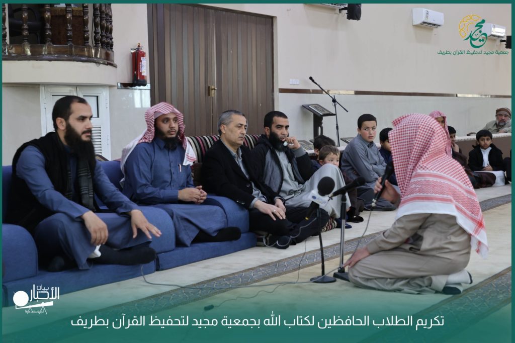 أقامت جمعية “مجيد” لتحفيظ القرآن الكريم بمحافظة طريف، حفل تكريم الطالبان محمد محمد نجيدة، و مصطفى زاهد محلي ذلك بعد أن من الله عليه بحفظ كتابه الكريم ، بالمدرسة القرآنية في جامع الراجحي ، وحصولهما على “إجازة” في القرآن الكريم برواية “حفص عن عاصم” .