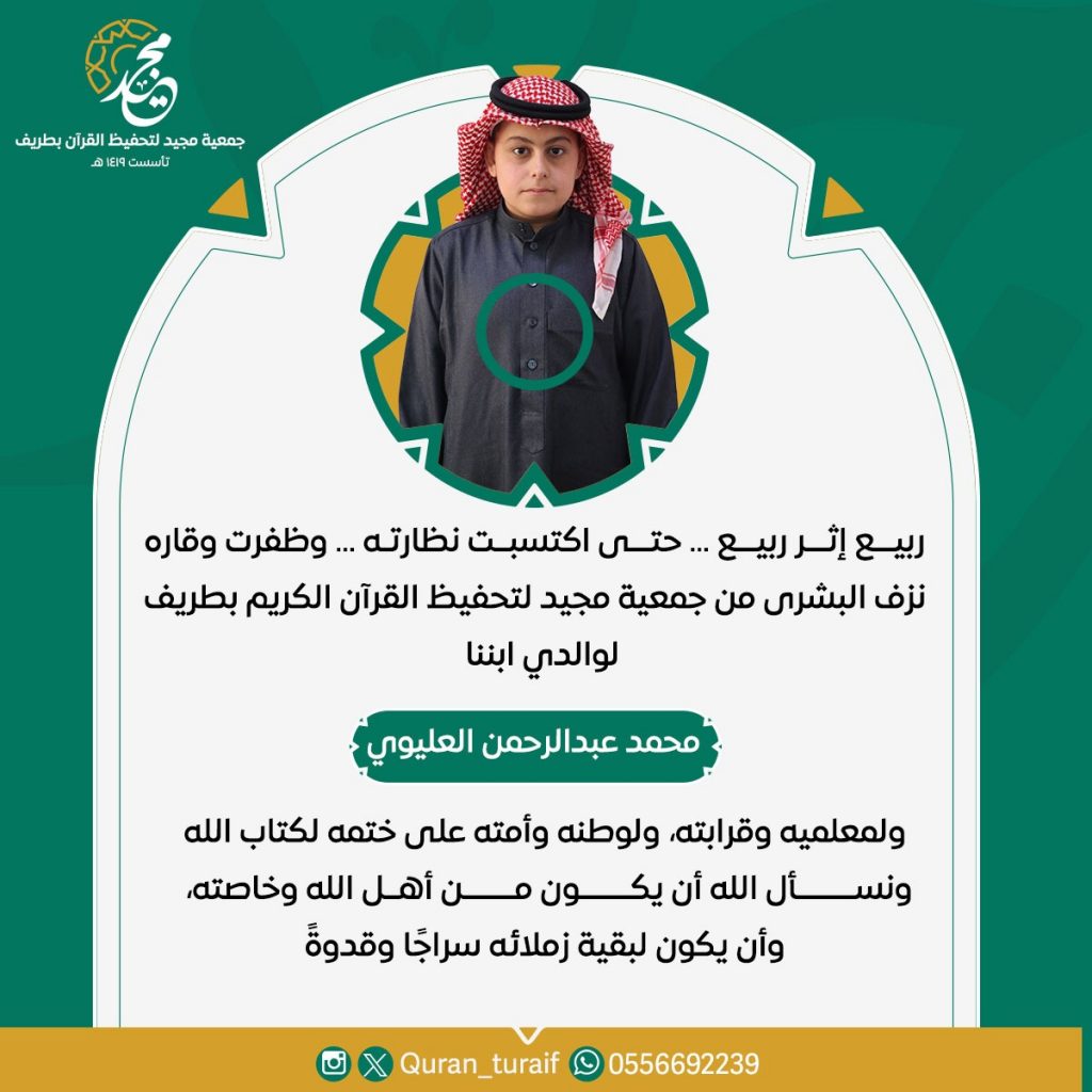 أقامت جمعية “مجيد” لتحفيظ القرآن الكريم بمحافظة طريف، حفل الطالب محمد عبدالرحمن العليوي، وذلك بعد أن من الله عليه بحفظ كتابه الكريم ، في جامع محمد بن عبد الوهاب .