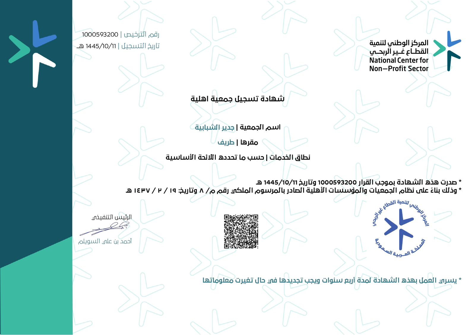 صدرت موافقة المركز الوطني لتنمية القطاع غير الربحي بتسجيل جمعية “جدير الشبابية” بطريف ، برئاسة المهندس يوسف يحيى الزلباني.