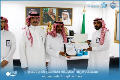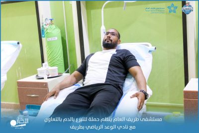 نظم مستشفى طريف العام بمنطقة الحدود الشمالية، اليوم، مبادرة للتبرع بالدم ، وذلك بالتعاون مع نادي الوعد الرياضي، وذلك لتشجيع جميع الفئات على التبرع ونشر ثقافة التبرع بالدم في المجتمع والمحافظة على الصحة العامة.
