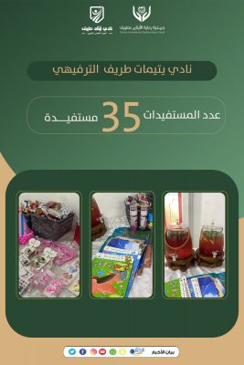 أقام نادي يتيمات طريف الترفيهي التابع لجمعية رعاية الأيتام بمحافظة طريف برنامج ترفيهي لليتيمات لعدد 35 مستفيدة.