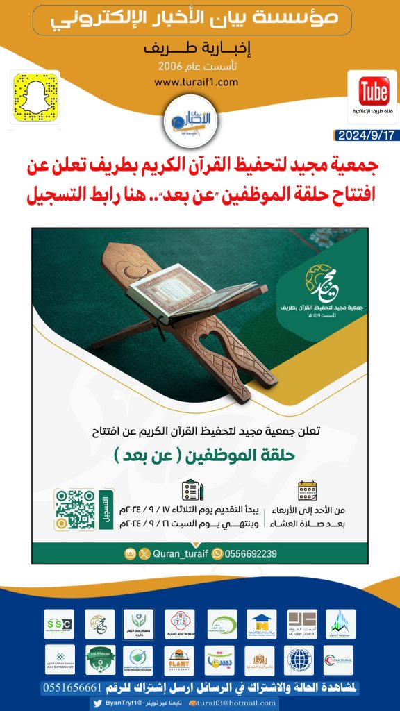 أعلنت جمعية مجيد لتحفيظ القرآن الكريم بمحافظة طريف عن افتتاح حلقة الموظفين “عن بعد” ، وذلك من يوم الأحد إلى يوم الأربعاء بعد صلاة العشاء.