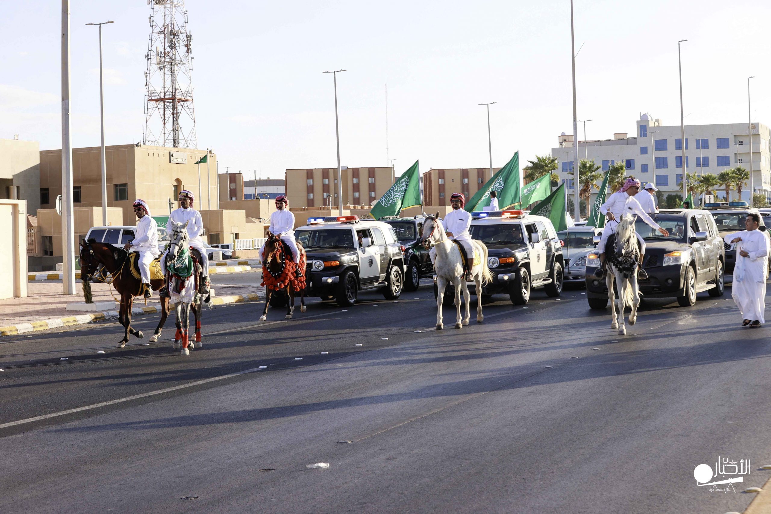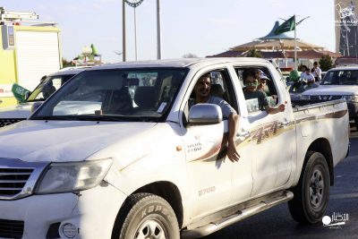 وانطلقت المسيرة حاملةً صور القيادة والأعلام والشعارات الخضراء والعبارات الوطنية، وسط مشاعر وطنية مفعمة من المشاركين بالحبّ والولاء والانتماء للوطن، واحتفاءً بهذه المناسبة العزيزة.