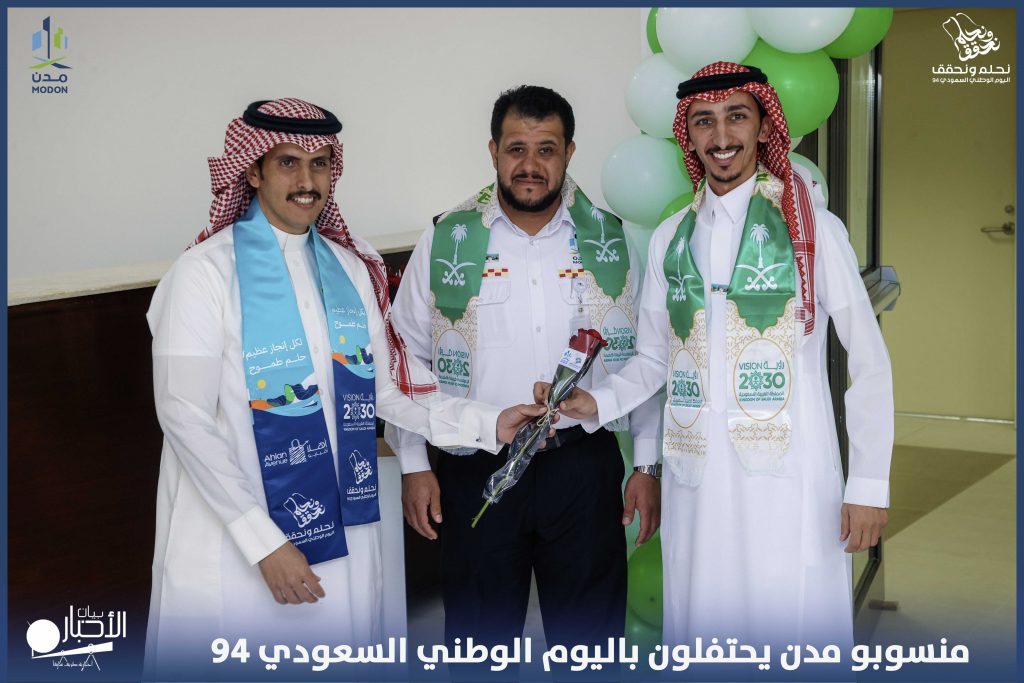 وشمل الحفل على السلام الملكي ، والاحتفاء أيضاً بالعرضة السعودية والدحة تعبيراً عن الفرح و السلام باليوم الوطني ال 94، فيما تبادل الحضور النقاشات التي تعبر عن الاعتزاز بالوطن في هذه المناسبة الوطنية الغالية على نفوس الجميع، واستعرض الحضور مجسمات للمدن الصناعية بالشمال.