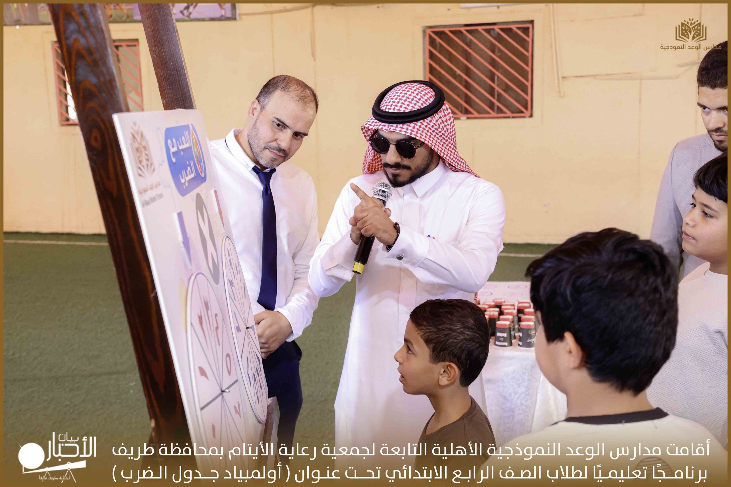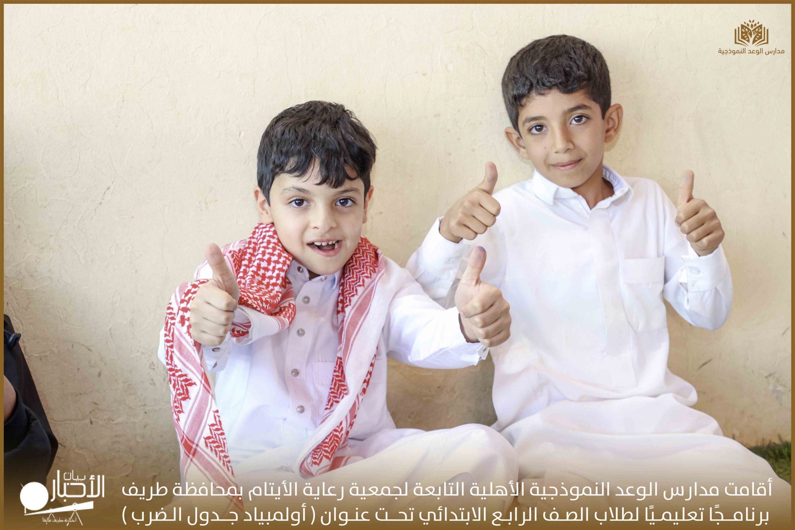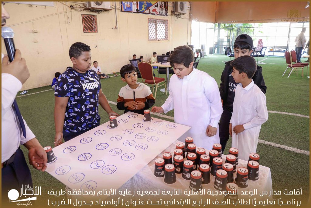 أقامت مدارس الوعد النموذجية الأهلية التابعة لجمعية رعاية الأيتام بمحافظة طريف برنامجًا تعليميًا لطلاب الصف الرابع الابتدائي تحت عنوان ( أولمبياد جدول الضرب ) وذلك بهدف معرفة مدى إتقان الطلاب لمهارات جدول الضرب وتفعيل الأنشطة اللاصفية وكذلك إثراء روح التعاون والتنافس بين الطلاب ٠