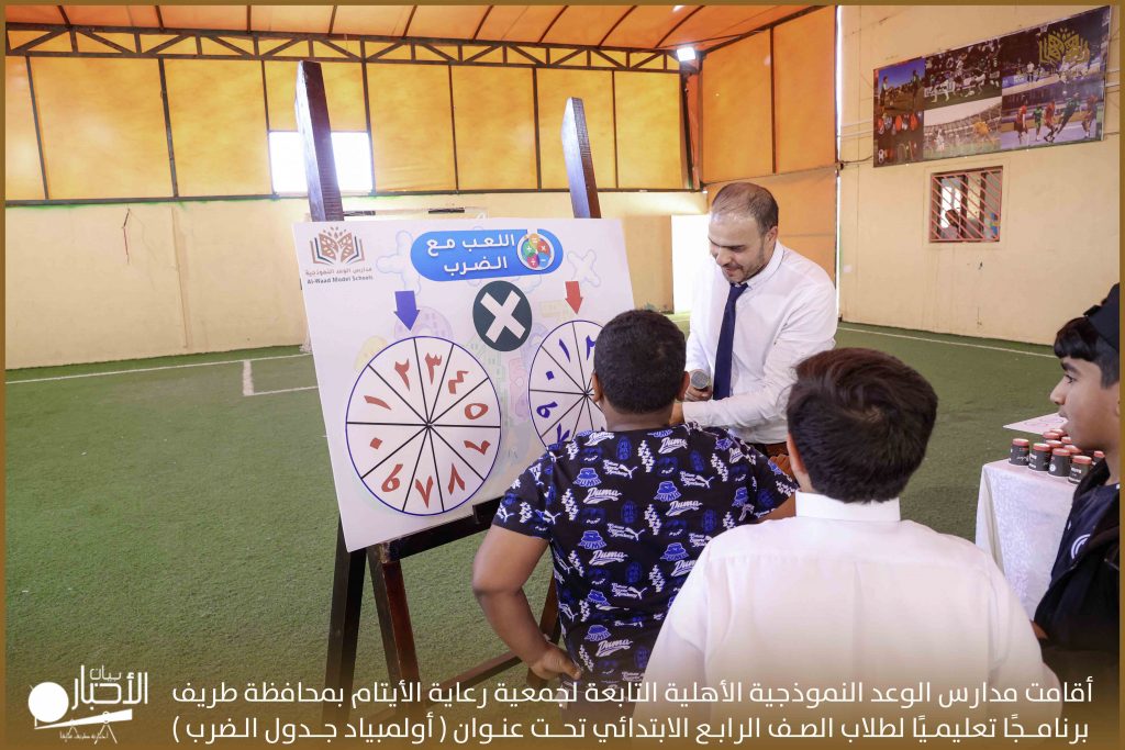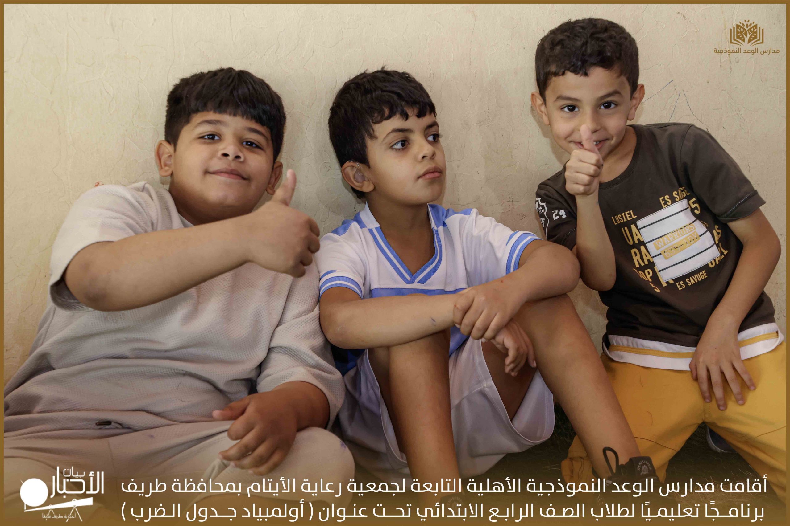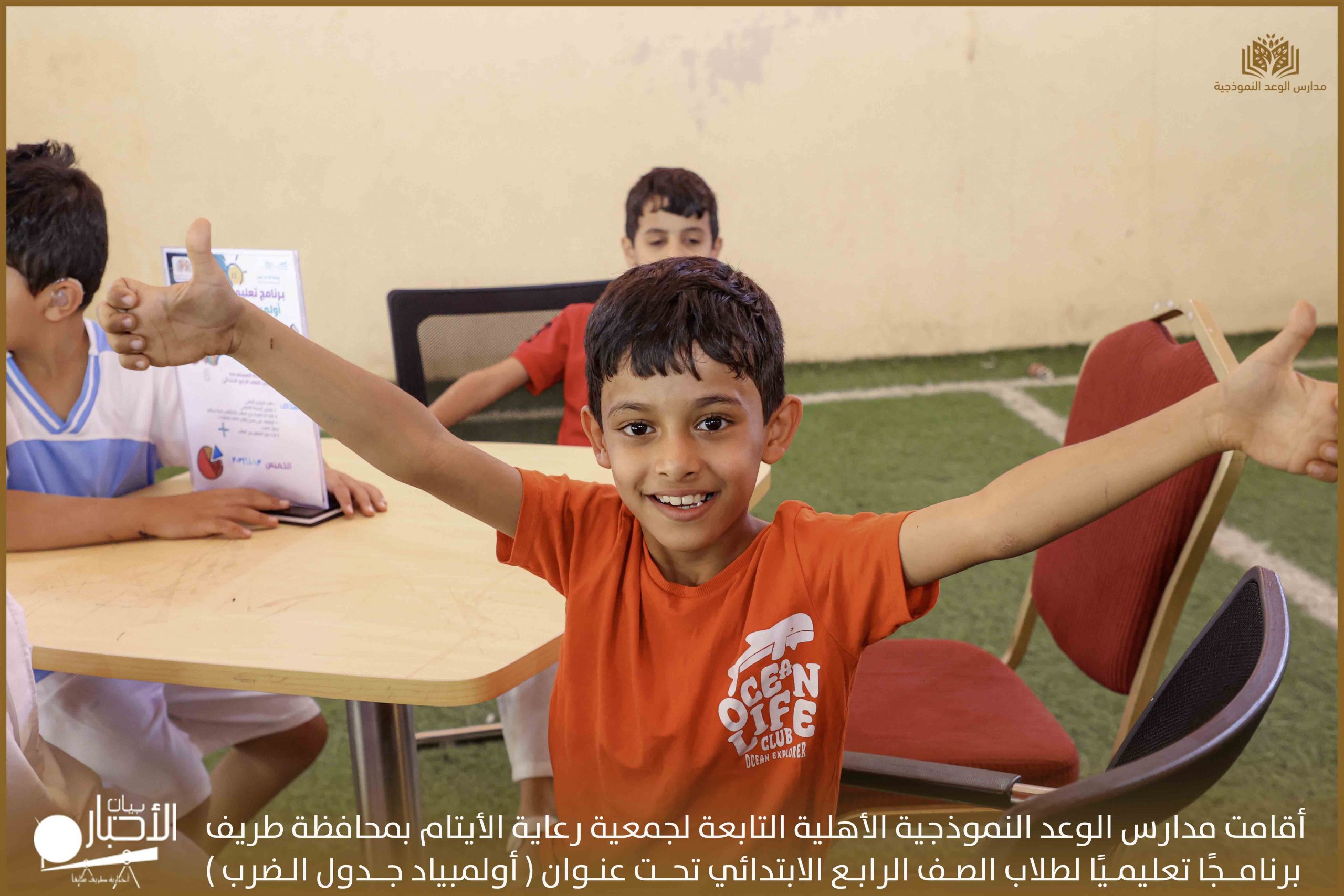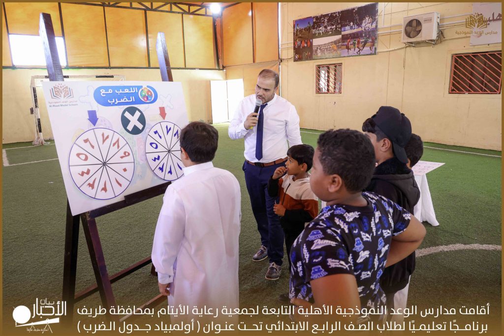 أقامت مدارس الوعد النموذجية الأهلية التابعة لجمعية رعاية الأيتام بمحافظة طريف برنامجًا تعليميًا لطلاب الصف الرابع الابتدائي تحت عنوان ( أولمبياد جدول الضرب ) وذلك بهدف معرفة مدى إتقان الطلاب لمهارات جدول الضرب وتفعيل الأنشطة اللاصفية وكذلك إثراء روح التعاون والتنافس بين الطلاب ٠