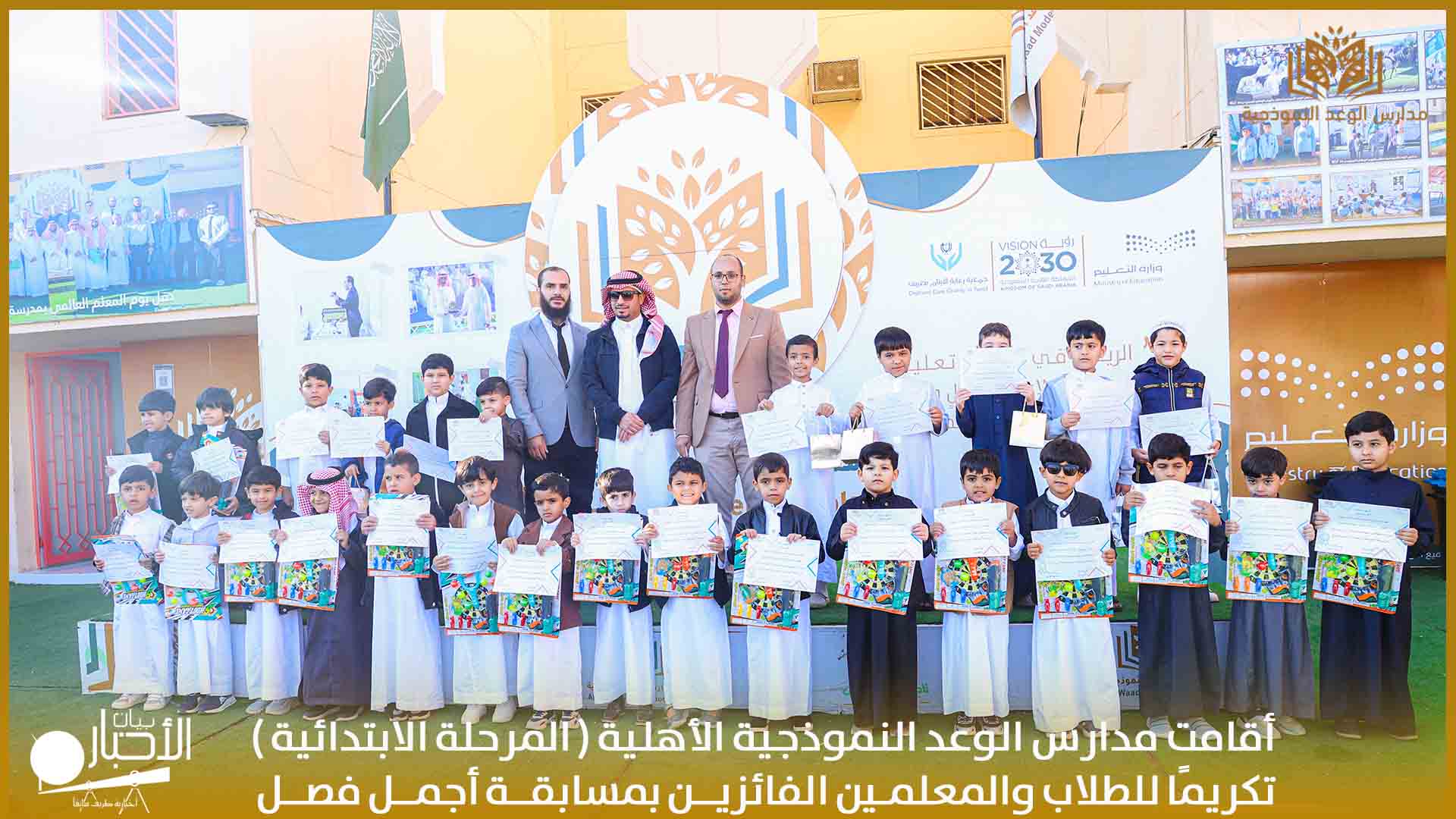 أقامت مدارس الوعد النموذجية الأهلية ( المرحلة الابتدائية ) تكريمًا للطلاب والمعلمين الفائزين بمسابقة أجمل فصل، حيث حصل صف الأستاذ عصام النجار( أول / ثالث ) و صف الأستاذ عمر السبع ( ثالث / أول ) على المراكز الأولى بالمسابقة.