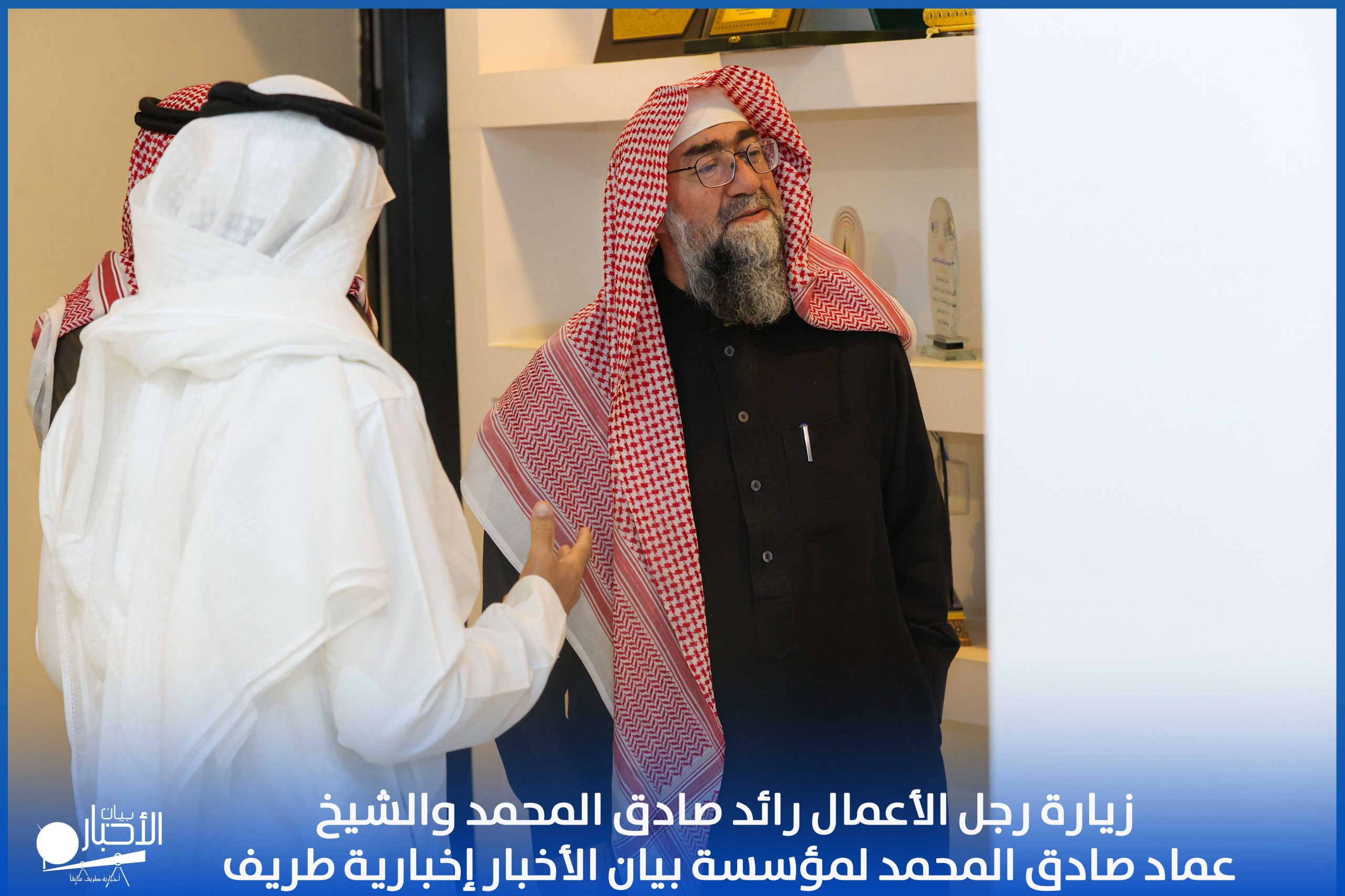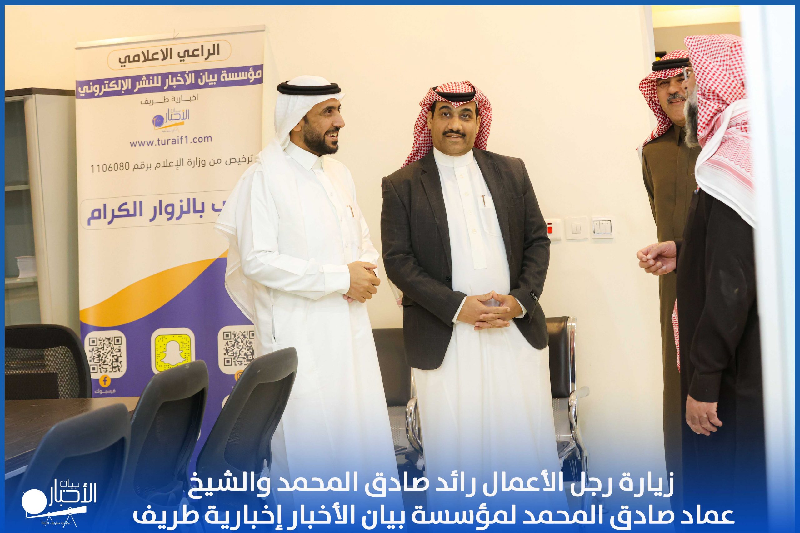 زار رجل الأعمال رائد صادق المحمد والشيخ الدكتور عماد صادق المحمد مقر مؤسسة بيان الأخبار ( إخبارية طريف سابقا)، وكان في استقبالهم إدارة الموقع ممثلة بالأستاذ فهد الدغماني , والأستاذ محمد الموزن.