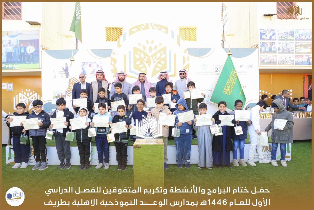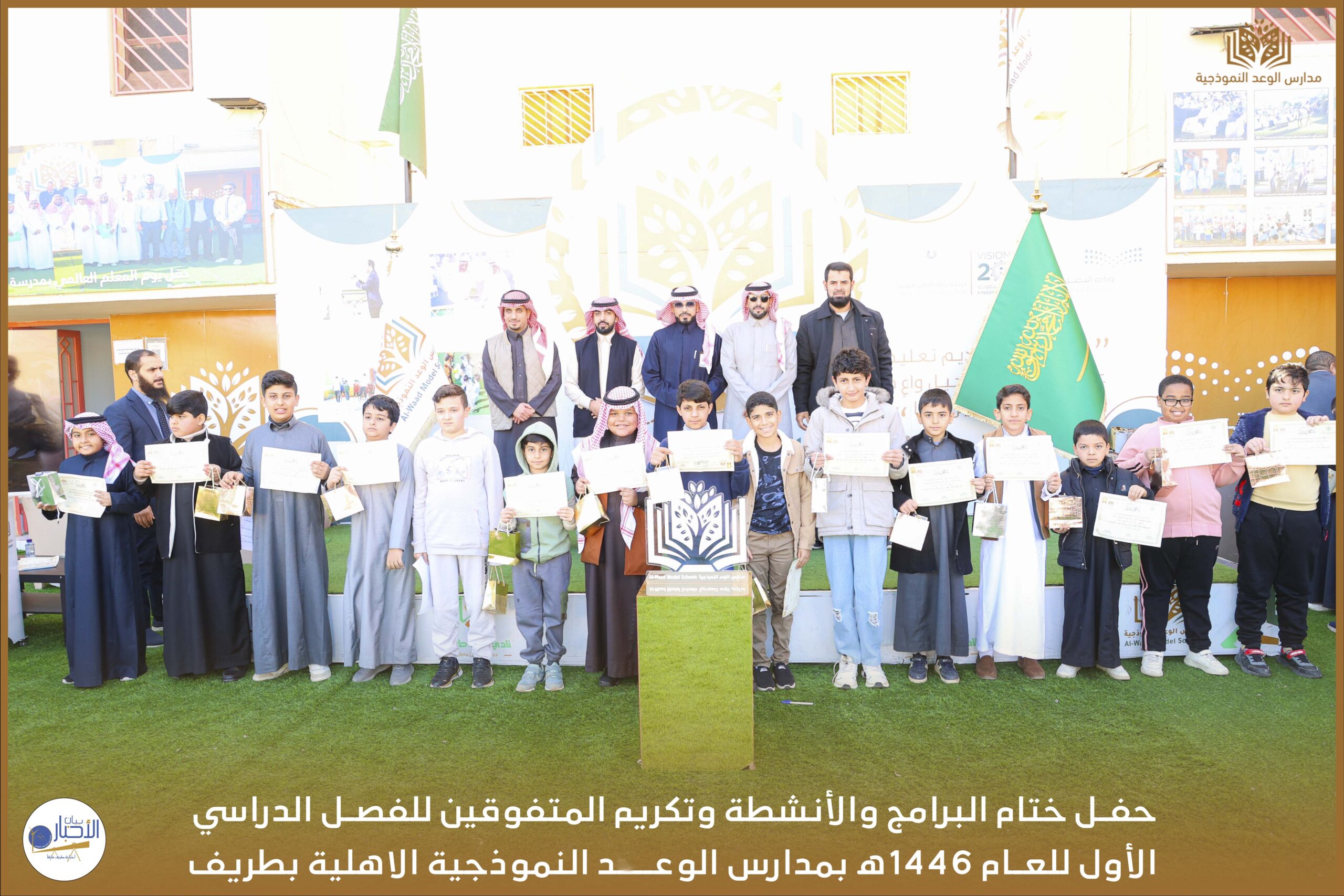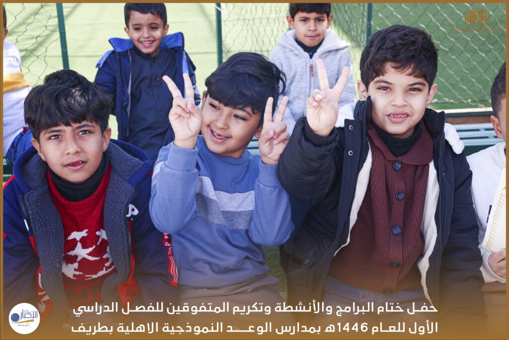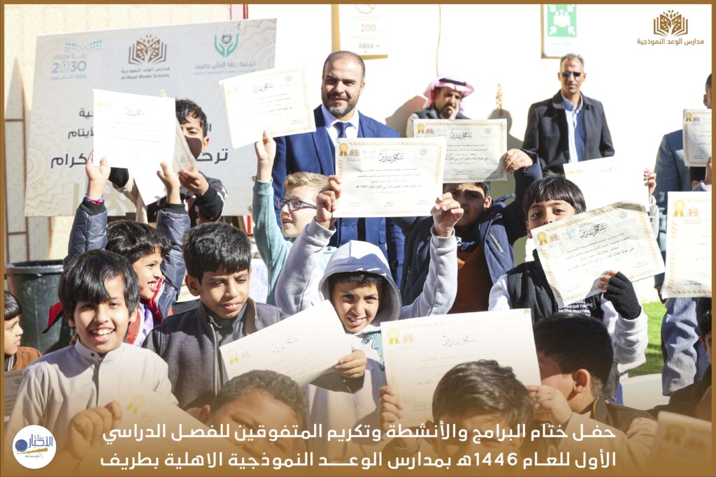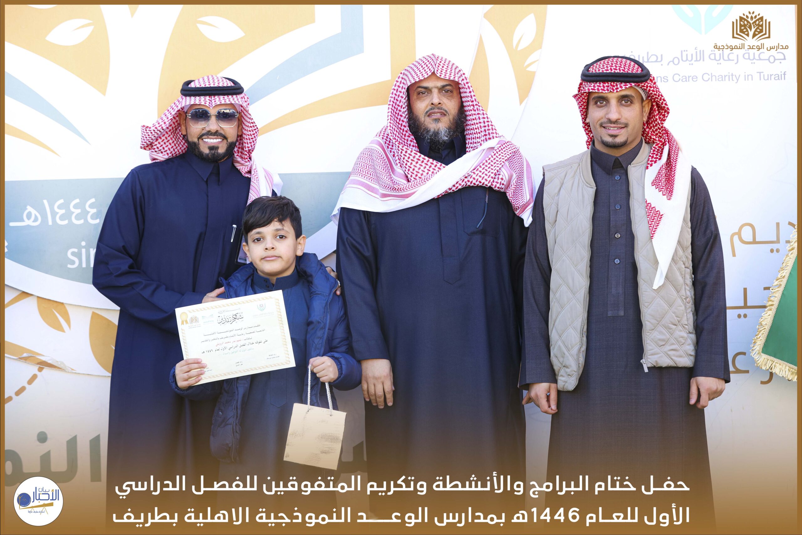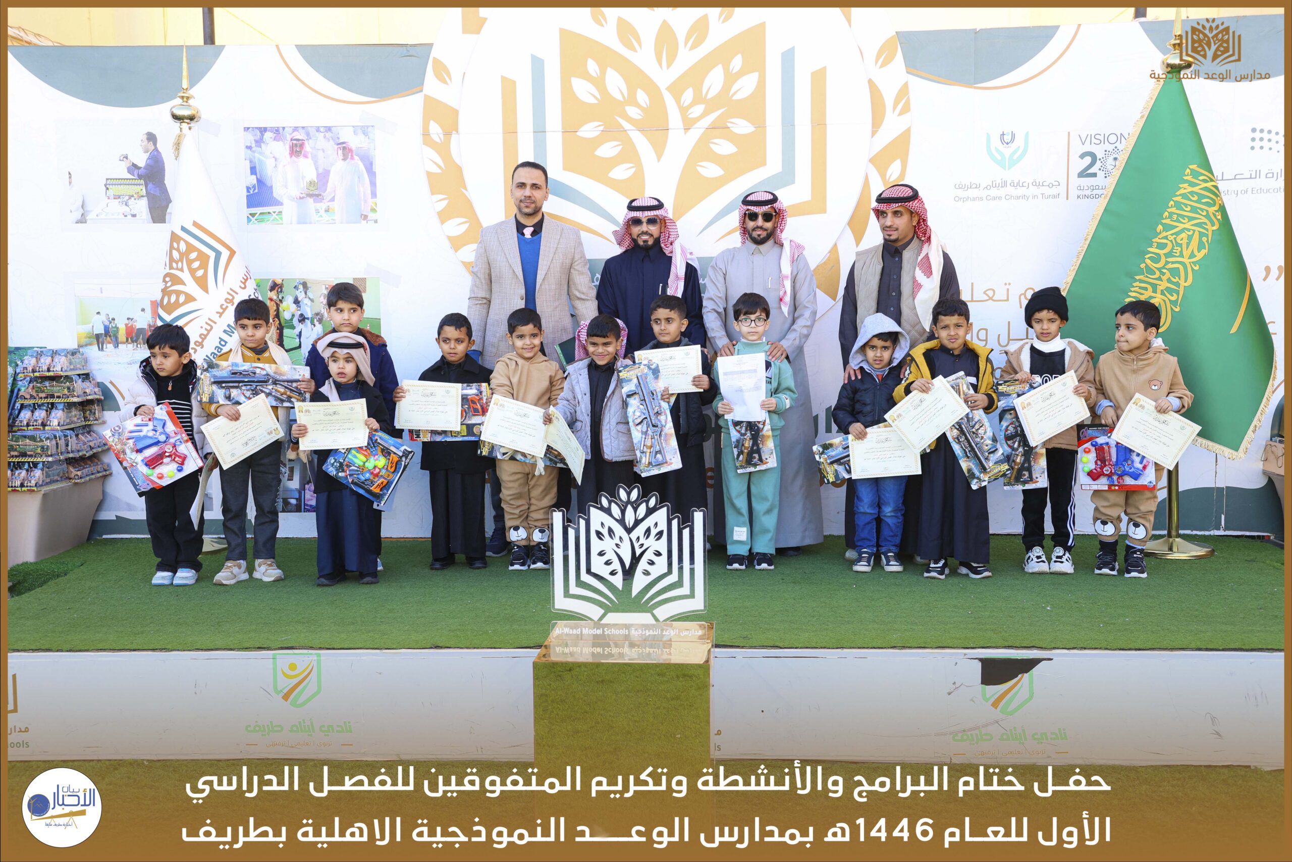 أقامت مدارس الوعد النموذجية الأهلية التابعة لجمعية رعاية الأيتام بمحافظة طريف ( القسم الابتدائي ) حفلًا ختاميًا للبرامج والأنشطة والفعاليات المقامة طيلة الفصل الدراسي الأول وذلك بحضور نائب رئيس مجلس إدارة جمعية رعاية الأيتام الأستاذ محمد سالم الرويلي والأستاذ طلال لهيلم العنزي ممثلًا عن مكتب تعليم طريف والسادة أولياء أمور الطلاب.