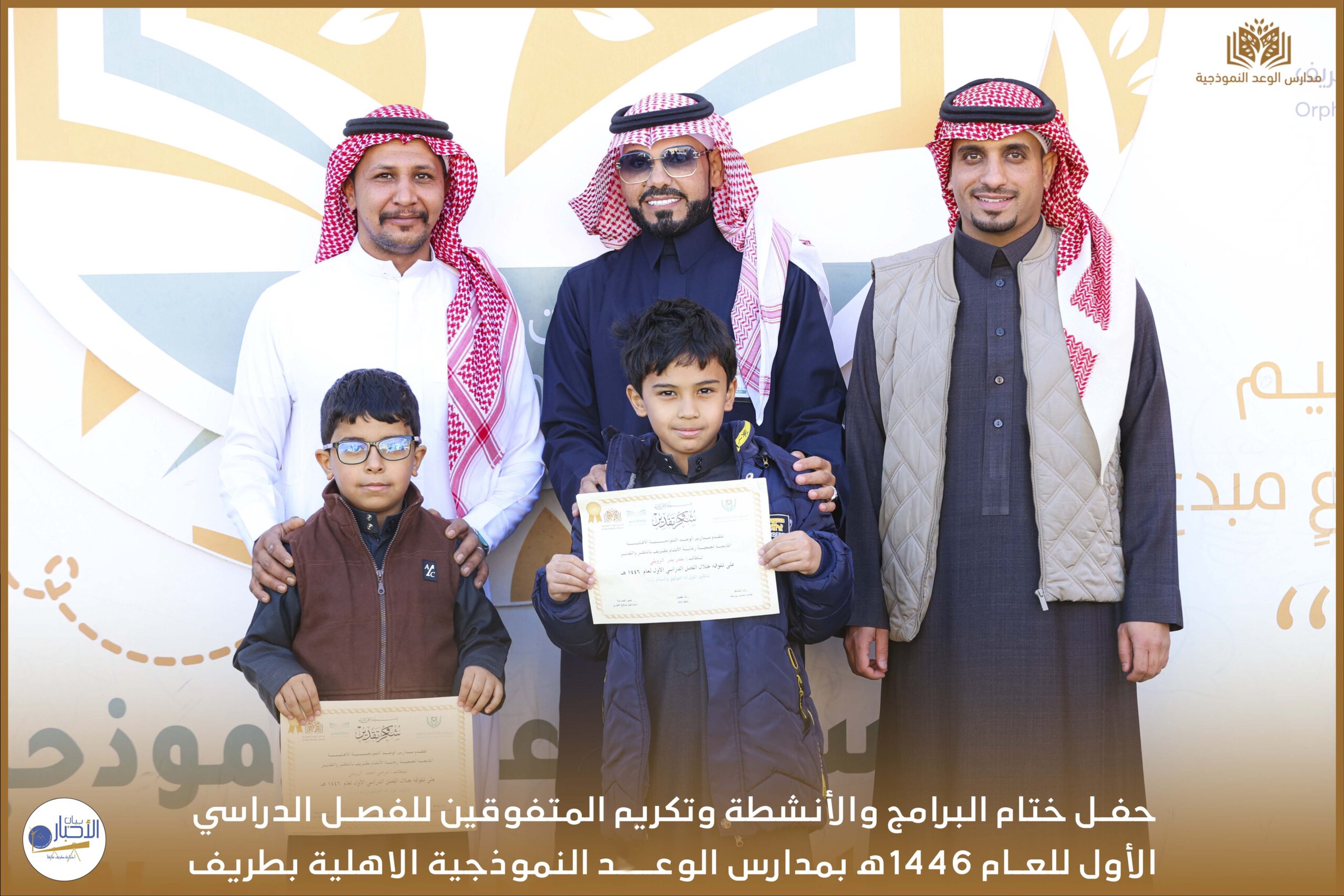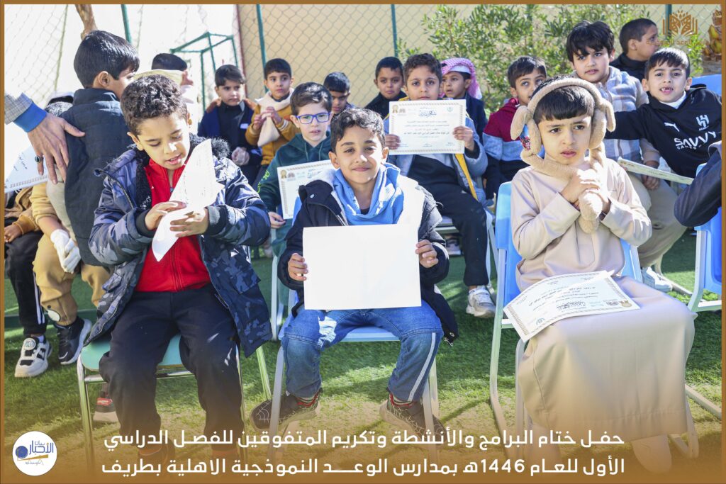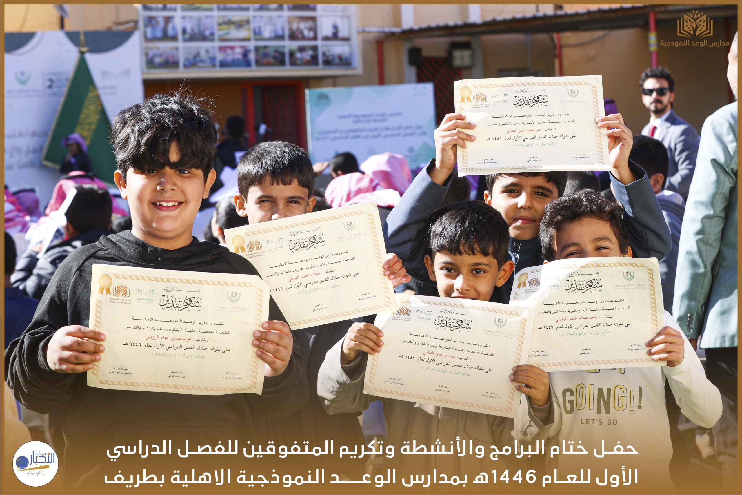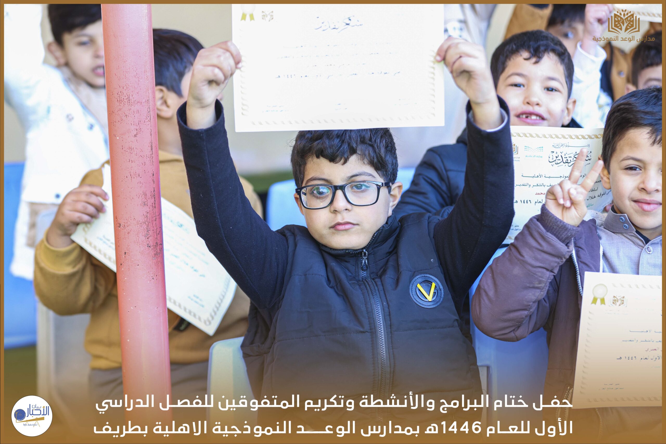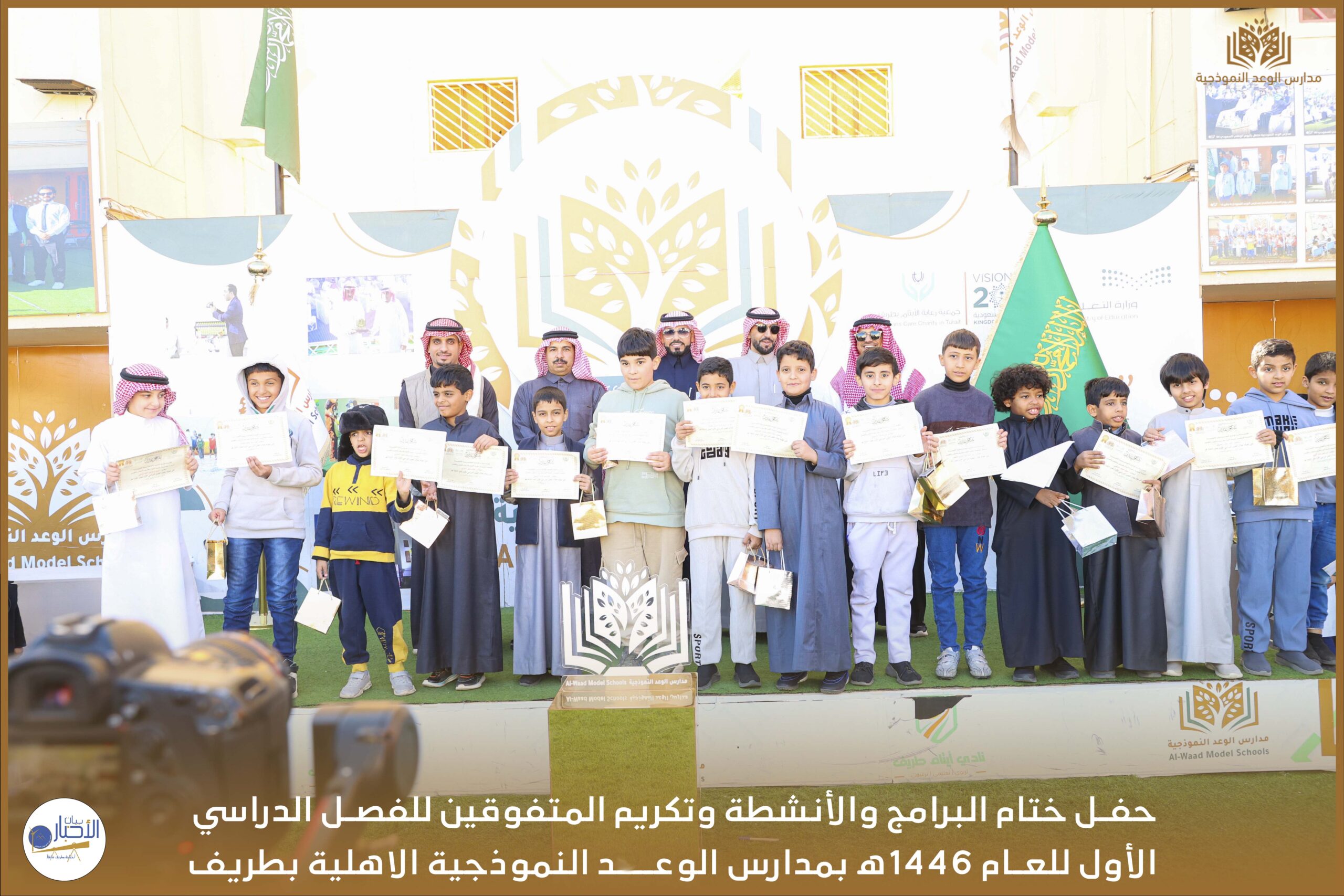 أقامت مدارس الوعد النموذجية الأهلية التابعة لجمعية رعاية الأيتام بمحافظة طريف ( القسم الابتدائي ) حفلًا ختاميًا للبرامج والأنشطة والفعاليات المقامة طيلة الفصل الدراسي الأول وذلك بحضور نائب رئيس مجلس إدارة جمعية رعاية الأيتام الأستاذ محمد سالم الرويلي والأستاذ طلال لهيلم العنزي ممثلًا عن مكتب تعليم طريف والسادة أولياء أمور الطلاب.