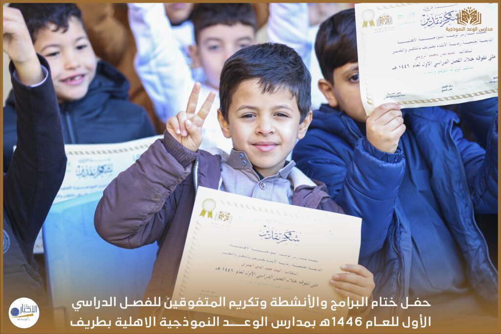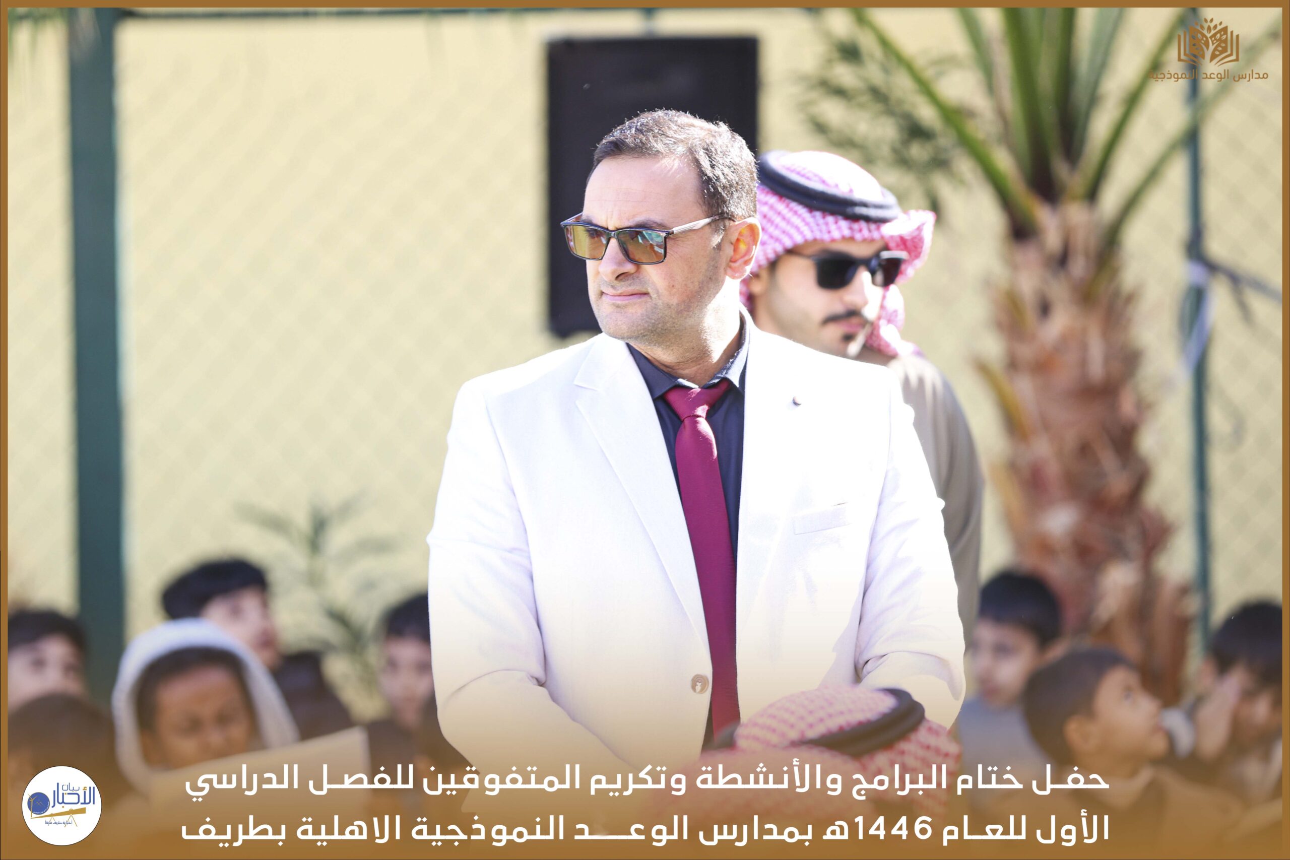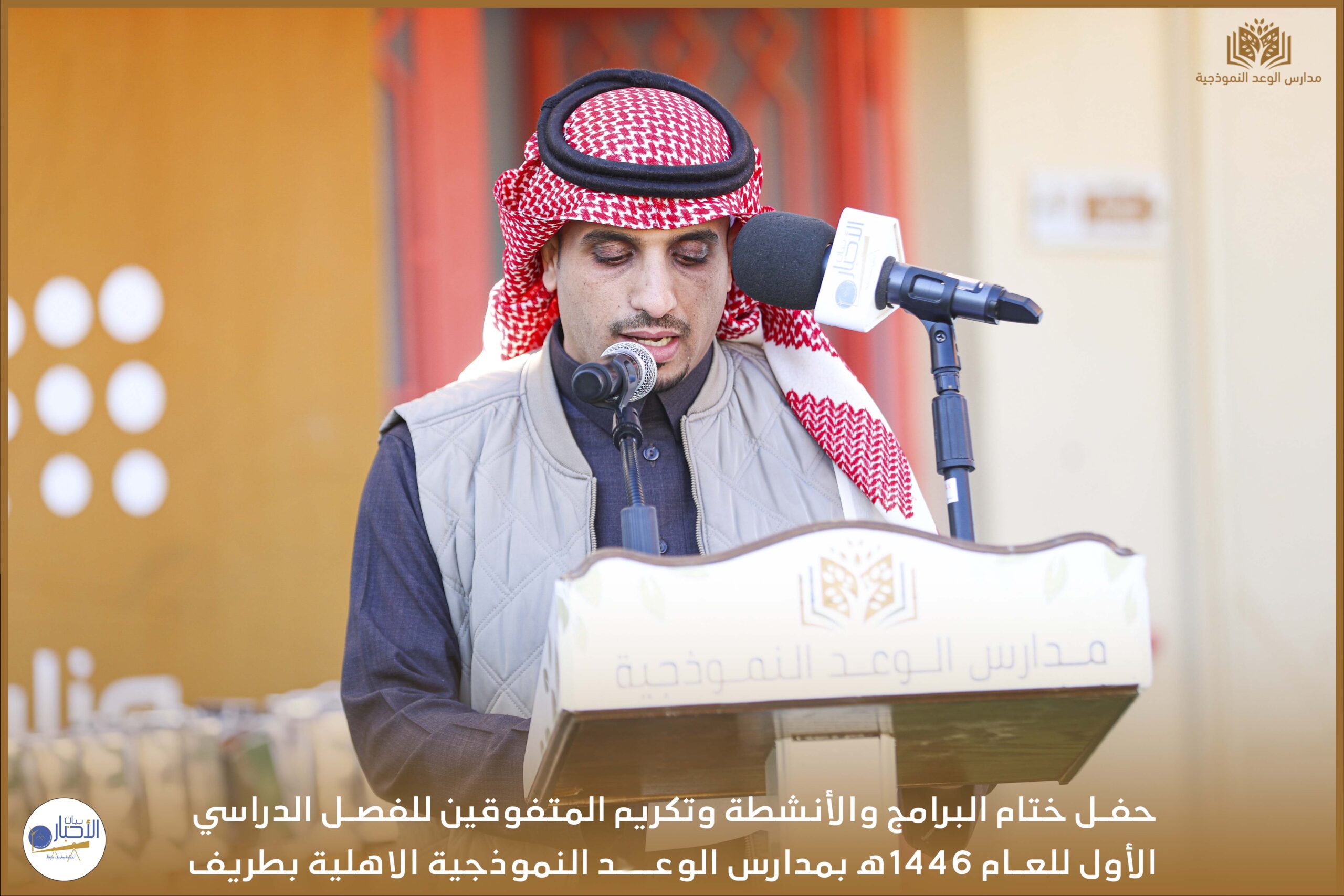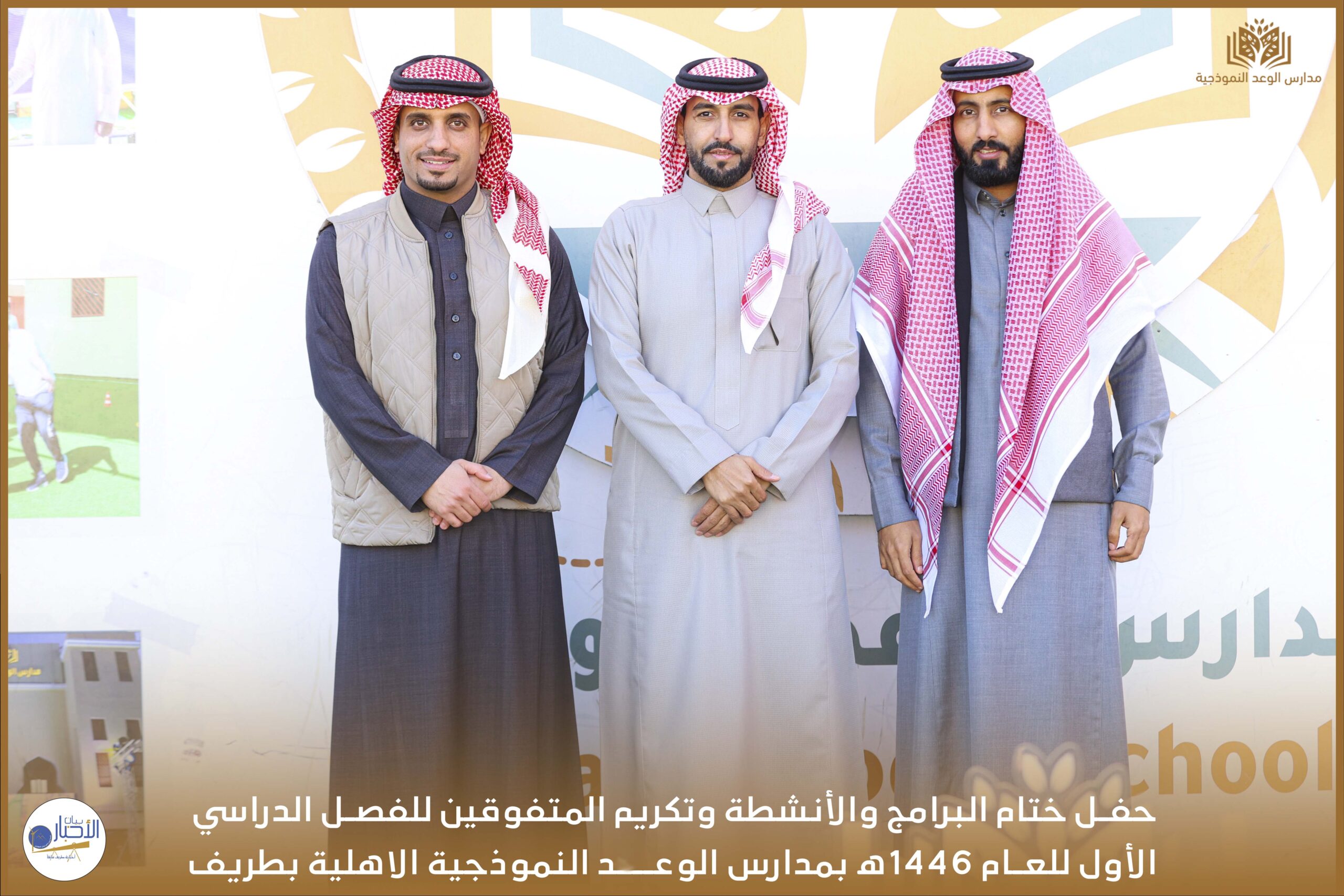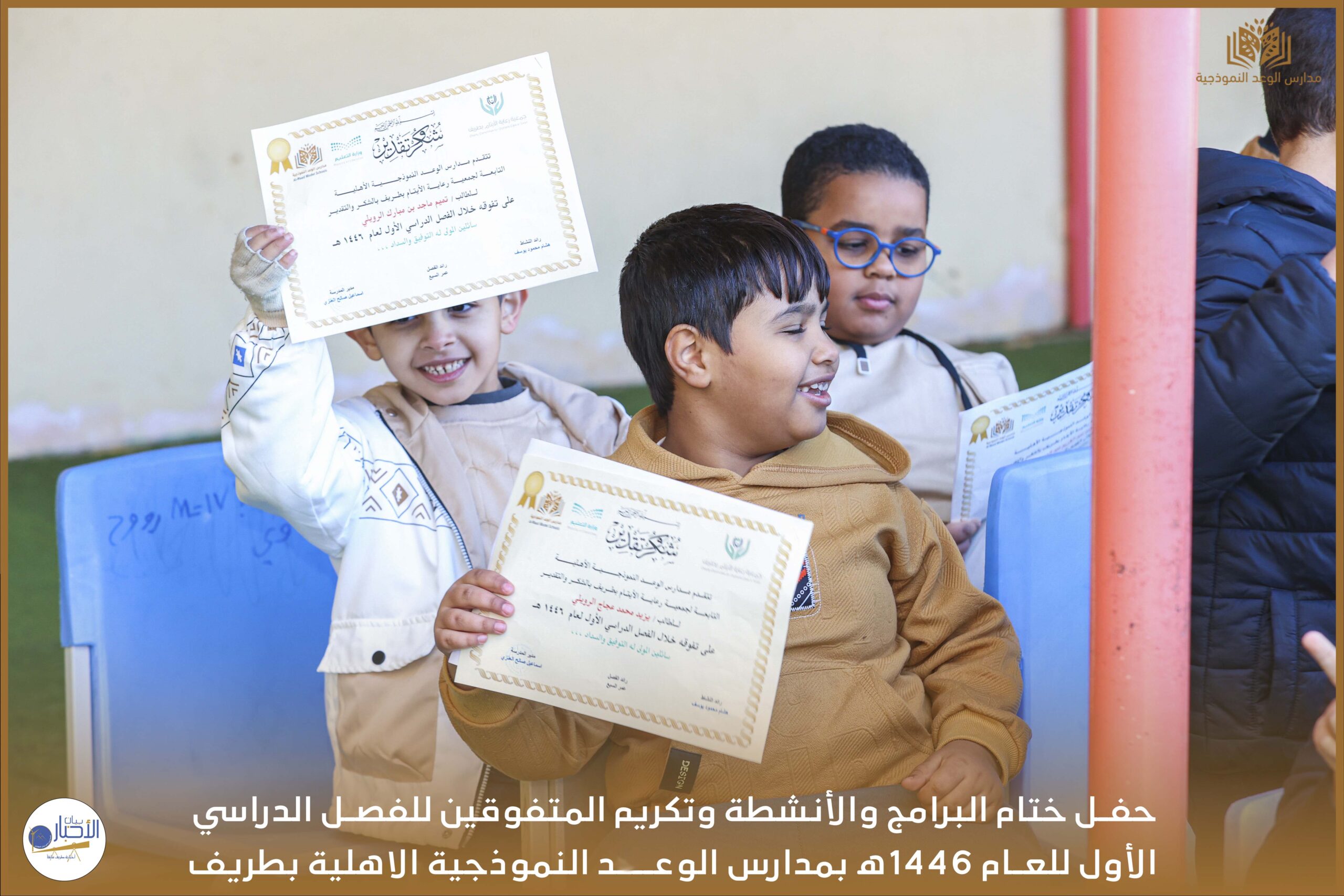 أقامت مدارس الوعد النموذجية الأهلية التابعة لجمعية رعاية الأيتام بمحافظة طريف ( القسم الابتدائي ) حفلًا ختاميًا للبرامج والأنشطة والفعاليات المقامة طيلة الفصل الدراسي الأول وذلك بحضور نائب رئيس مجلس إدارة جمعية رعاية الأيتام الأستاذ محمد سالم الرويلي والأستاذ طلال لهيلم العنزي ممثلًا عن مكتب تعليم طريف والسادة أولياء أمور الطلاب.