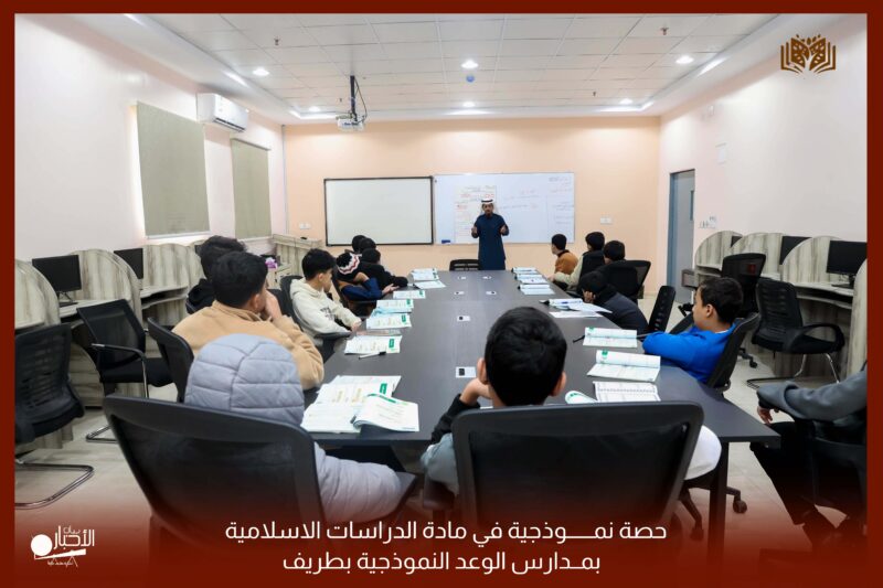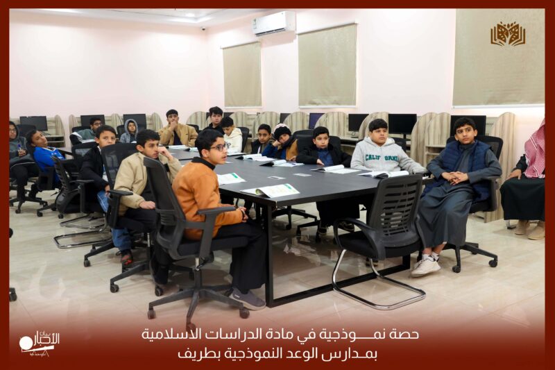 أقامت اليوم مدارس الوعد النموذجية (متوسط – ثانوي) حصة نموذجية في مادة الدراسات الإسلامية بعنون (الهداية إلى التوحيد) قدمها المعلم إبراهيم الشراري معلم الدراسات الاسلامية بالمدارس .