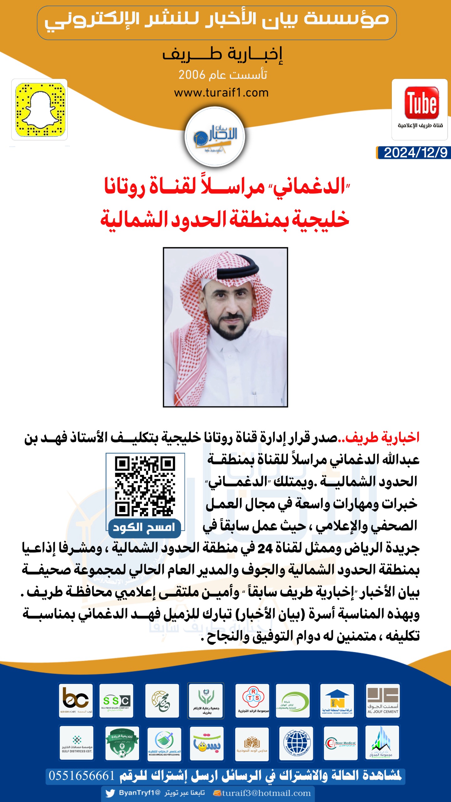 صدر قرار إدارة قناة روتانا خليجية بتكليف الأستاذ فهد بن عبدالله الدغماني مراسلاً للقناة بمنطقة الحدود الشمالية .