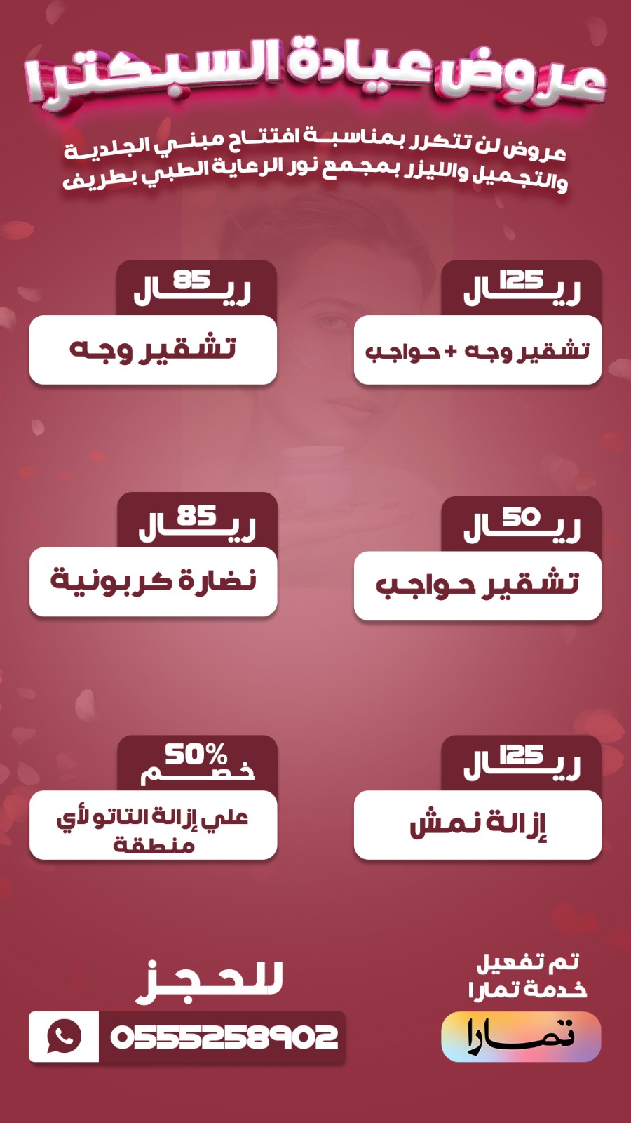 أعلن مجمع نور الرعاية الطبي بمحافظة طريف عن أقوى العروض التي لن تتكرر والمقدمة بمناسبة افتتاح مبنى الجلدية والتجميل والليزر ، وتشمل العروض تنظيف البشرة العميق بجهاز “الهيدروفيشال” ، والبوتوكس ، ، والفيلر، والتقشير، وإذابة الدقن المزدوج ، وجلسة البلازما والميزوثيرابي نضارة، وخيط شد الوجه ثلاثي الابعاد، وإزالة النمش ، وإزالة التاتو.