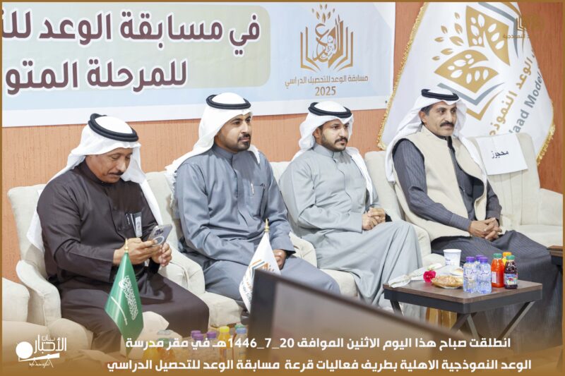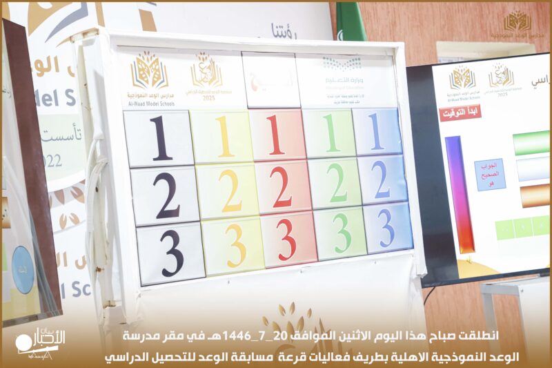 انطلقت صباح هذا اليوم الاثنين الموافق 20_7_1446هـ في مقر مدرسة الوعد النموذجية الأهلية بطريف فعاليات قرعة مسابقة الوعد للتحصيل الدراسي بنسختها الجديدة والمخصصة للمرحلة المتوسطة والتي تهدف إلى إثراء جوانب التحصيل الدراسي لدى الطلبة وإحياء المنافسة الشريفة فيما بينهم كما شهدت خوض ثلاث جولات تنافسية تأهل من خلالها ثلاثة فرق للتصفيات المؤهلة .