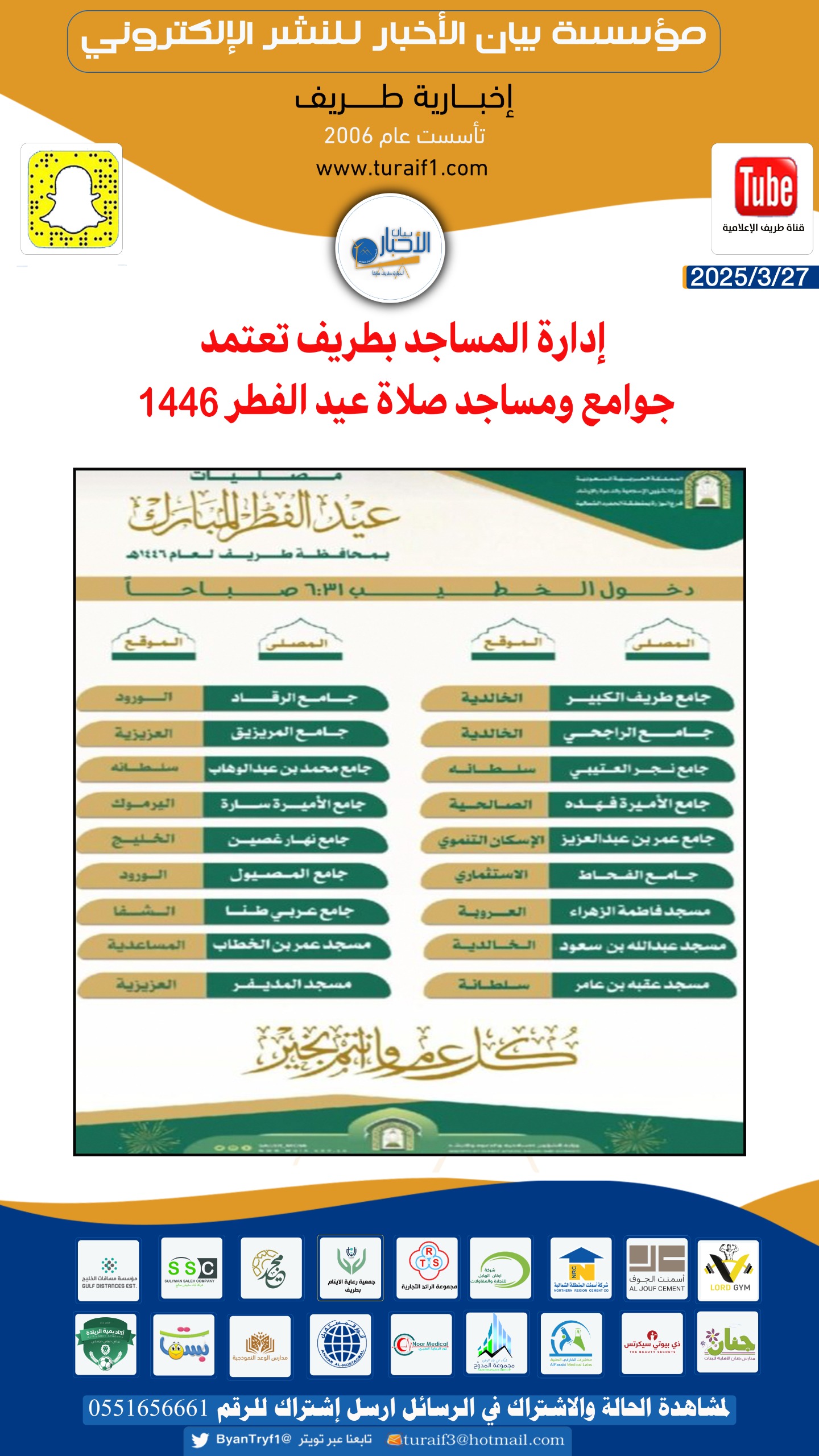 اعتمدت إدارة المساجد والدعوة والإرشاد في محافظة طريف إقامة صلاة عيد الفطر المبارك في عدد من المصليات والجوامع وهم 18 جامعًا، وهي: جامع طريف الكبير بالخالدية وجامع الرقاد بالورود وجامع الراجحي بالخالدية وجامع المريزيق بالعزيزية وجامع نجر العتيبي بسلطانة وجامع محمد بن عبد الوهاب بسلطانه وجامع الأميرة فهدة بالصالحية وجامع الأميرة سارة باليرموك وجامع عمر بن عبد العزيز بالإسكان التنموي وجامع نهار غصين بالخليج وجامع الفحاط بالاستثماري وجامع المصيول باالورود ومسجد فاطمة الزهراء بالعروبة وجامع عربي طنا بالشفا ومسجد عبدالله بن سعود بالخالدية ومسجد عمر بن الخطاب بالمساعدية ومسجد عقبه بن عامر بسلطانة ومسجد المديفر بالعزيزية