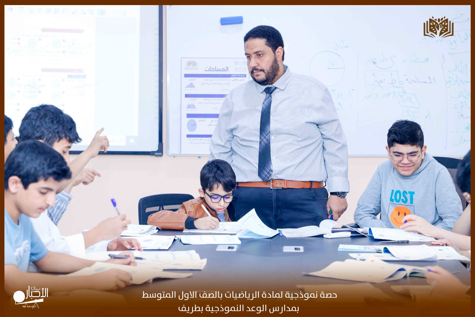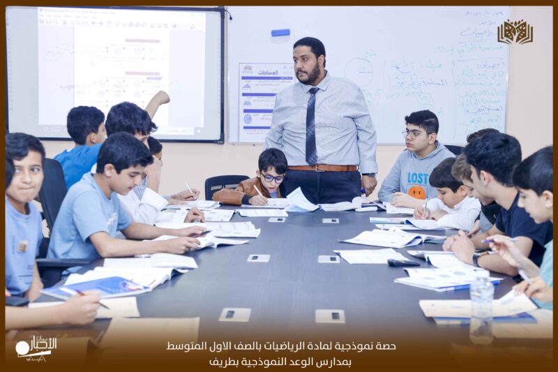 اقيمت اليوم الاحد الموافق ٢٩ من شوال ١٤٤٦ بمدارس الوعد النموذجية بمحافظة طريف حصة نموذجية لمادة الرياضيات بالصف الاول المتوسط عن درس (مساحة الدائرة) اداء المعلم مصطفى احمد معلم الرياضيات بالمدرسة استعمل فيها استراتيجيات التعلم النشط (حل المشكلات. العصف الذهني و المناقشة والحوار) مع عرض لوحة موضحة للدرس واستعمال احدث الوسائل التعليمية.