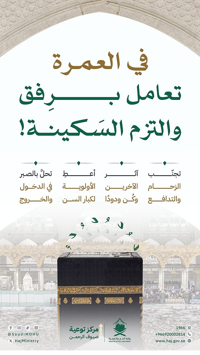 وجاء في الرسالة: “العمرة رحلة صبر ويقين، تحلَّ فيها بالسكينة، وعامل الآخرين بالإيثار، كي تنال الرضا والتيسير.”