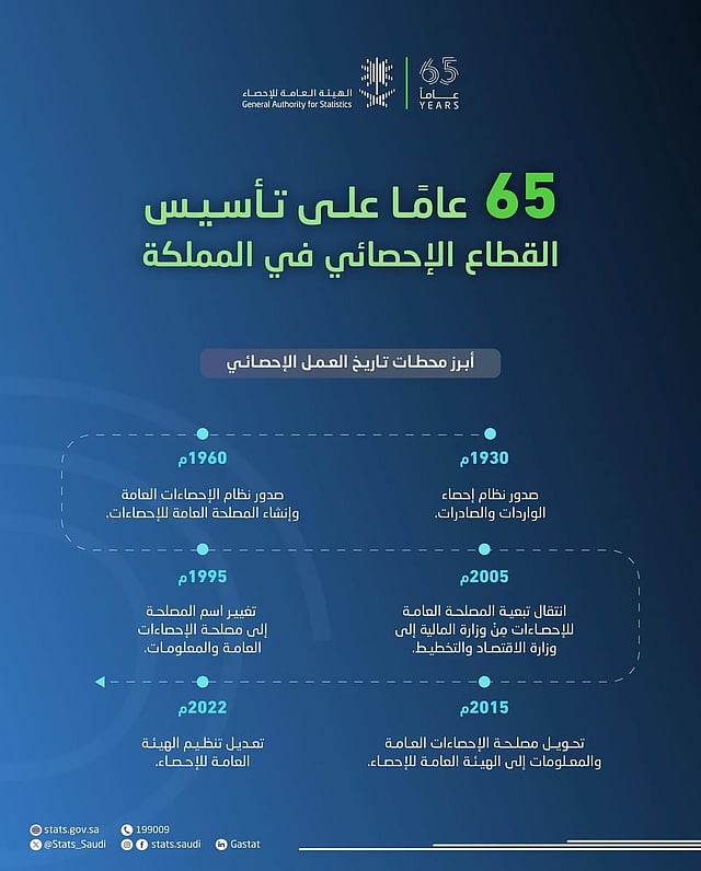 تحتفي الهيئة العامة للإحصاء بمرور 65 عامًا على انطلاق العمل الإحصائي الرسمي في المملكة العربية السعودية، حيث تأسس القطاع بموجب المرسوم الملكي الكريم رقم (23) الصادر بتاريخ 7/12/1379هـ الموافق 1/6/1960م، الذي شكّل حجر الأساس لبناء منظومة الإحصاءات الوطنية، وأسهم بشكل محوري في دعم الخطط التنموية والسياسات الاقتصادية والاجتماعية. وتضمن المرسوم حينها إصدار نظام الإحصاءات، الذي نص على إنشاء “مصلحة الإحصاءات العامة” كجهاز رسمي معني بالبيانات.