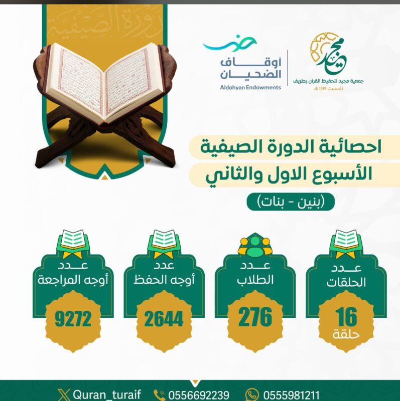 وشملت الدورة الصيفية للأسبوع الأول والثاني (بنين – بنات) 16 حلقة وكان عدد الطلاب 276 وعدد الأوجه الحفظ 2644 وعدد أوجة المراجعة 9272 .