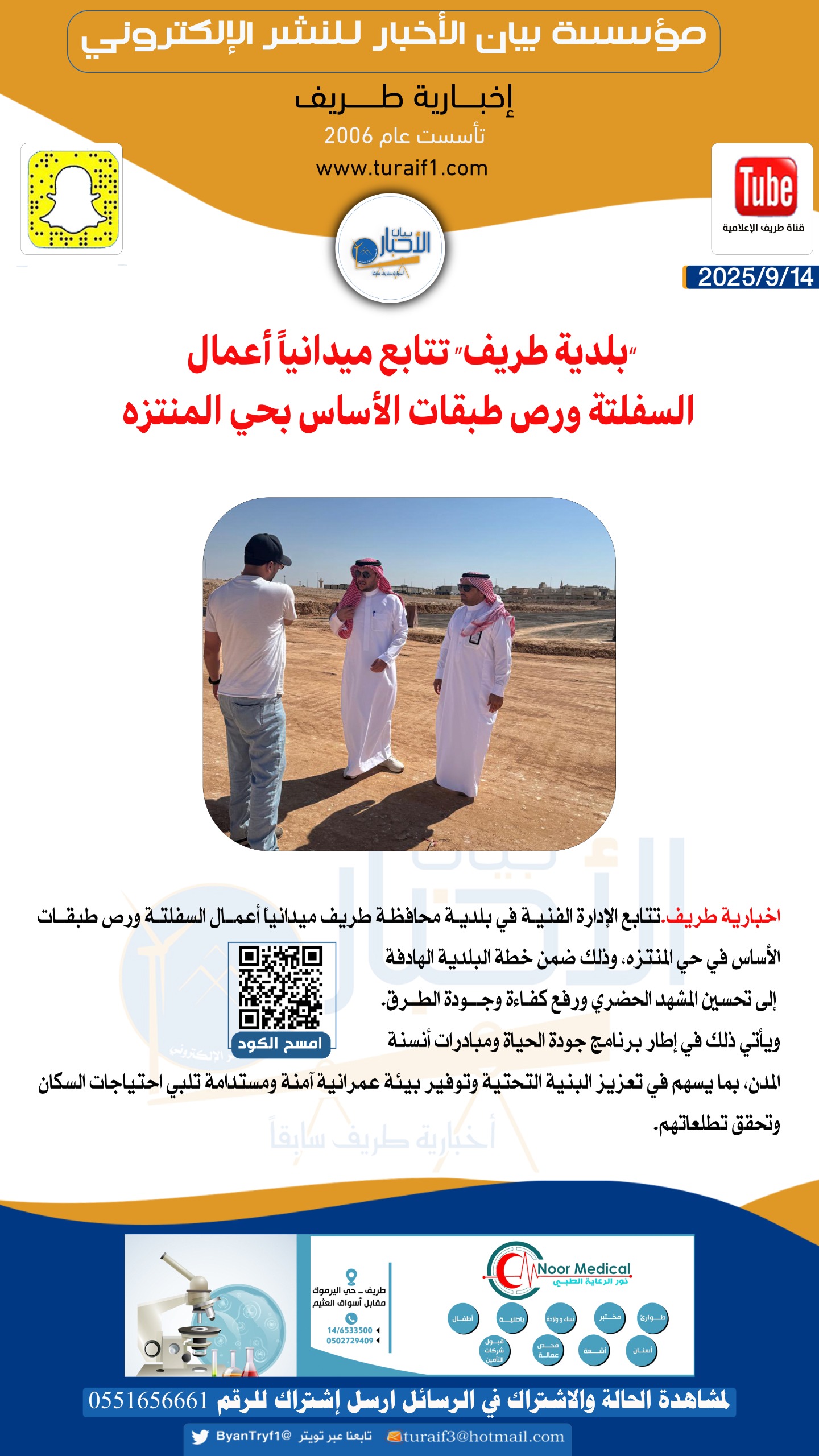 تتابع الإدارة الفنية في بلدية محافظة طريف ميدانياً أعمال السفلتة ورص طبقات الأساس في حي المنتزه، وذلك ضمن خطة البلدية الهادفة إلى تحسين المشهد الحضري ورفع كفاءة وجودة الطرق.