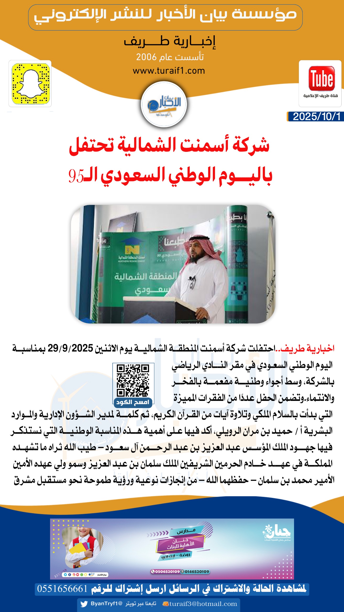 أخبار طريف > بالصور .. شركة أسمنت الشمالية تحتفل باليوم الوطني السعودي الـ95