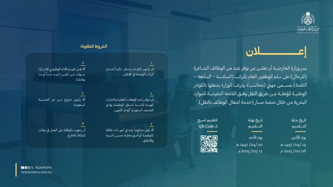 أعلنت وزارة الخارجية عن توفر عدد من الوظائف الشاغرة للرجال على سلم الموظفين العام بالمراتب (السادسة والسابعة والثامنة) لشغلها بالكوادر الوطنية المؤهلة عن طريق النقل وفق اللائحة التنفيذية للموارد البشرية من خلال منصة مسار.