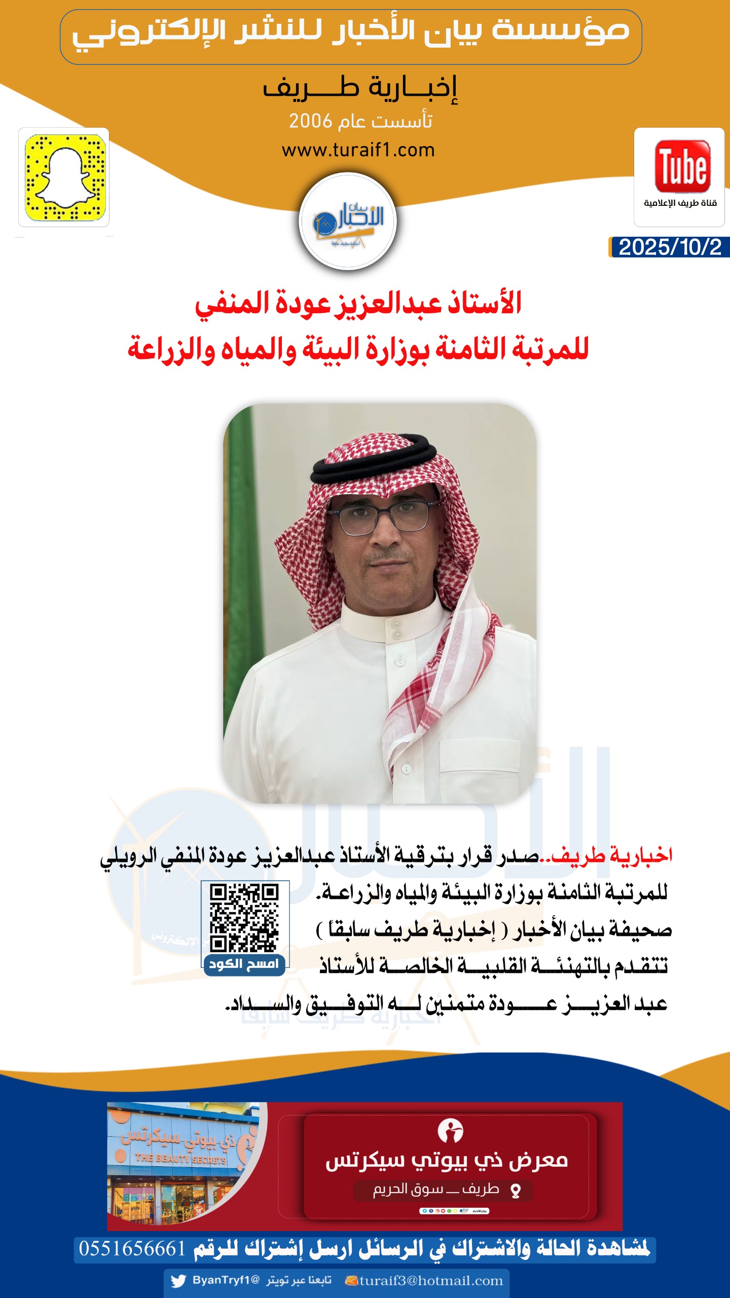 صحيفة بيان الأخبار ( إخبارية طريف سابقاً ) تتقدم بالتهنئة القلبية الخالصة للأستاذ عبد العزيز عودة متمنين له التوفيق والسداد.
