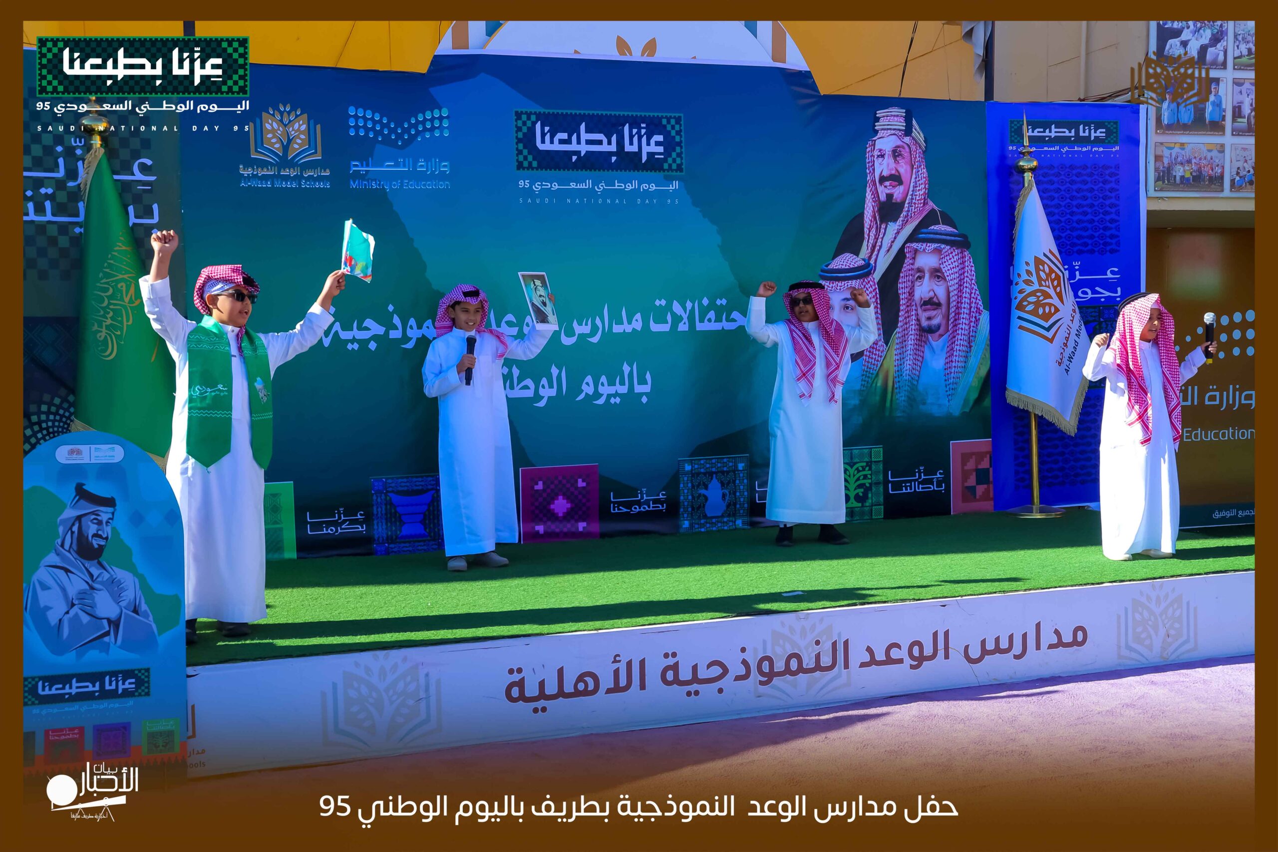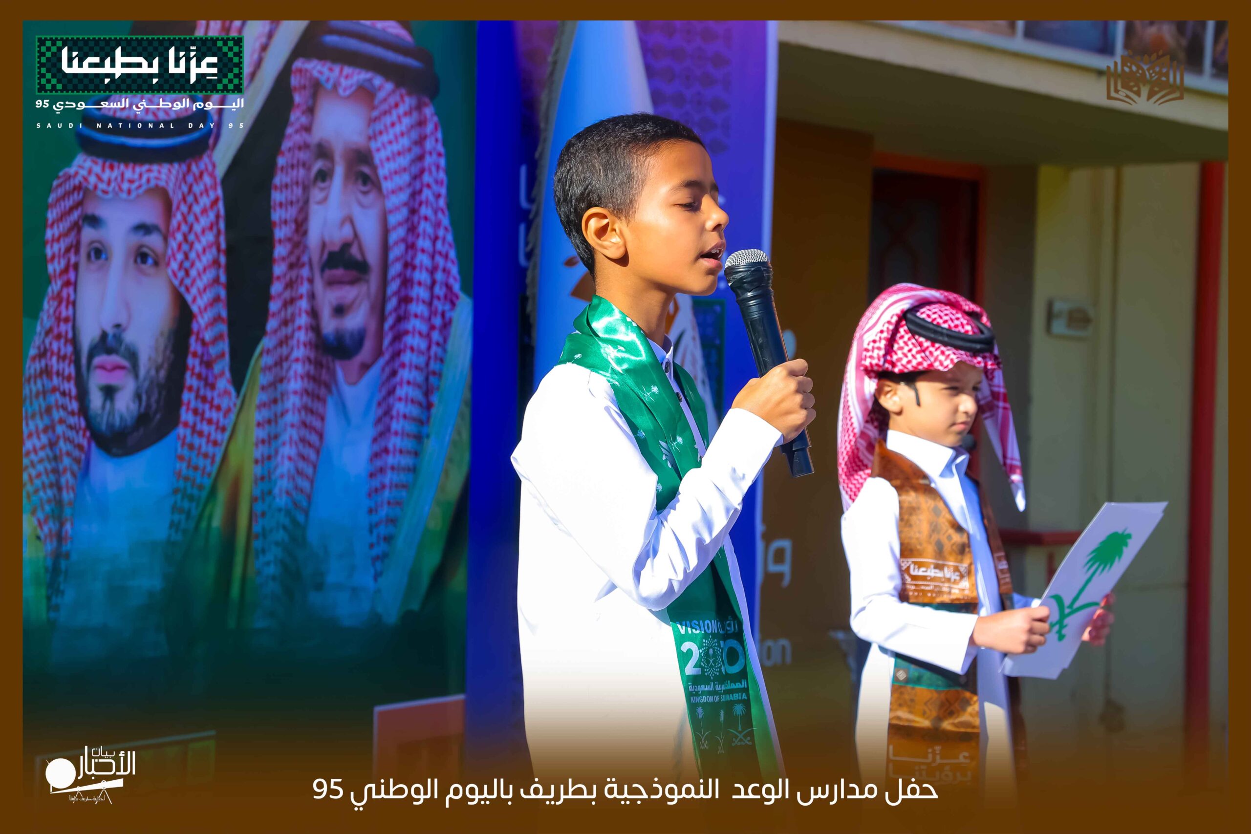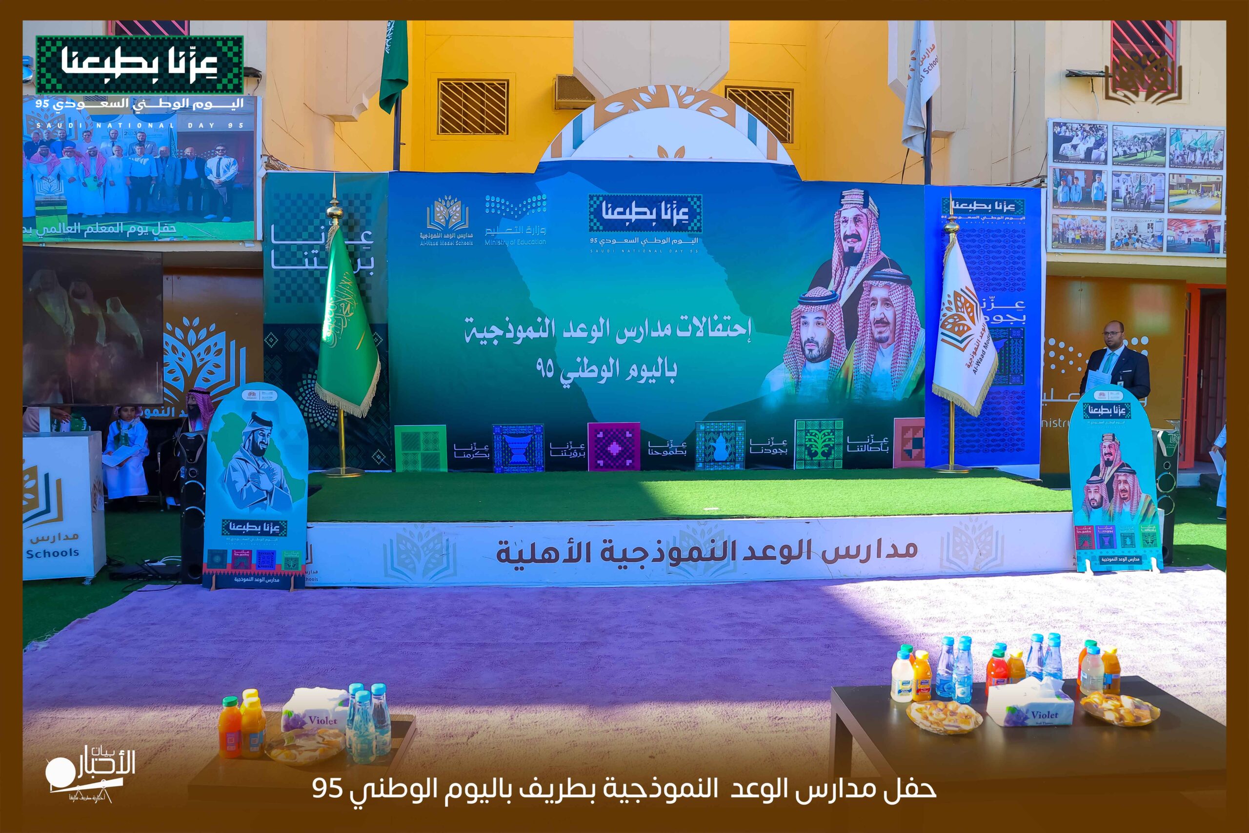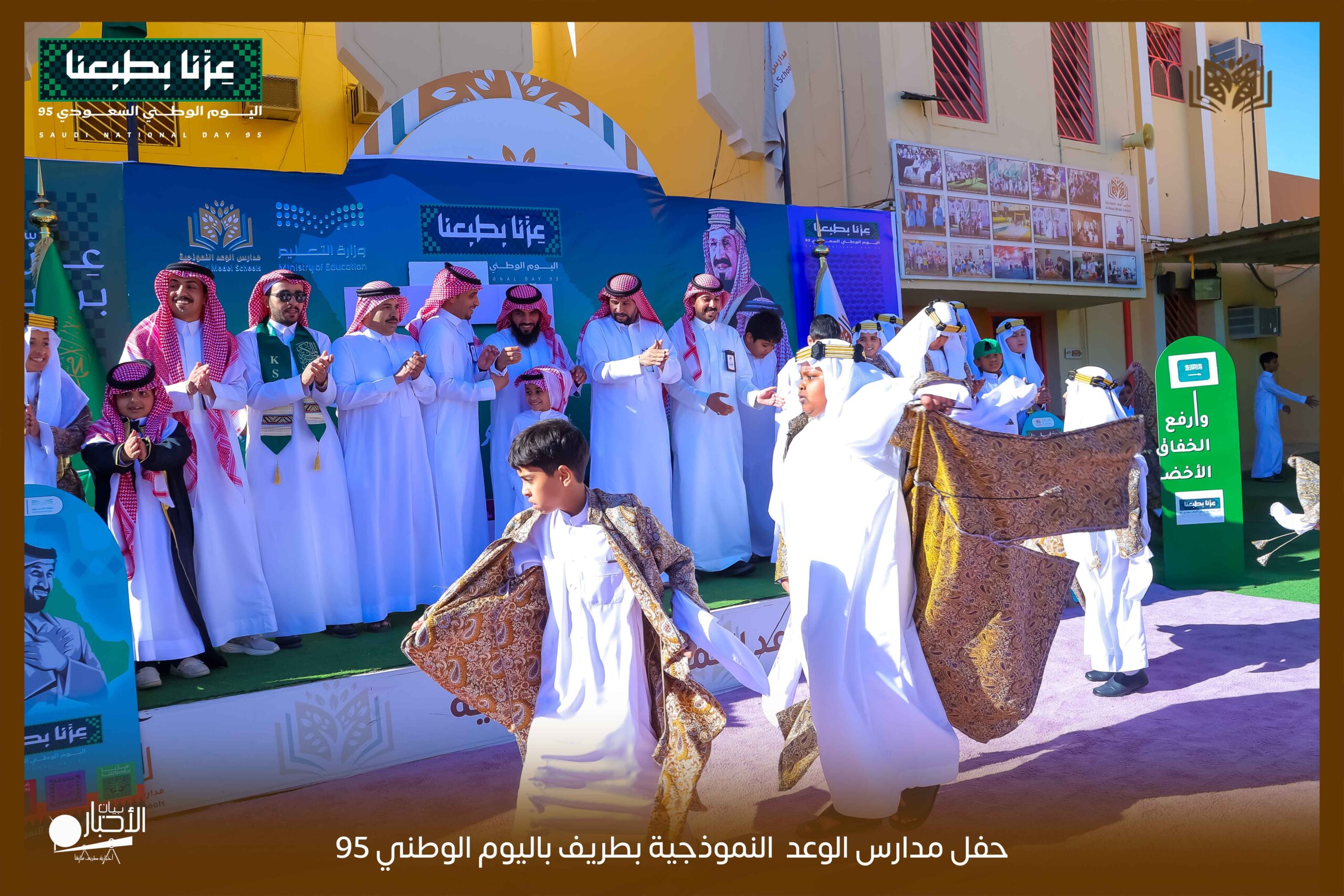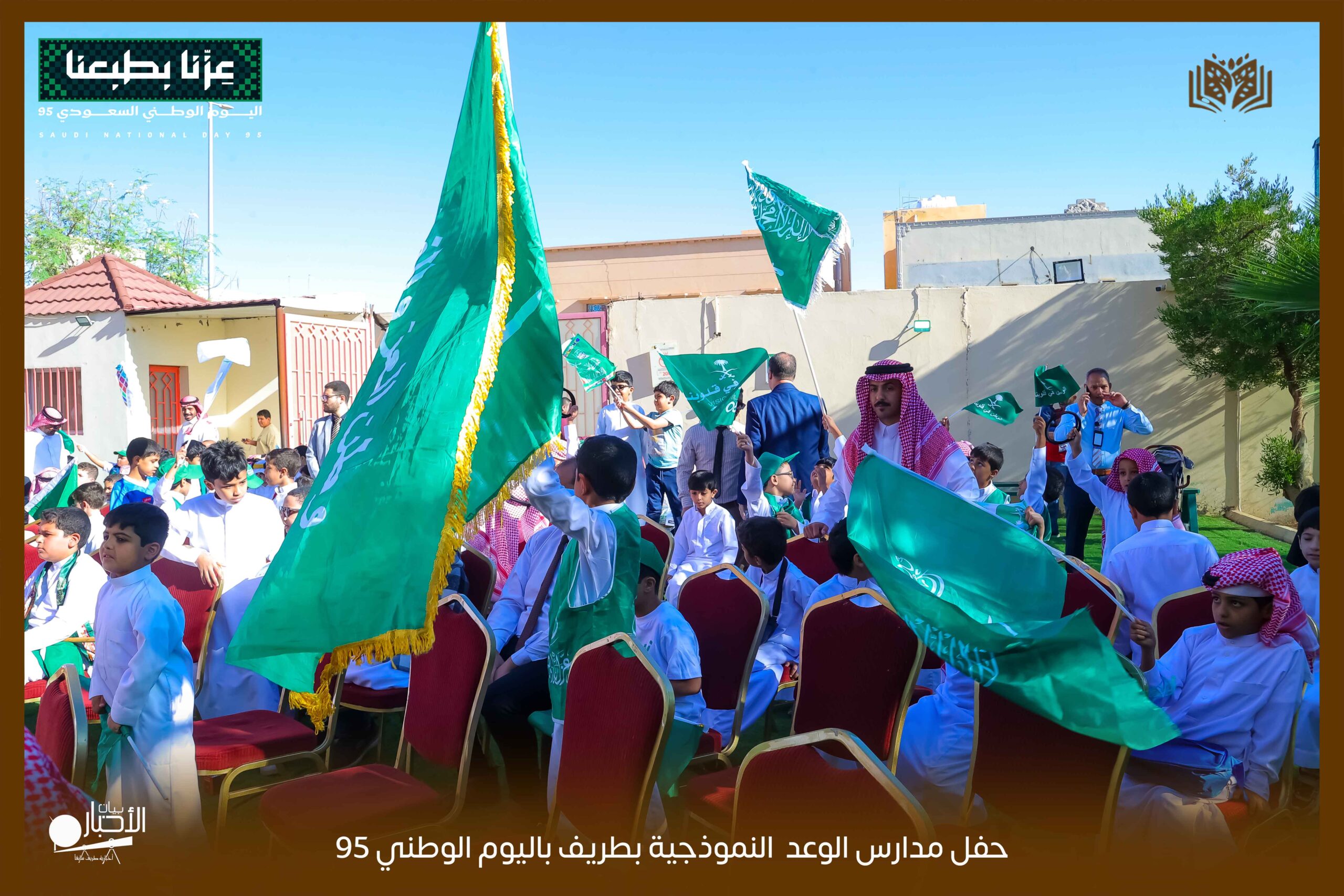 أقامت مدارس الوعد النموذجية الأهلية حفلًا بمناسبة ذكرى( اليوم الوطني السعودي ٩٥ ) ، تلك الذكرى التي تجعلنا نشعر بالاعتزاز والفخر بالانتماء لهذا الوطن العظيم ، حيث بدأ الحفل بعرض السلام الملكي ثم آيات عطرة من الذكر الحكيم ثم كلمة مدير المدرسة الأستاذ إسماعيل صالح العنزي والذي رحب بالسادة الضيوف وأولياء الأمور وتقديم التهنئة للقيادة الحكيمة والشعب السعودي بهذه المناسبة ،ثم تتابعت فقرات الحفل ما بين مشهد لملوك المملكة وعرض مسرحي بعنوان ( عزنا بطبعنا ) ثم فقرة باللغة الإنجليزية في حب الوطن ثم ختم الحفل بأداء الطلاب للعارضة السعودية ٠