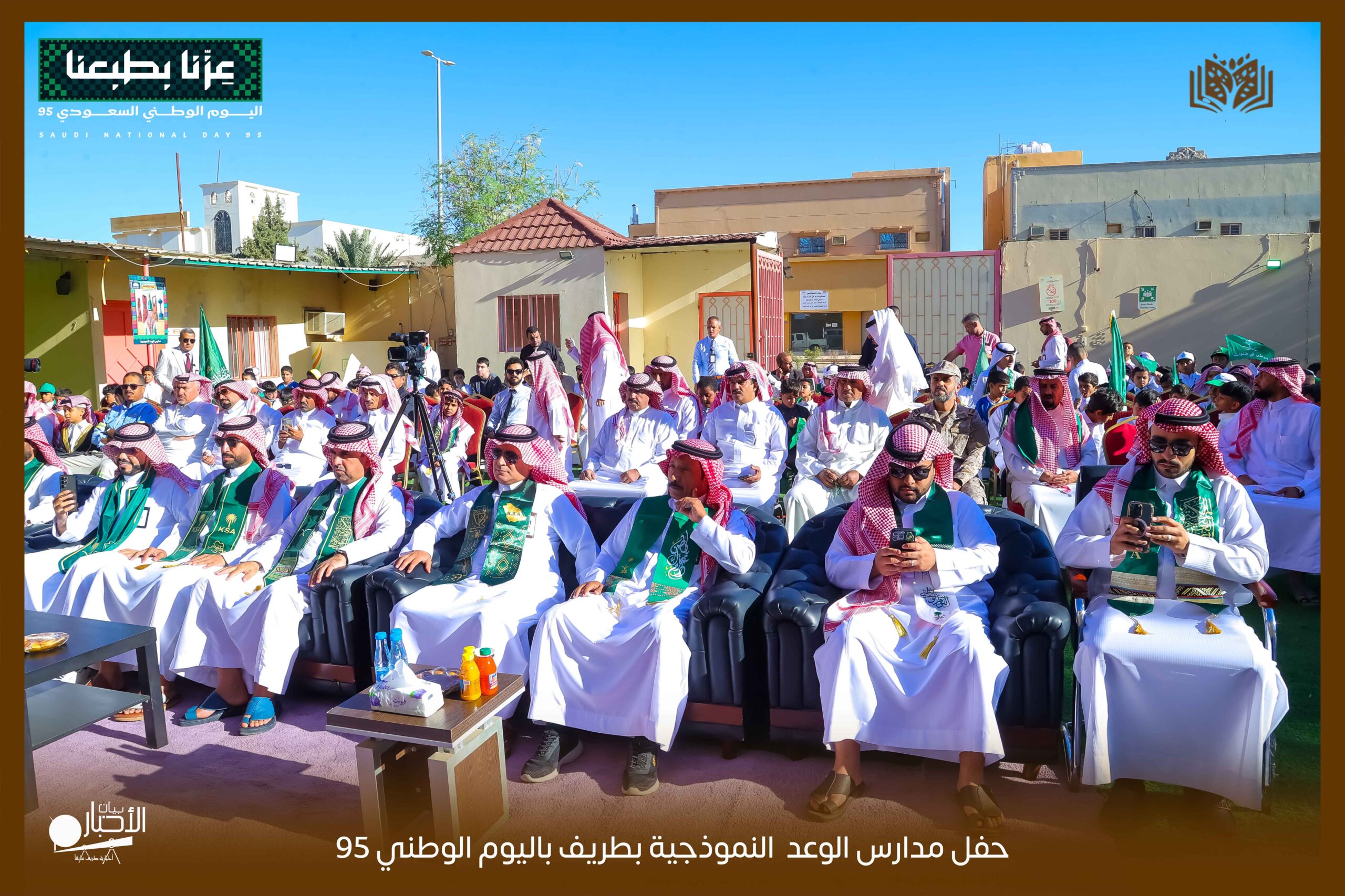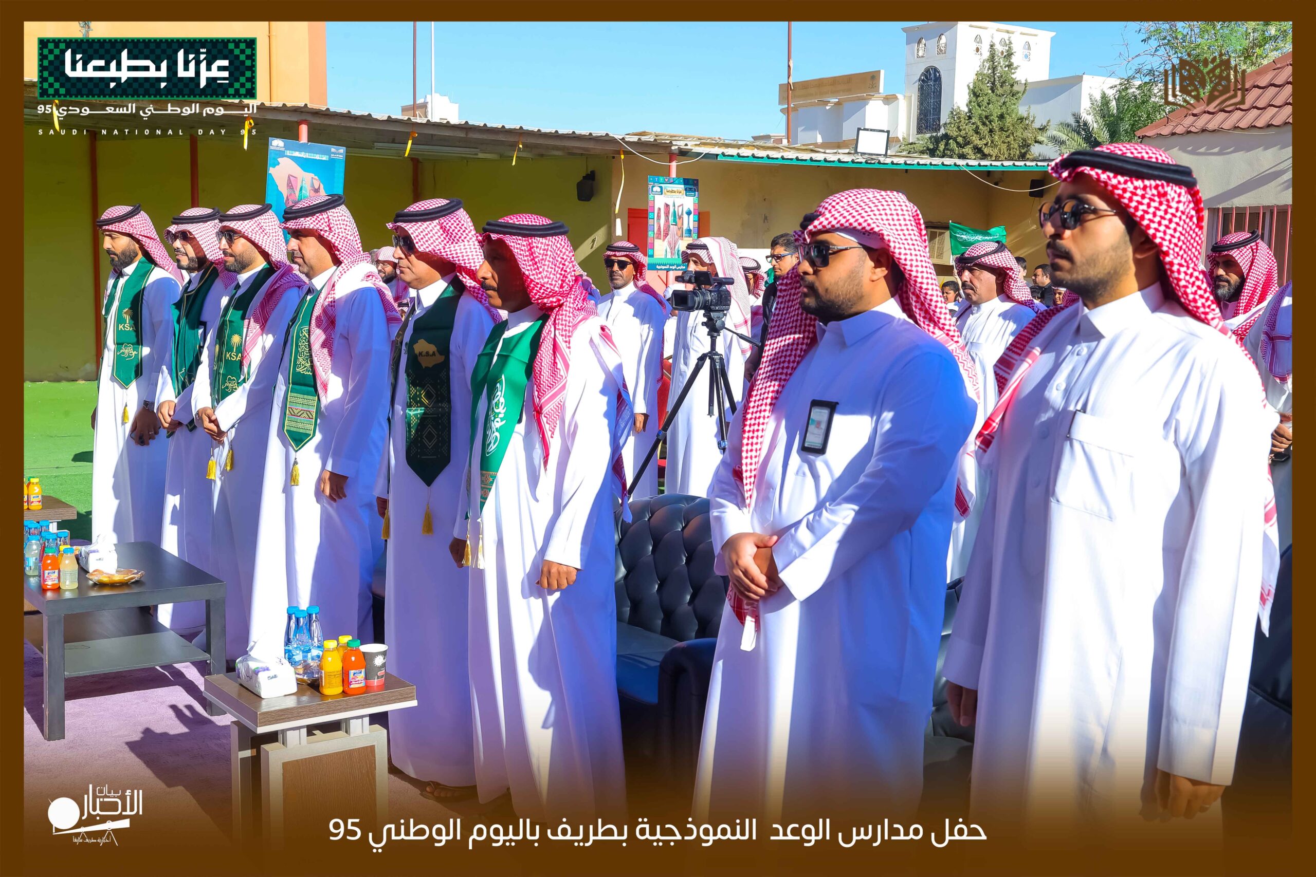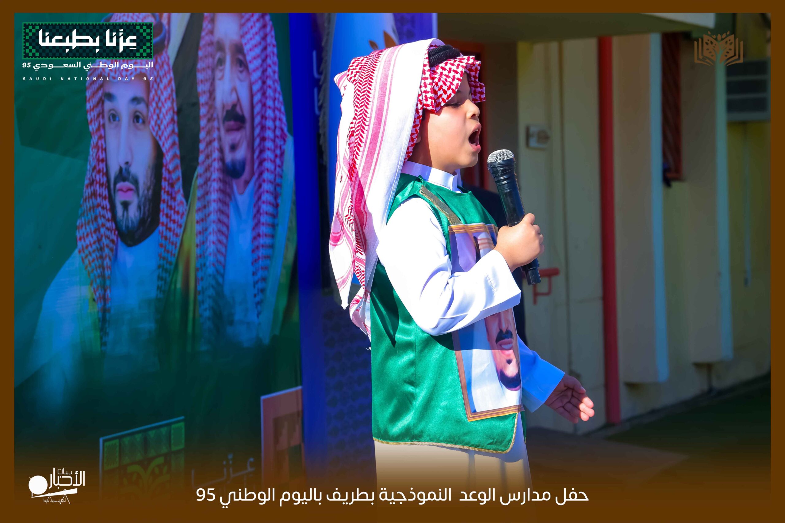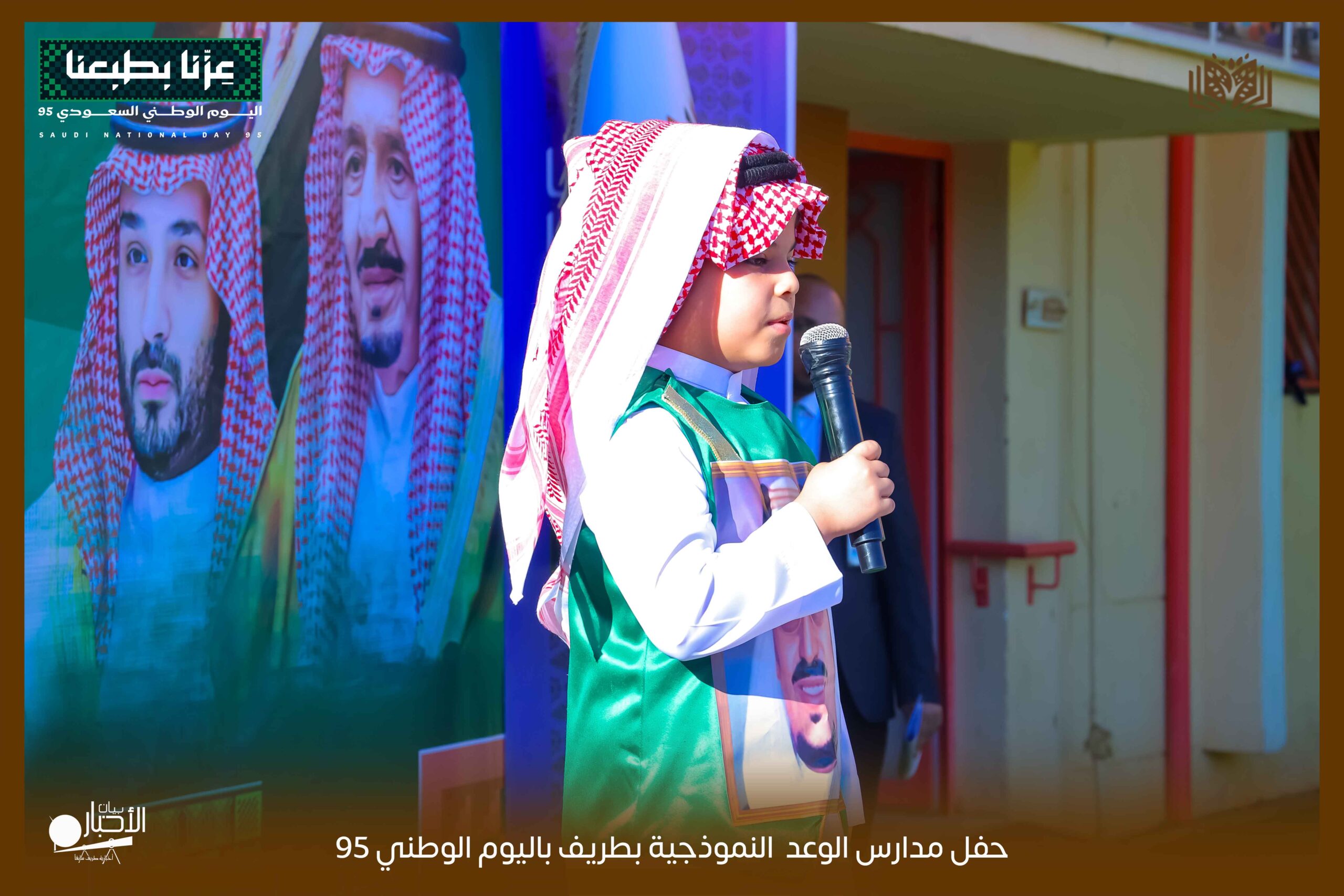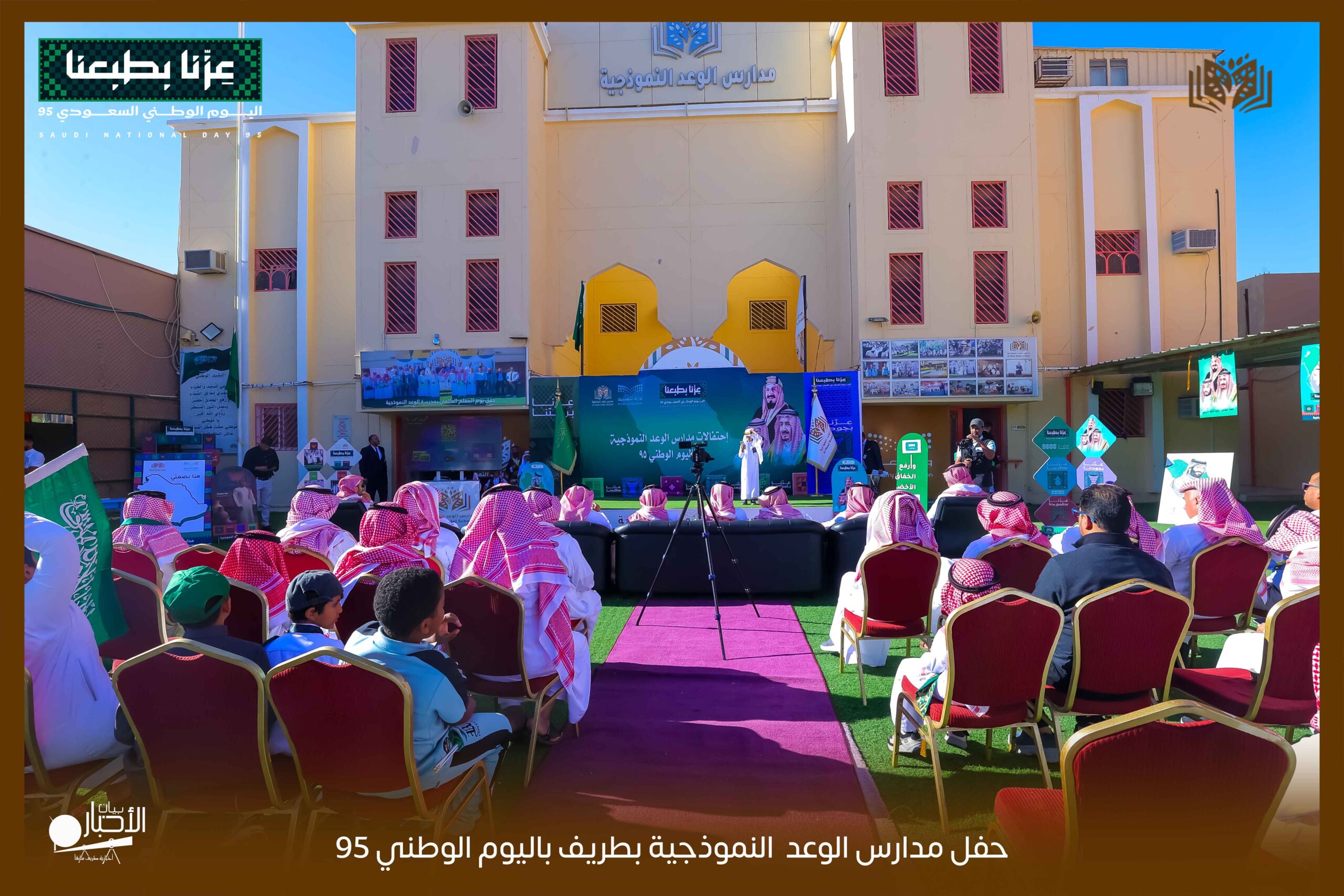 أقامت مدارس الوعد النموذجية الأهلية حفلًا بمناسبة ذكرى( اليوم الوطني السعودي ٩٥ ) ، تلك الذكرى التي تجعلنا نشعر بالاعتزاز والفخر بالانتماء لهذا الوطن العظيم ، حيث بدأ الحفل بعرض السلام الملكي ثم آيات عطرة من الذكر الحكيم ثم كلمة مدير المدرسة الأستاذ إسماعيل صالح العنزي والذي رحب بالسادة الضيوف وأولياء الأمور وتقديم التهنئة للقيادة الحكيمة والشعب السعودي بهذه المناسبة ،ثم تتابعت فقرات الحفل ما بين مشهد لملوك المملكة وعرض مسرحي بعنوان ( عزنا بطبعنا ) ثم فقرة باللغة الإنجليزية في حب الوطن ثم ختم الحفل بأداء الطلاب للعارضة السعودية ٠