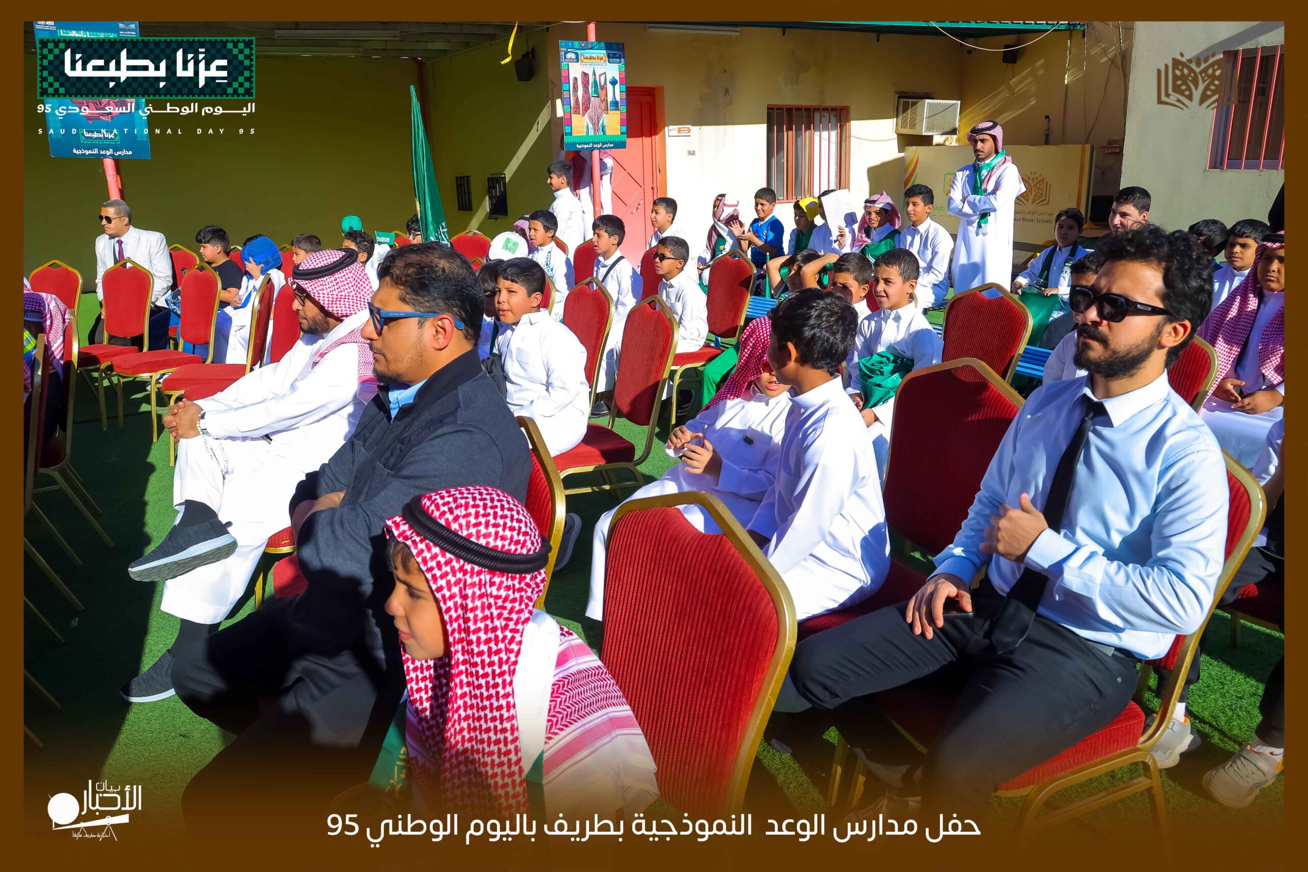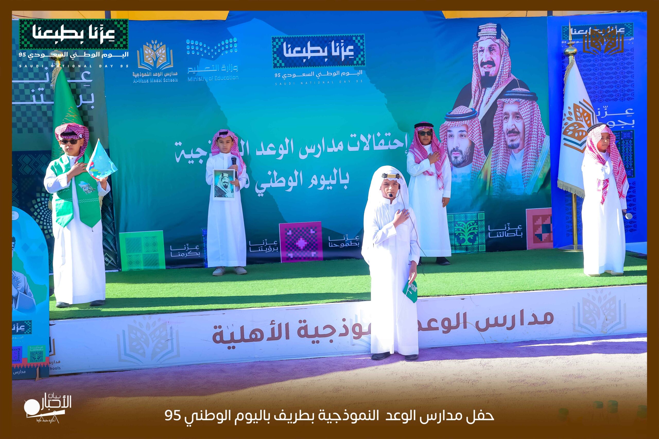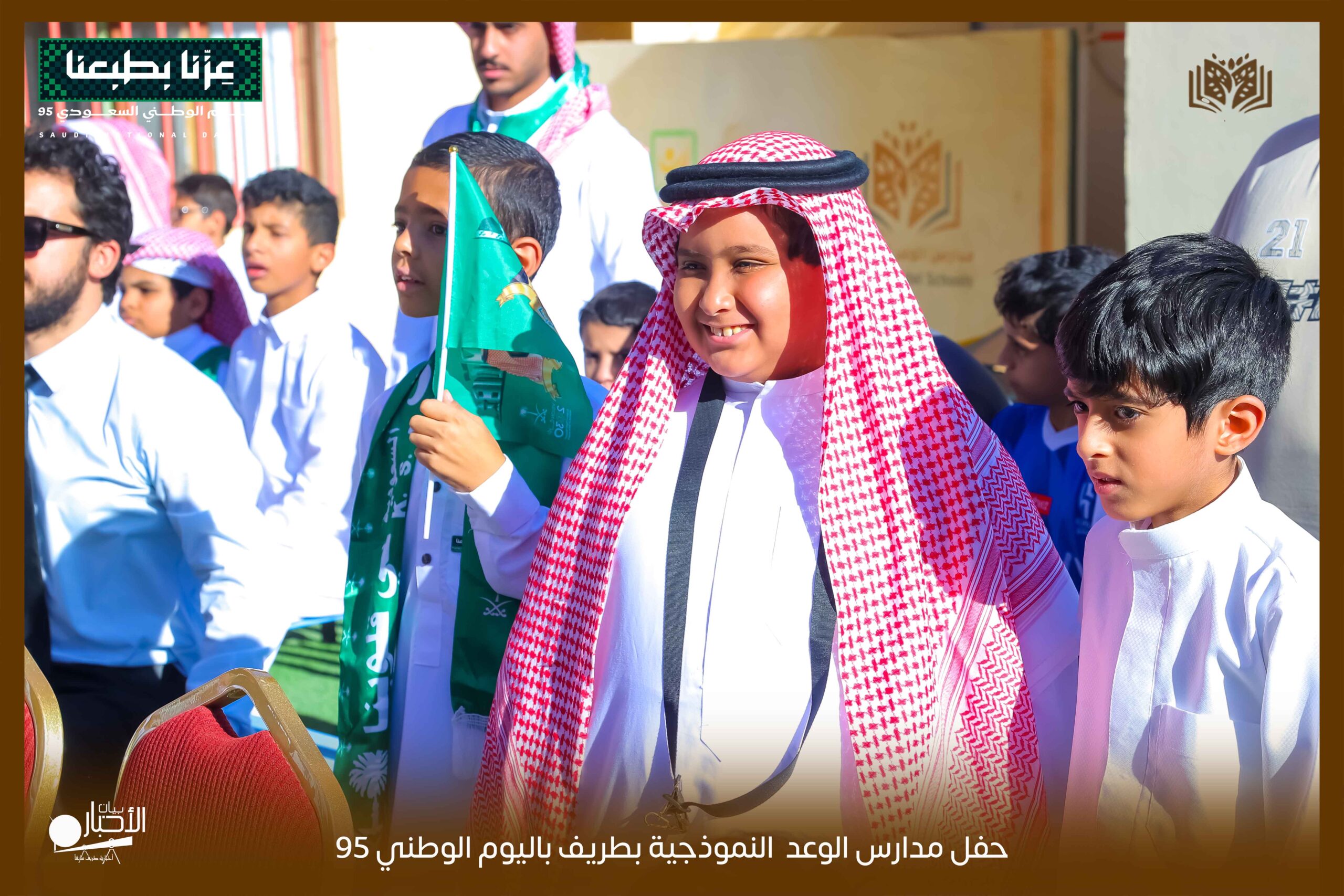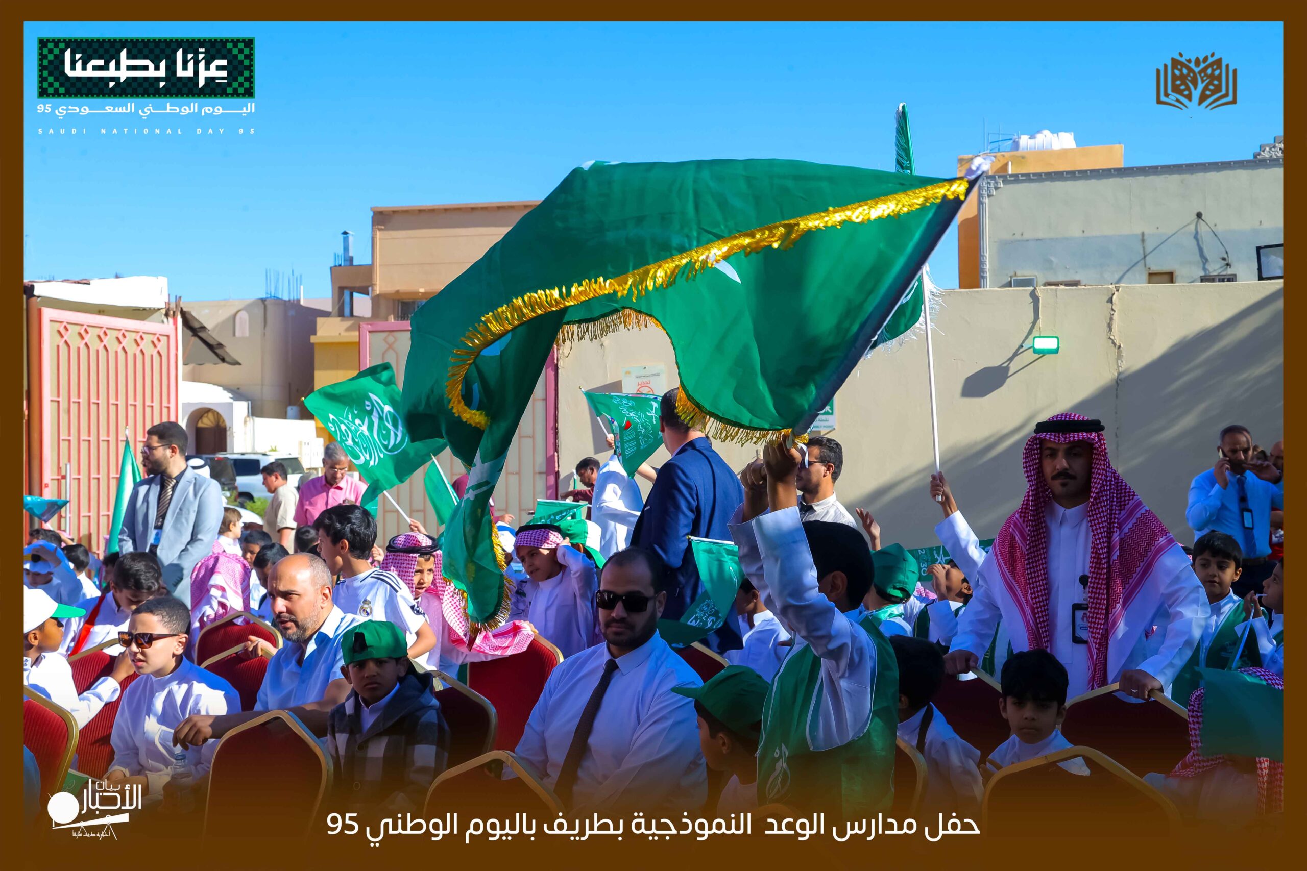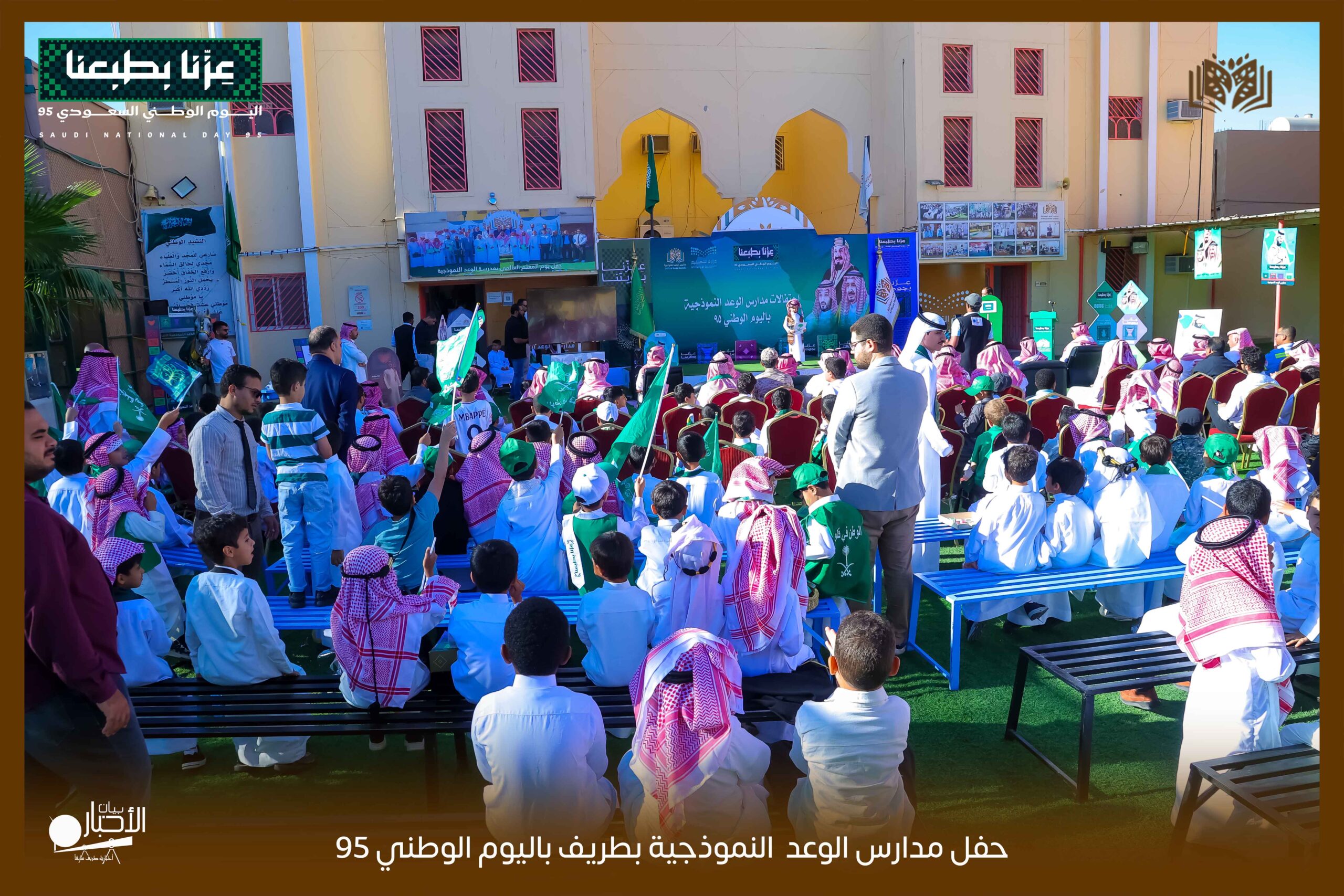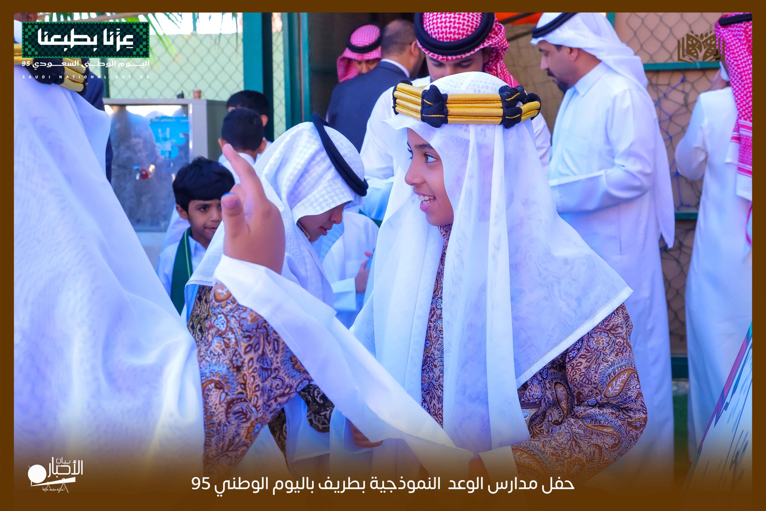 أقامت مدارس الوعد النموذجية الأهلية حفلًا بمناسبة ذكرى( اليوم الوطني السعودي ٩٥ ) ، تلك الذكرى التي تجعلنا نشعر بالاعتزاز والفخر بالانتماء لهذا الوطن العظيم ، حيث بدأ الحفل بعرض السلام الملكي ثم آيات عطرة من الذكر الحكيم ثم كلمة مدير المدرسة الأستاذ إسماعيل صالح العنزي والذي رحب بالسادة الضيوف وأولياء الأمور وتقديم التهنئة للقيادة الحكيمة والشعب السعودي بهذه المناسبة ،ثم تتابعت فقرات الحفل ما بين مشهد لملوك المملكة وعرض مسرحي بعنوان ( عزنا بطبعنا ) ثم فقرة باللغة الإنجليزية في حب الوطن ثم ختم الحفل بأداء الطلاب للعارضة السعودية ٠