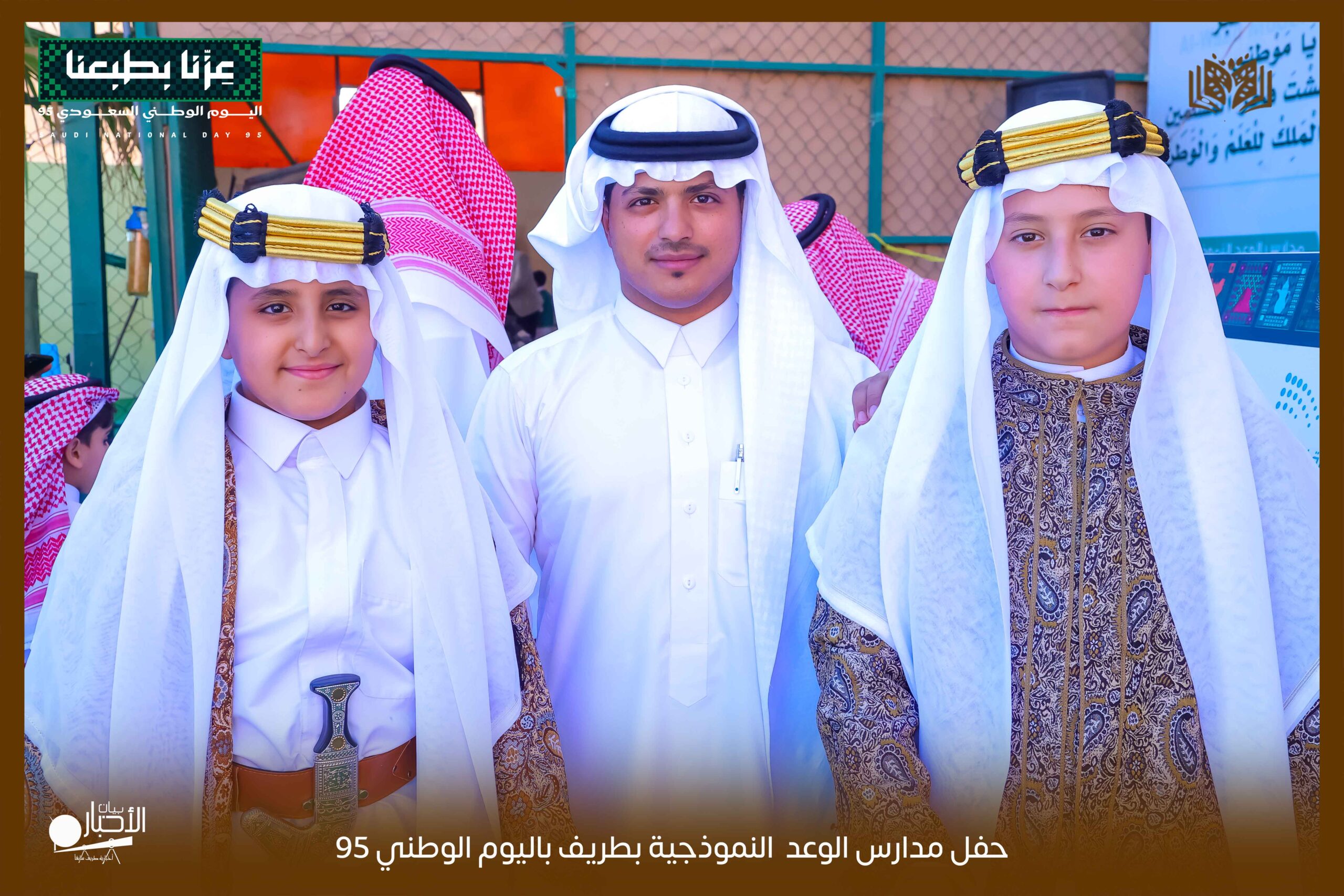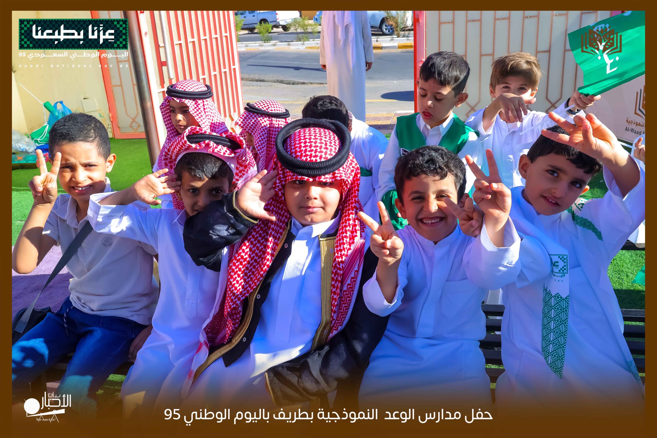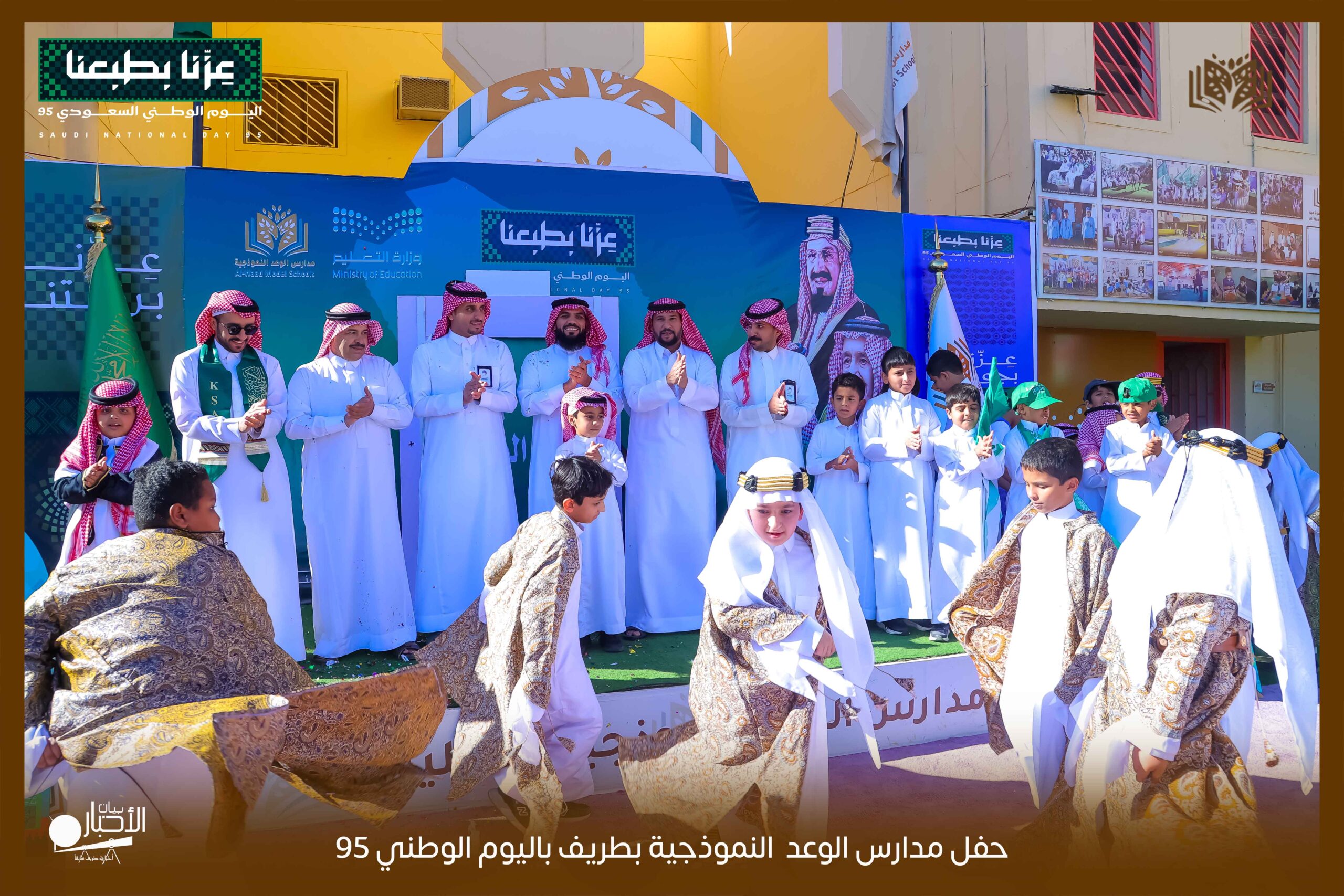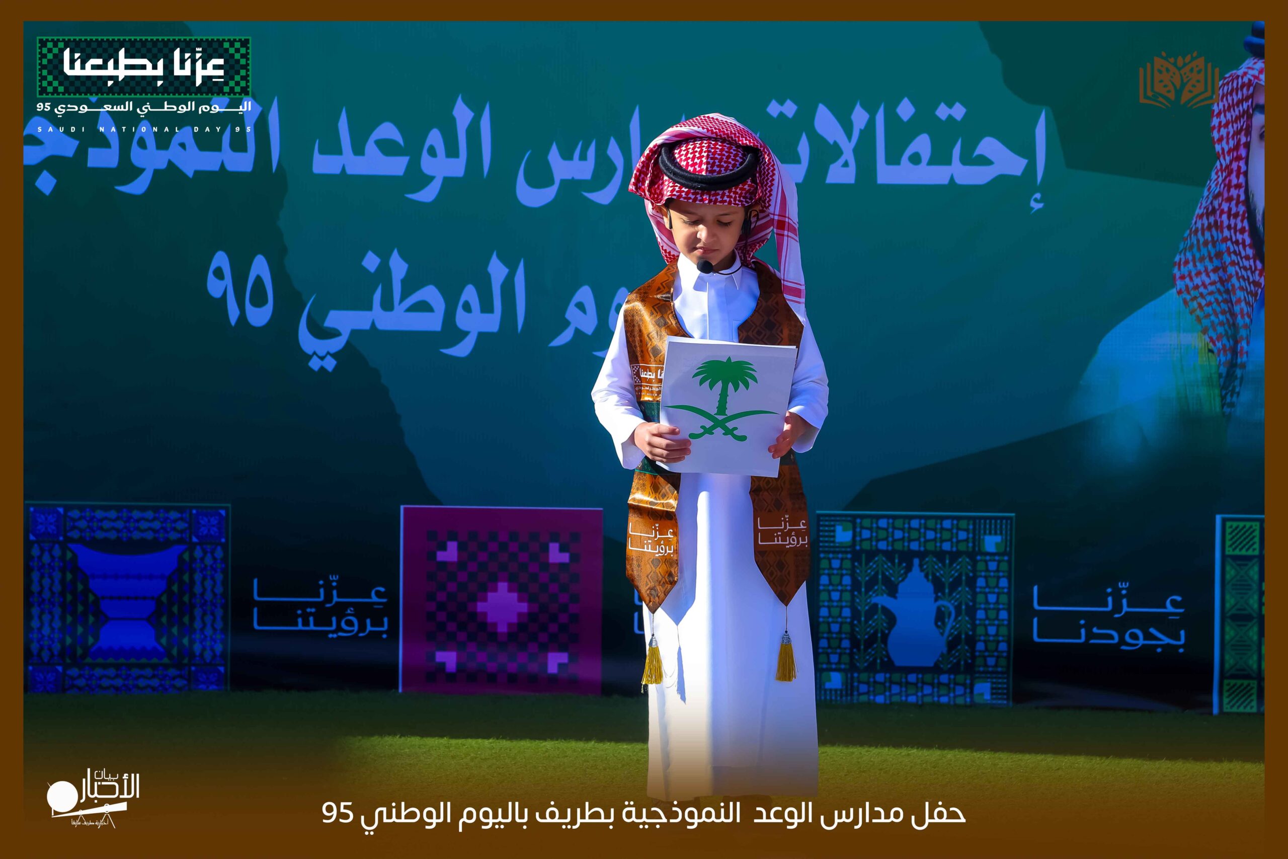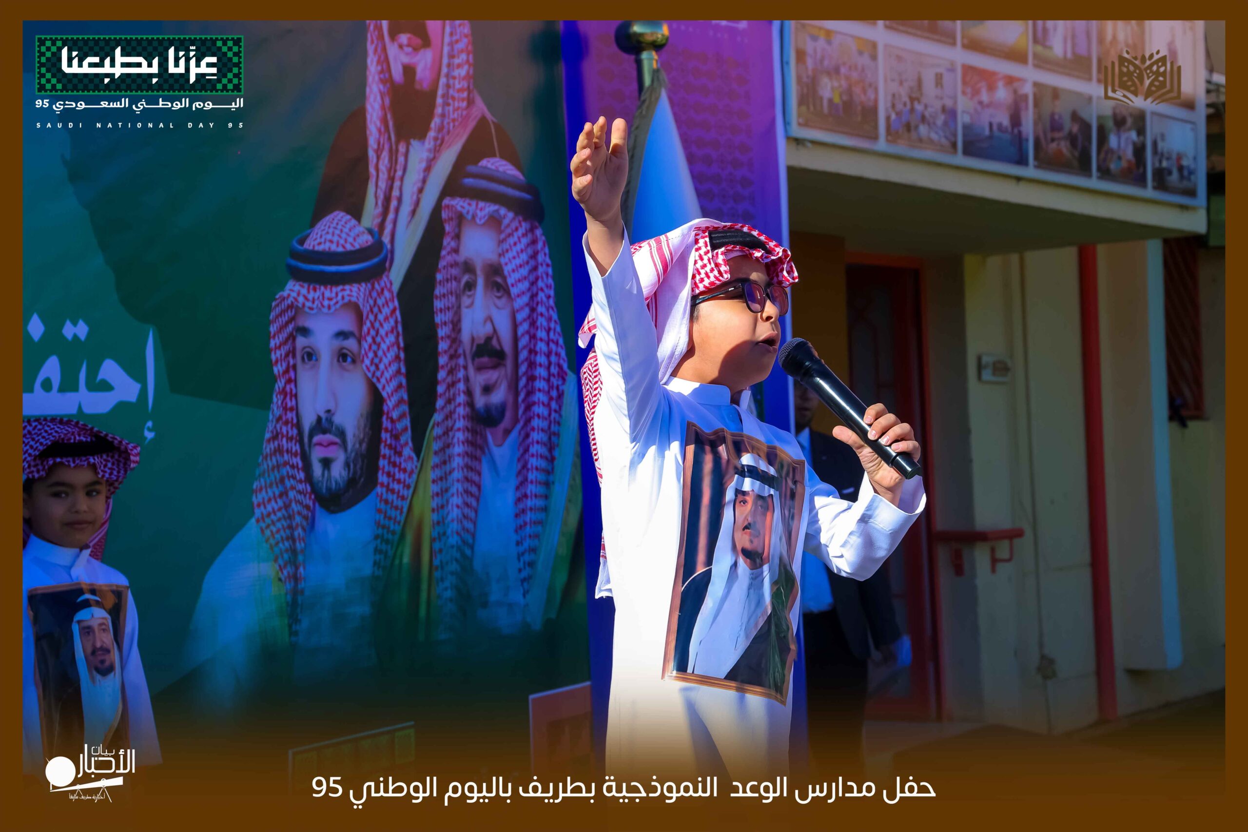 أقامت مدارس الوعد النموذجية الأهلية حفلًا بمناسبة ذكرى( اليوم الوطني السعودي ٩٥ ) ، تلك الذكرى التي تجعلنا نشعر بالاعتزاز والفخر بالانتماء لهذا الوطن العظيم ، حيث بدأ الحفل بعرض السلام الملكي ثم آيات عطرة من الذكر الحكيم ثم كلمة مدير المدرسة الأستاذ إسماعيل صالح العنزي والذي رحب بالسادة الضيوف وأولياء الأمور وتقديم التهنئة للقيادة الحكيمة والشعب السعودي بهذه المناسبة ،ثم تتابعت فقرات الحفل ما بين مشهد لملوك المملكة وعرض مسرحي بعنوان ( عزنا بطبعنا ) ثم فقرة باللغة الإنجليزية في حب الوطن ثم ختم الحفل بأداء الطلاب للعارضة السعودية ٠