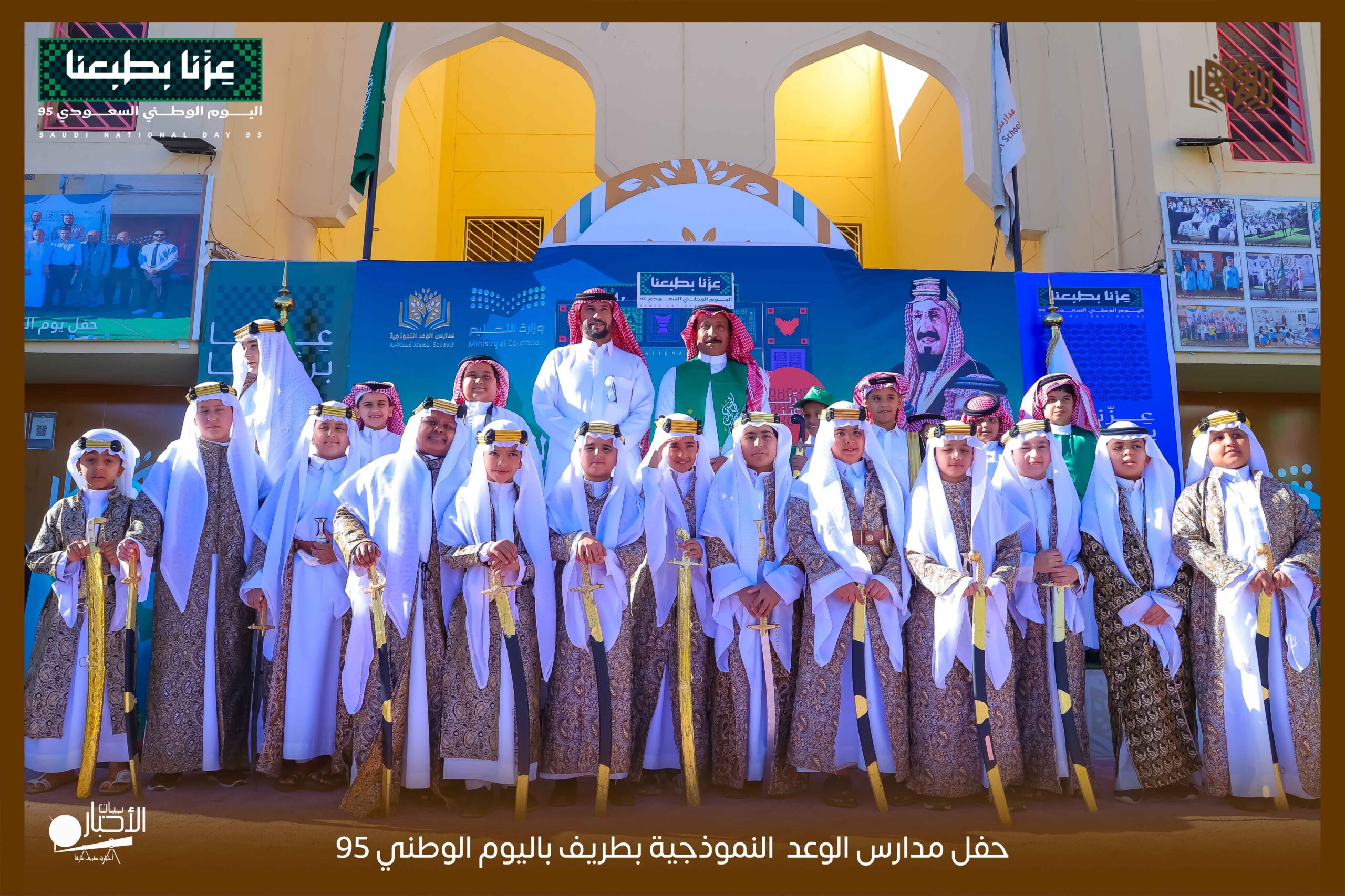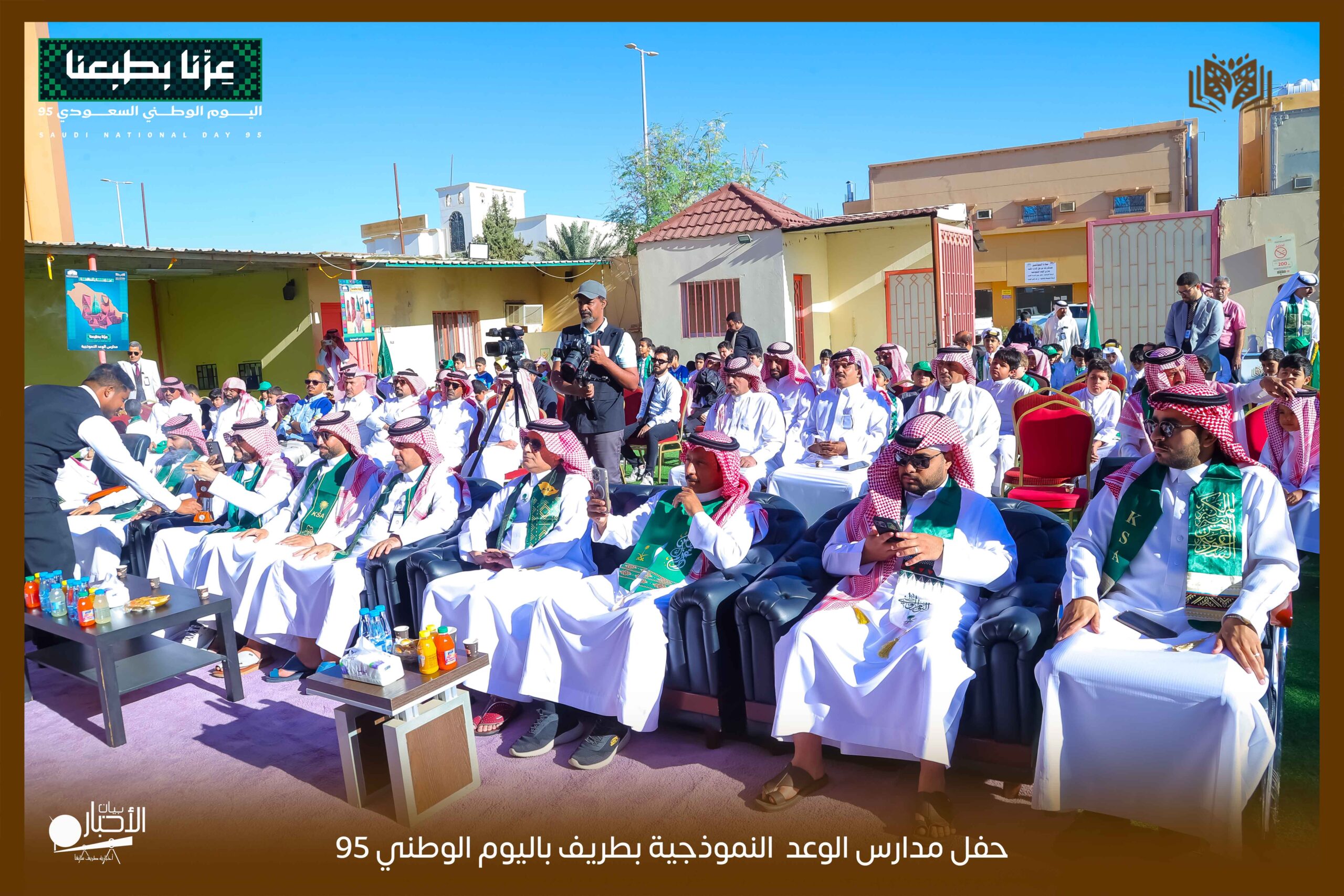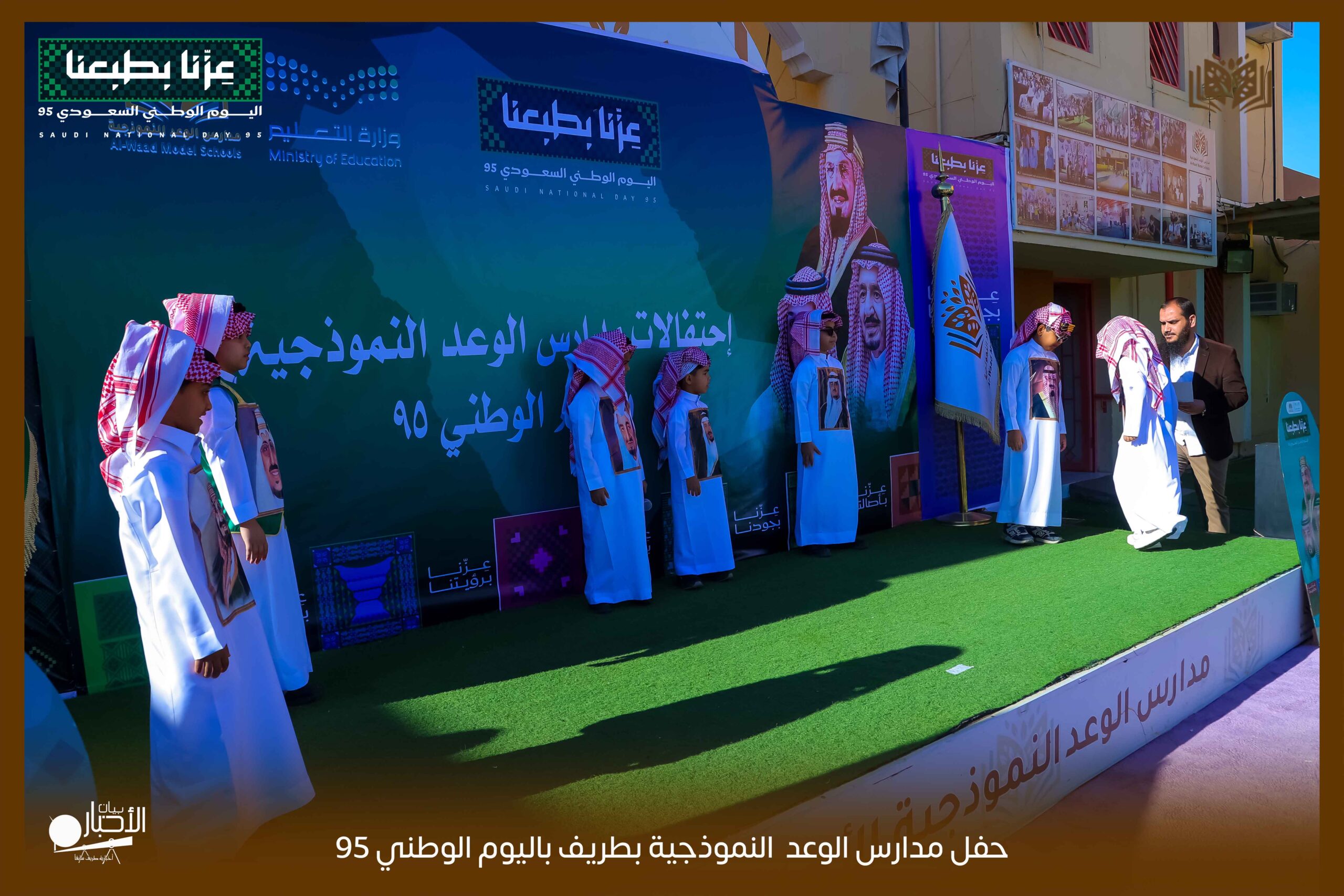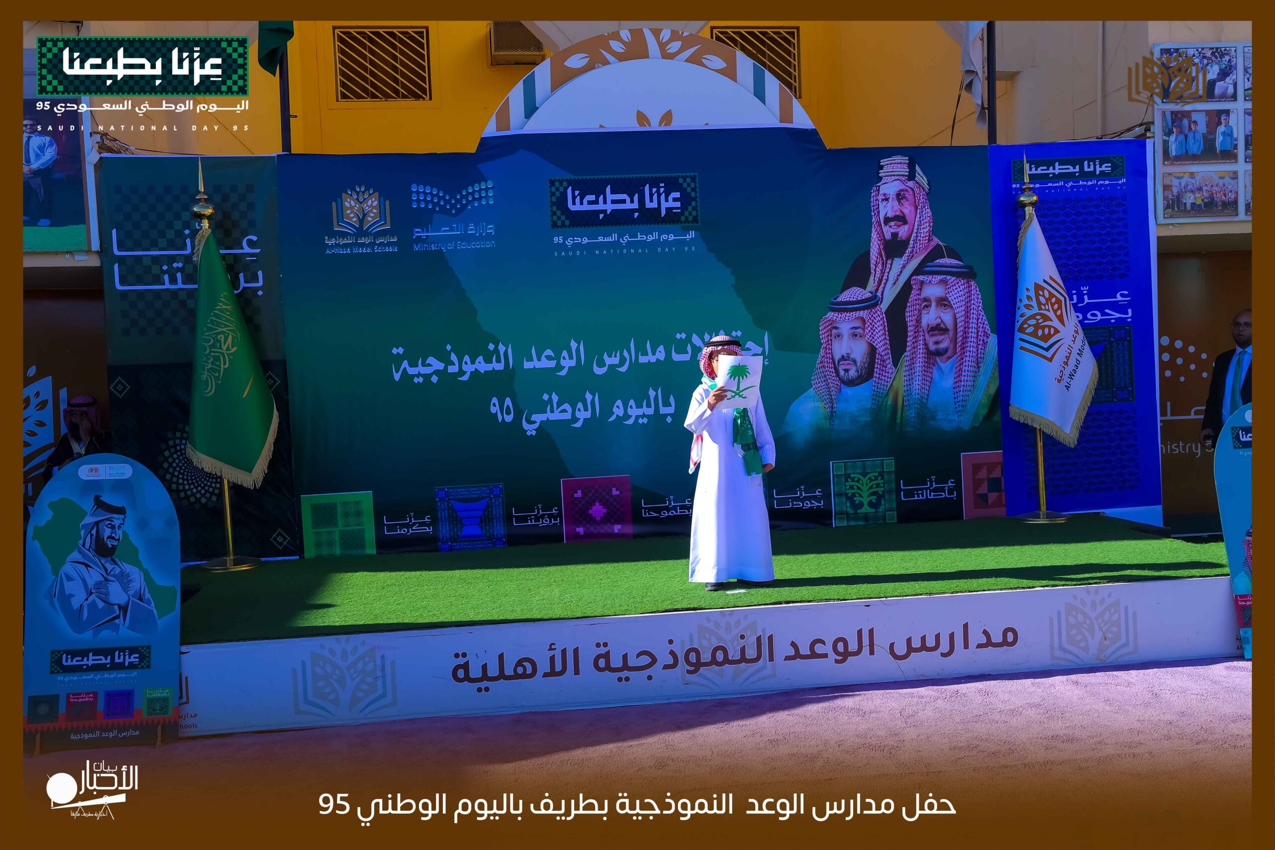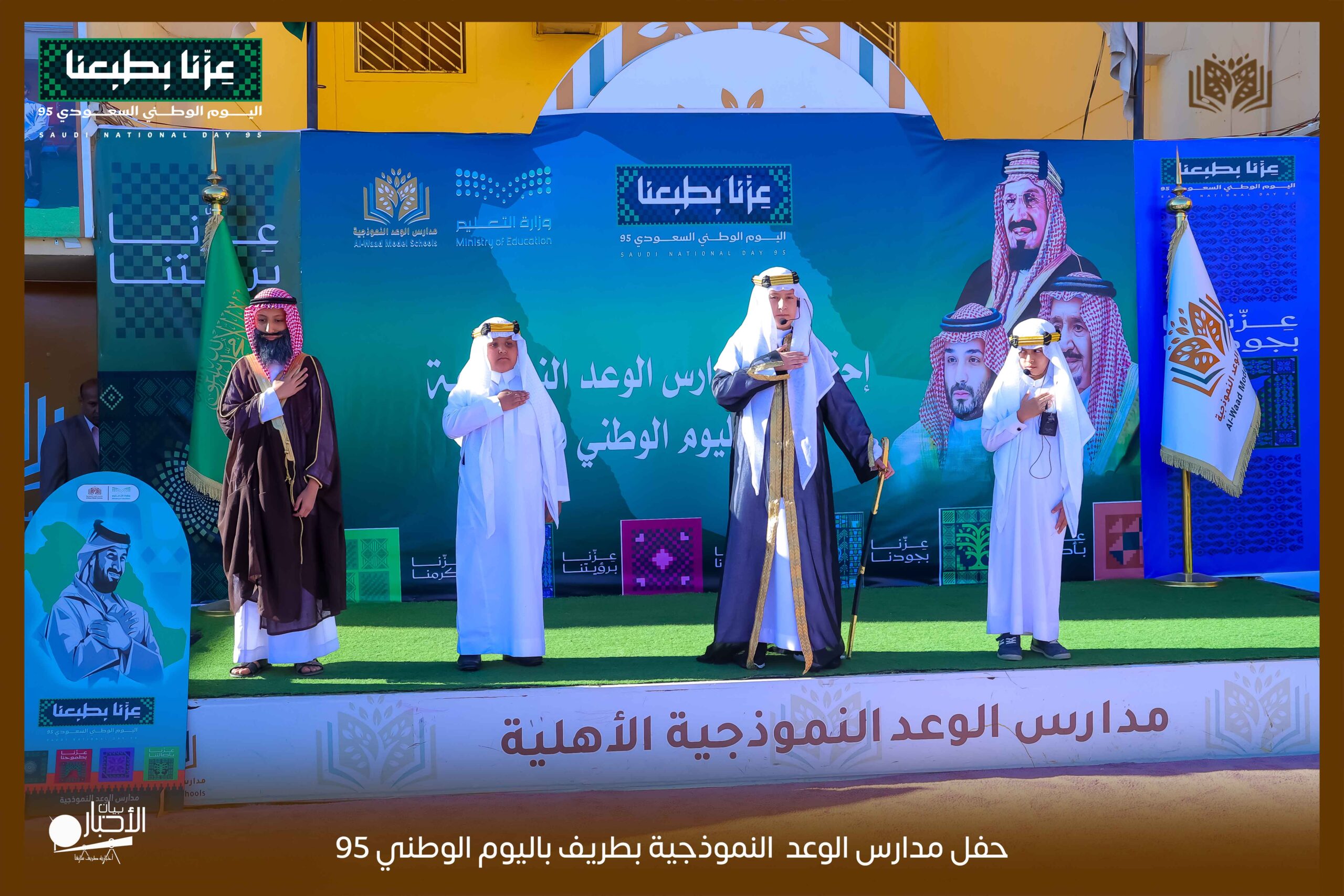 أقامت مدارس الوعد النموذجية الأهلية حفلًا بمناسبة ذكرى( اليوم الوطني السعودي ٩٥ ) ، تلك الذكرى التي تجعلنا نشعر بالاعتزاز والفخر بالانتماء لهذا الوطن العظيم ، حيث بدأ الحفل بعرض السلام الملكي ثم آيات عطرة من الذكر الحكيم ثم كلمة مدير المدرسة الأستاذ إسماعيل صالح العنزي والذي رحب بالسادة الضيوف وأولياء الأمور وتقديم التهنئة للقيادة الحكيمة والشعب السعودي بهذه المناسبة ،ثم تتابعت فقرات الحفل ما بين مشهد لملوك المملكة وعرض مسرحي بعنوان ( عزنا بطبعنا ) ثم فقرة باللغة الإنجليزية في حب الوطن ثم ختم الحفل بأداء الطلاب للعارضة السعودية ٠