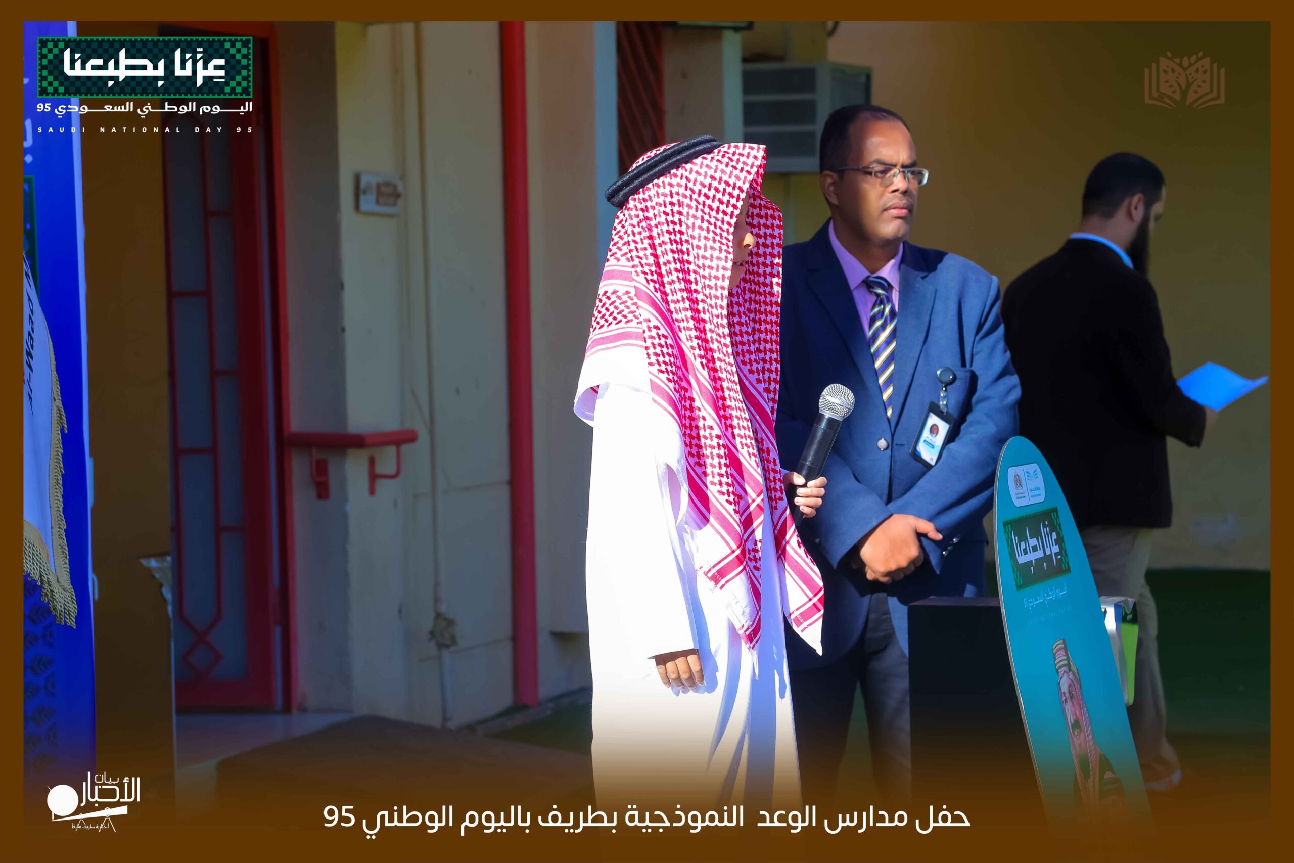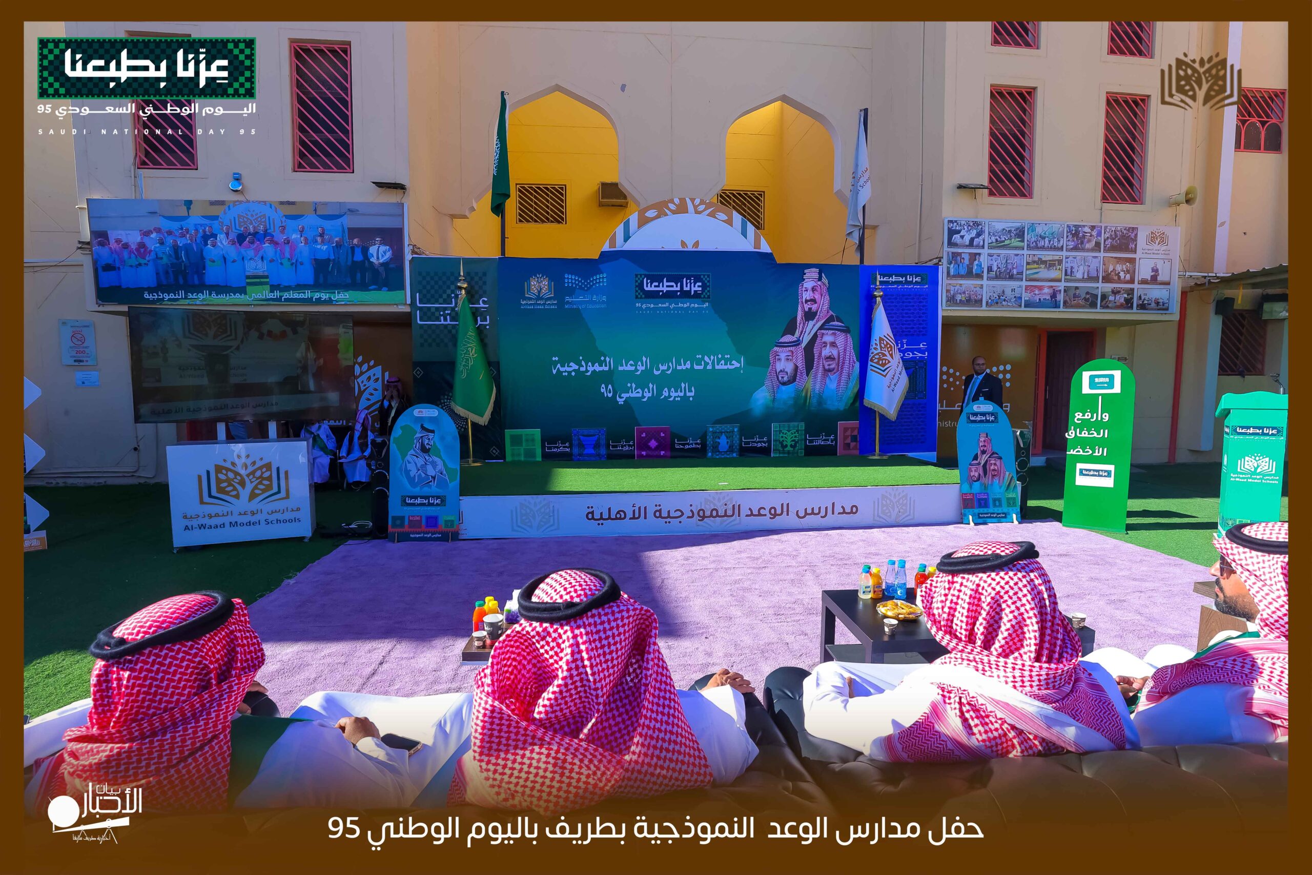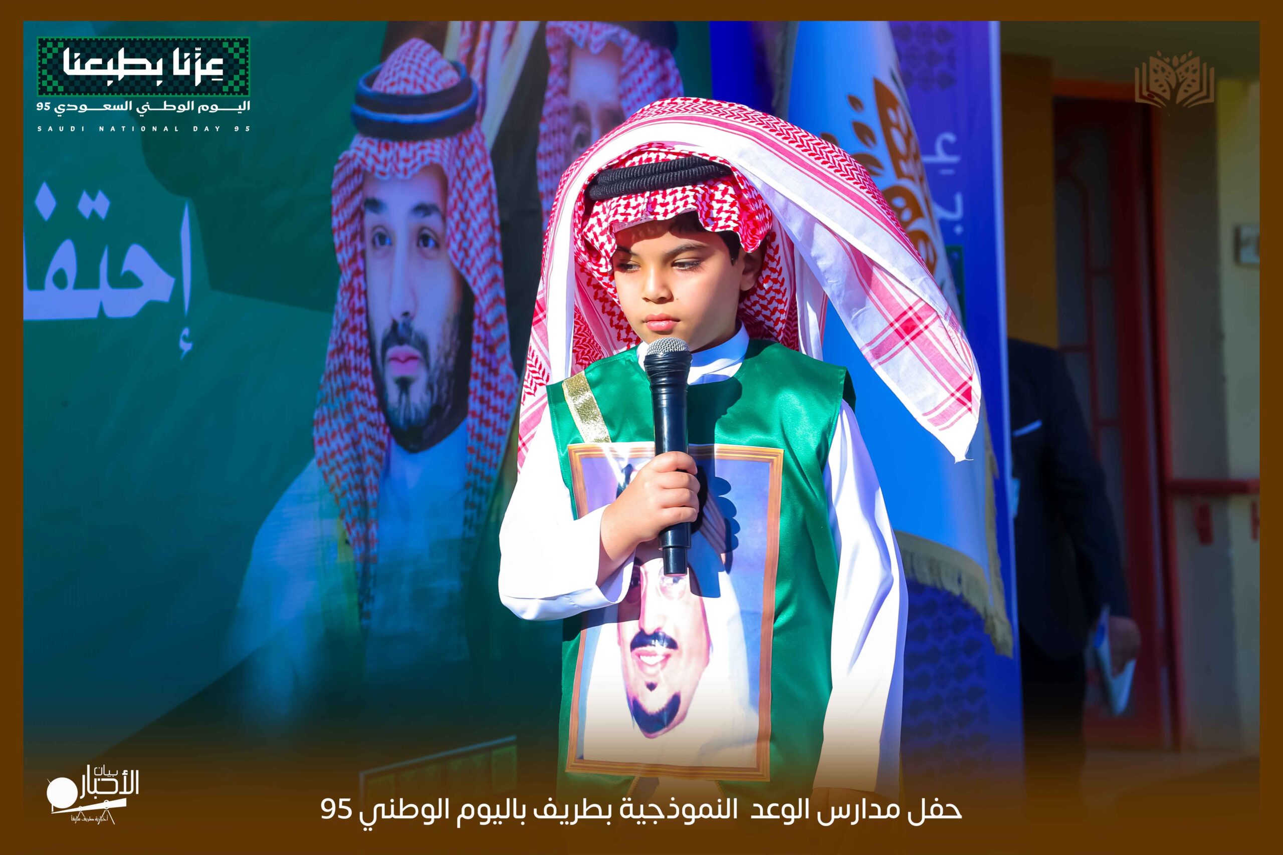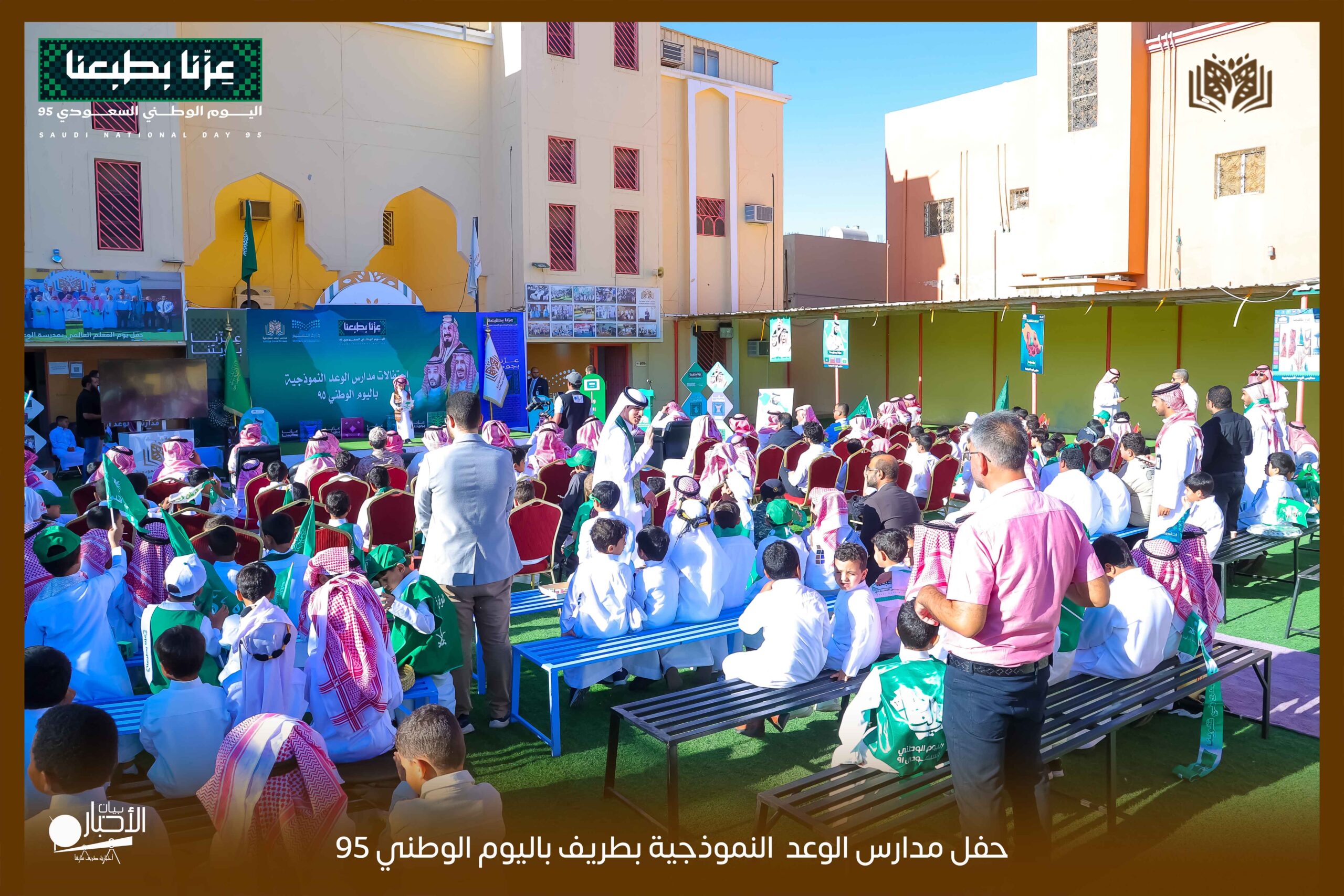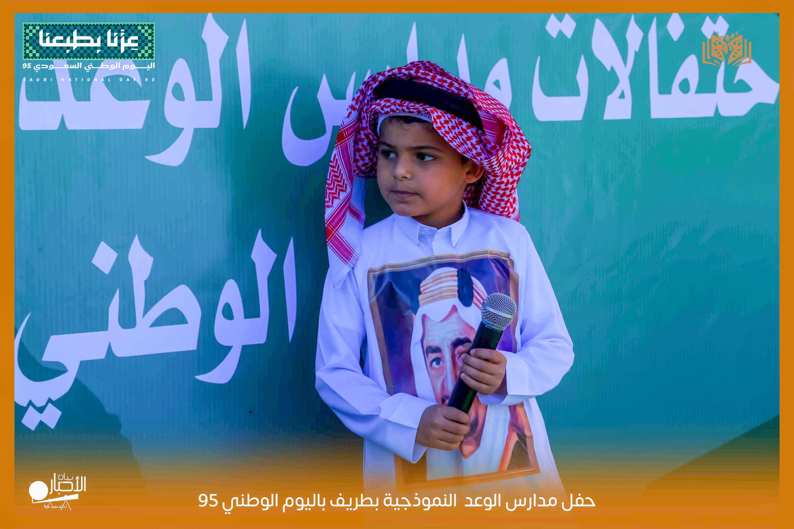 أقامت مدارس الوعد النموذجية الأهلية حفلًا بمناسبة ذكرى( اليوم الوطني السعودي ٩٥ ) ، تلك الذكرى التي تجعلنا نشعر بالاعتزاز والفخر بالانتماء لهذا الوطن العظيم ، حيث بدأ الحفل بعرض السلام الملكي ثم آيات عطرة من الذكر الحكيم ثم كلمة مدير المدرسة الأستاذ إسماعيل صالح العنزي والذي رحب بالسادة الضيوف وأولياء الأمور وتقديم التهنئة للقيادة الحكيمة والشعب السعودي بهذه المناسبة ،ثم تتابعت فقرات الحفل ما بين مشهد لملوك المملكة وعرض مسرحي بعنوان ( عزنا بطبعنا ) ثم فقرة باللغة الإنجليزية في حب الوطن ثم ختم الحفل بأداء الطلاب للعارضة السعودية ٠