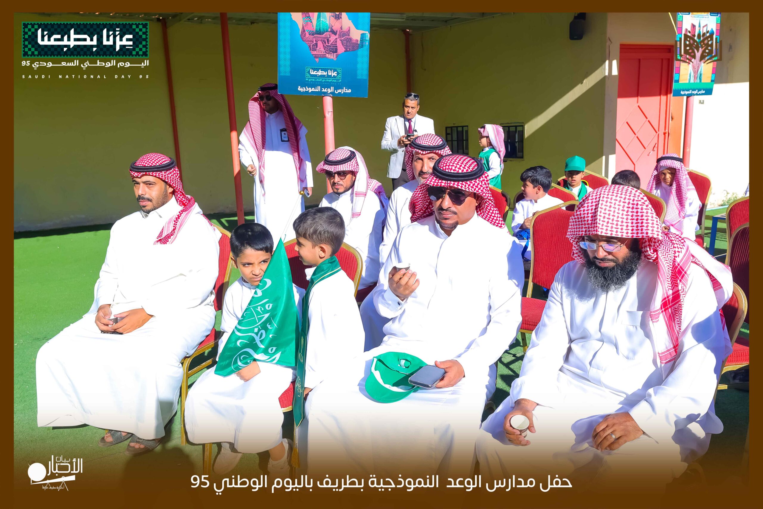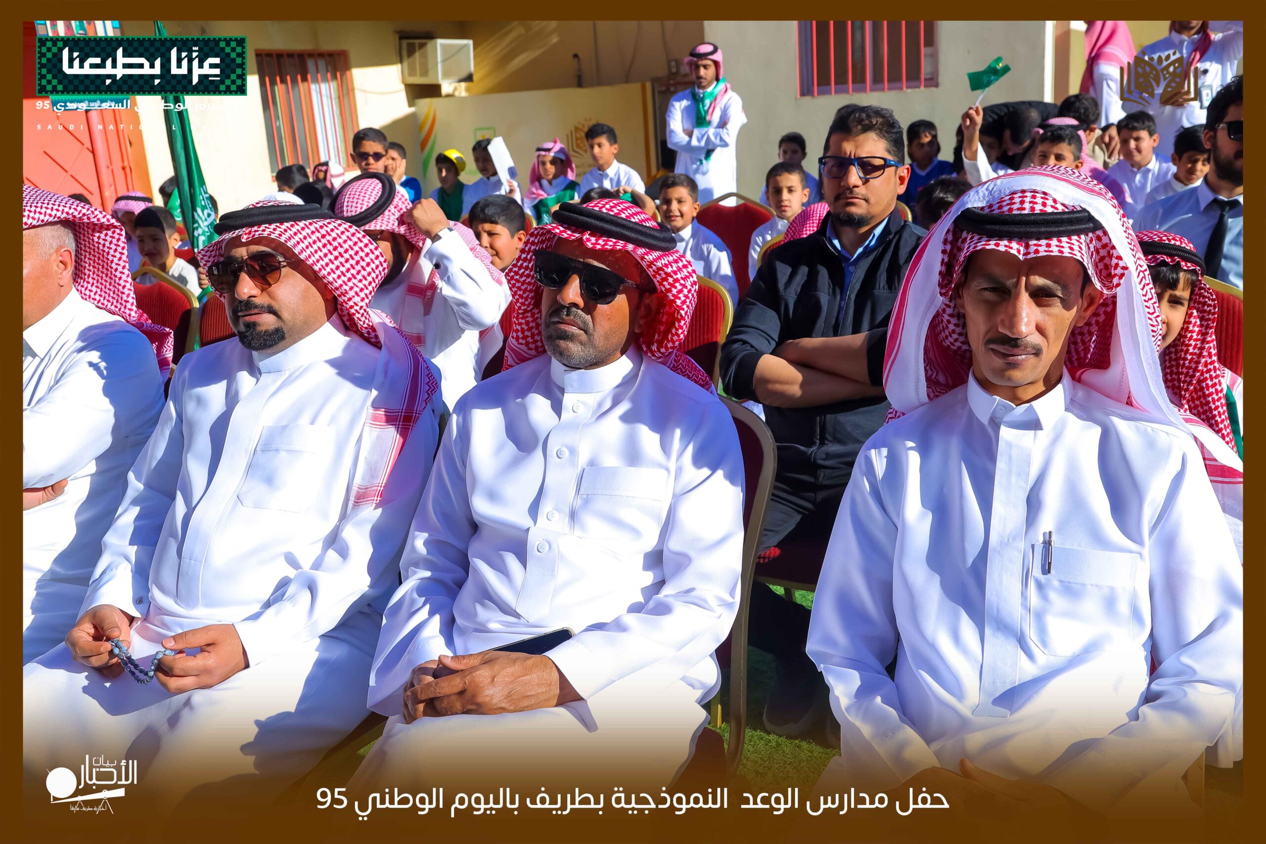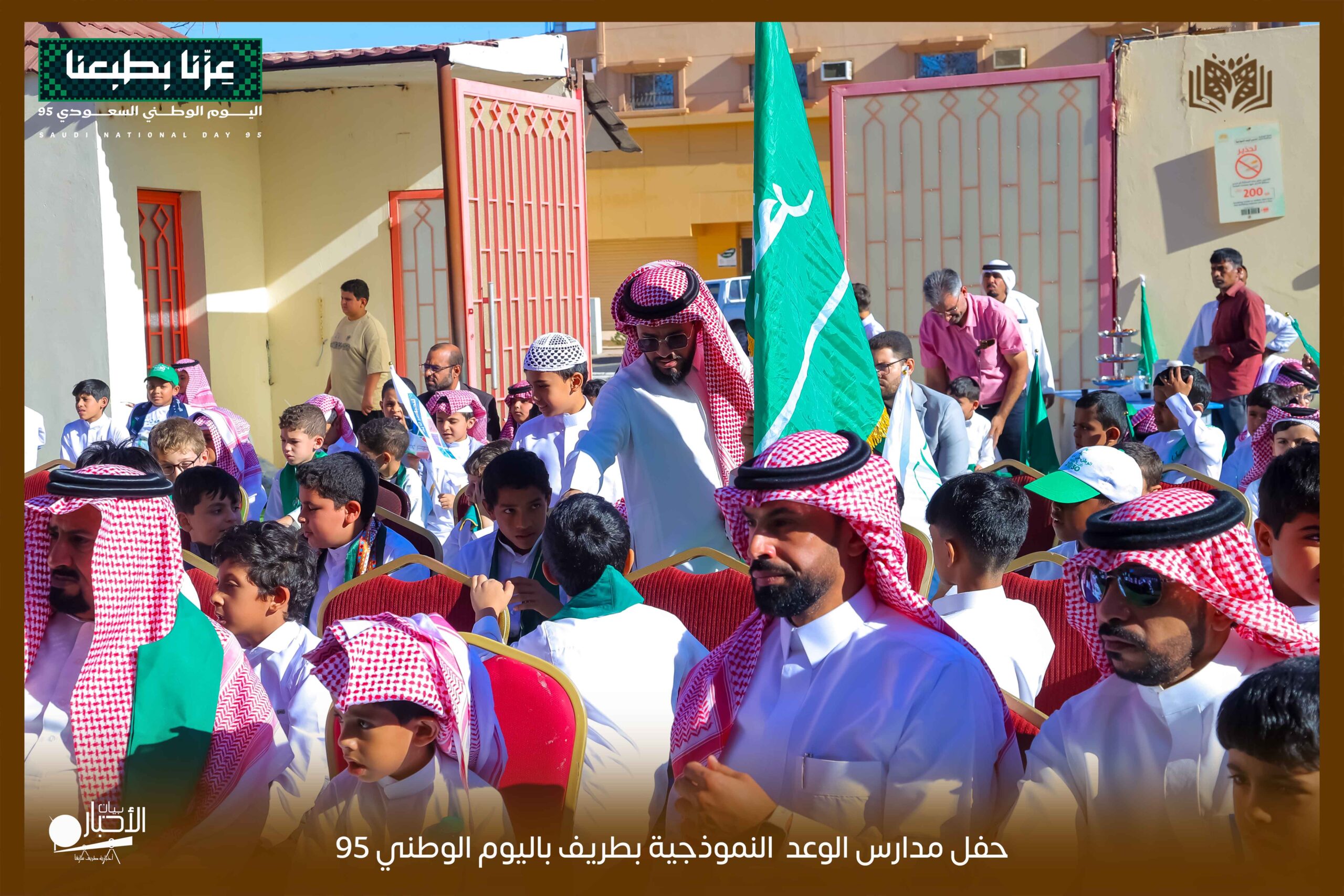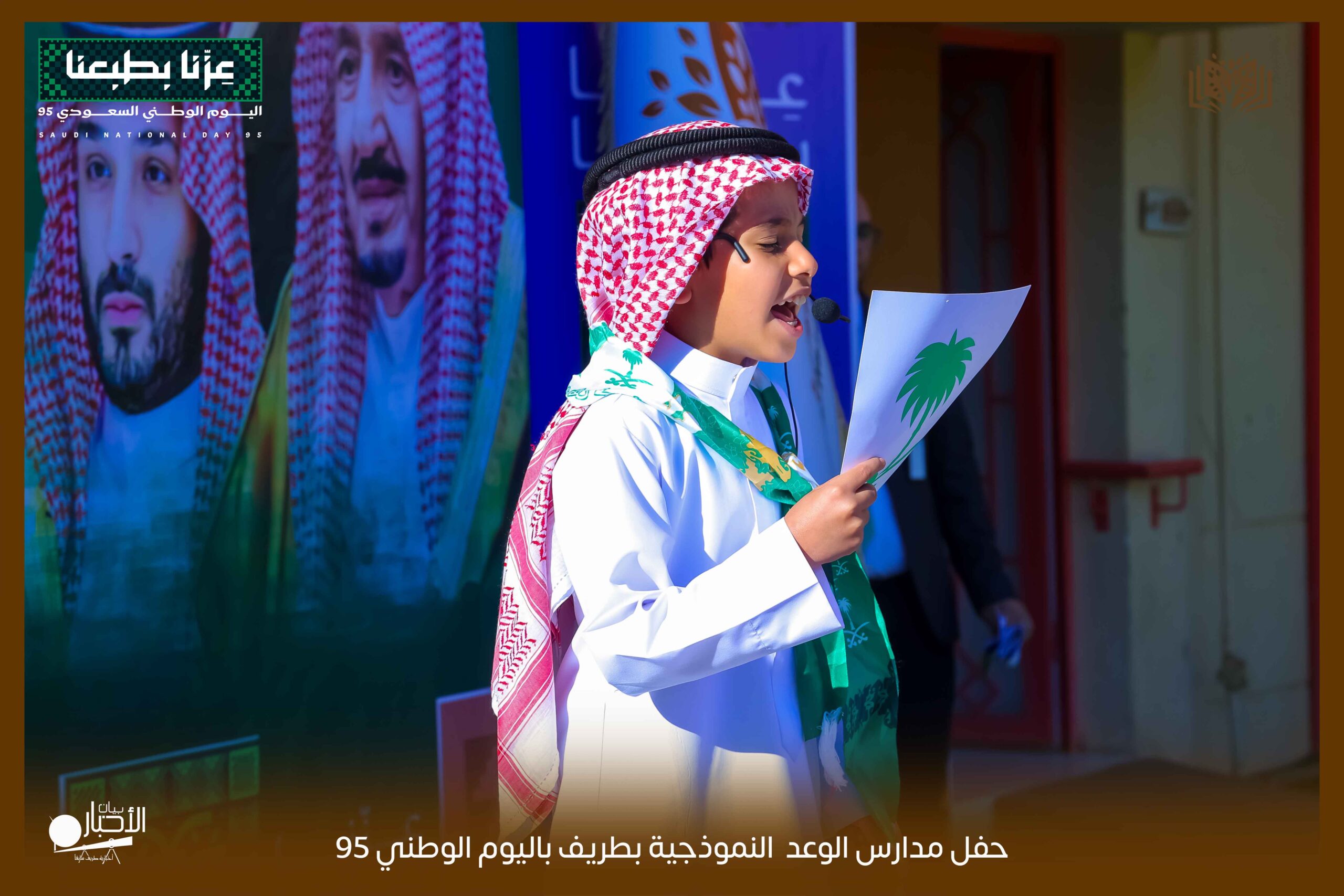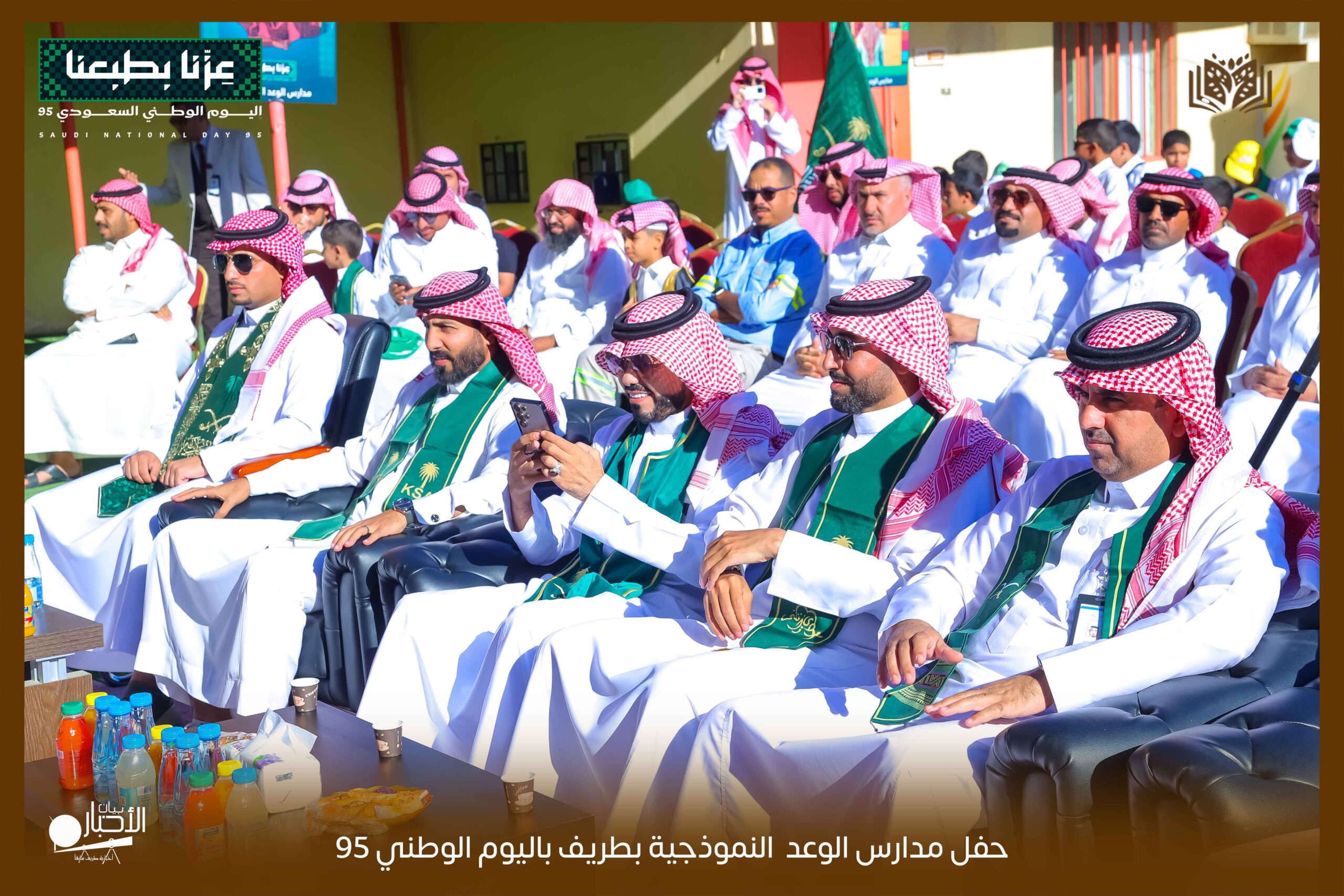 أقامت مدارس الوعد النموذجية الأهلية حفلًا بمناسبة ذكرى( اليوم الوطني السعودي ٩٥ ) ، تلك الذكرى التي تجعلنا نشعر بالاعتزاز والفخر بالانتماء لهذا الوطن العظيم ، حيث بدأ الحفل بعرض السلام الملكي ثم آيات عطرة من الذكر الحكيم ثم كلمة مدير المدرسة الأستاذ إسماعيل صالح العنزي والذي رحب بالسادة الضيوف وأولياء الأمور وتقديم التهنئة للقيادة الحكيمة والشعب السعودي بهذه المناسبة ،ثم تتابعت فقرات الحفل ما بين مشهد لملوك المملكة وعرض مسرحي بعنوان ( عزنا بطبعنا ) ثم فقرة باللغة الإنجليزية في حب الوطن ثم ختم الحفل بأداء الطلاب للعارضة السعودية ٠