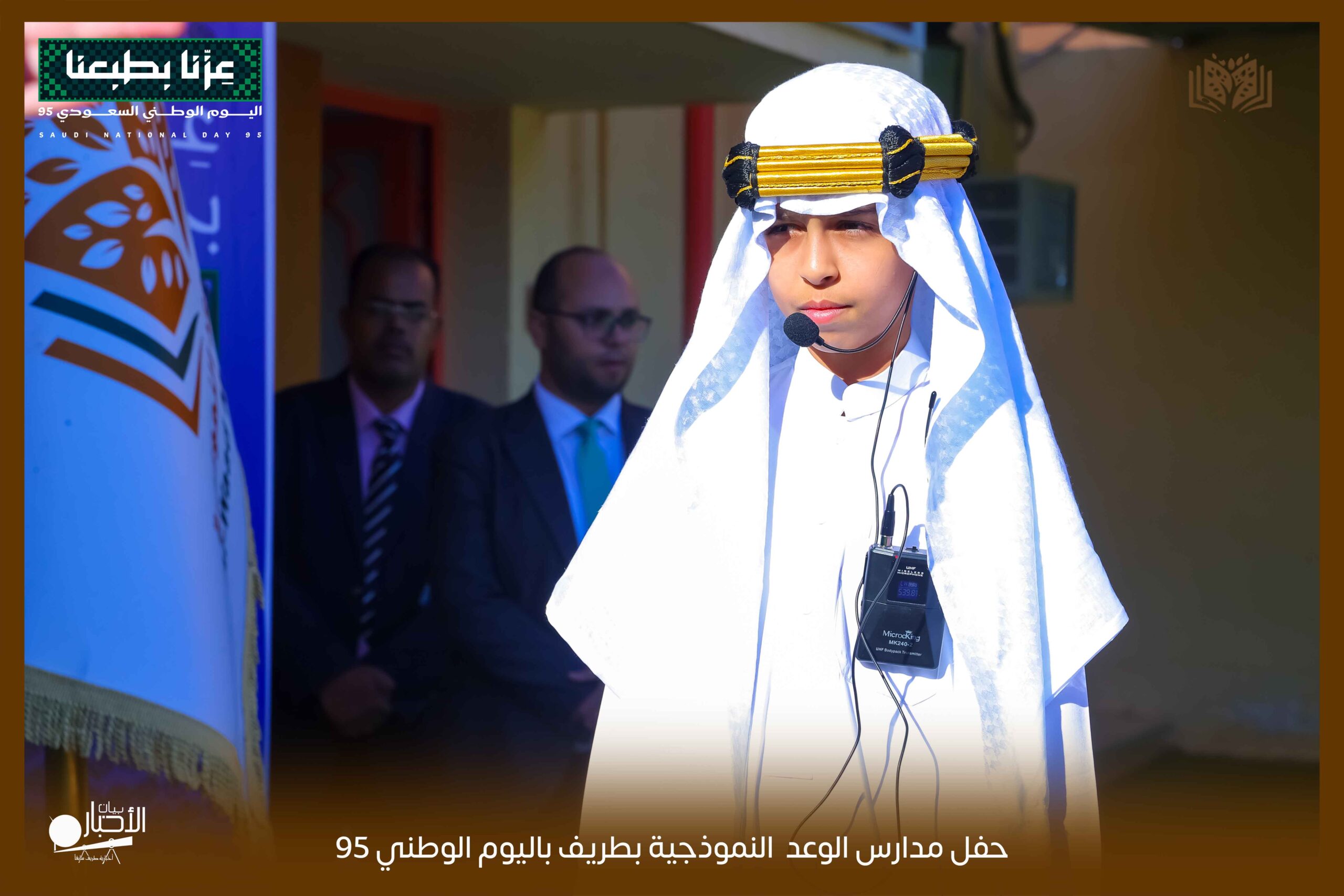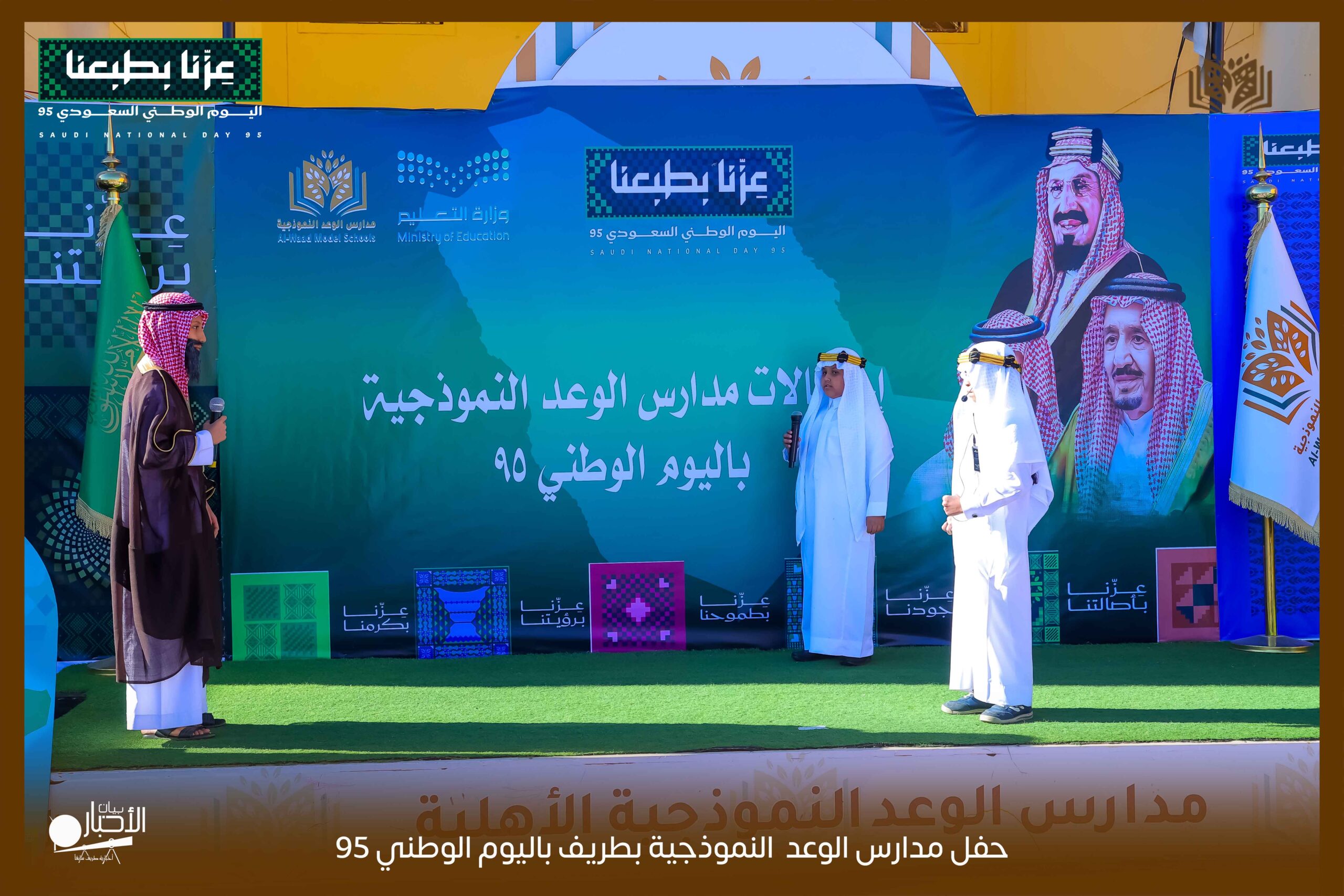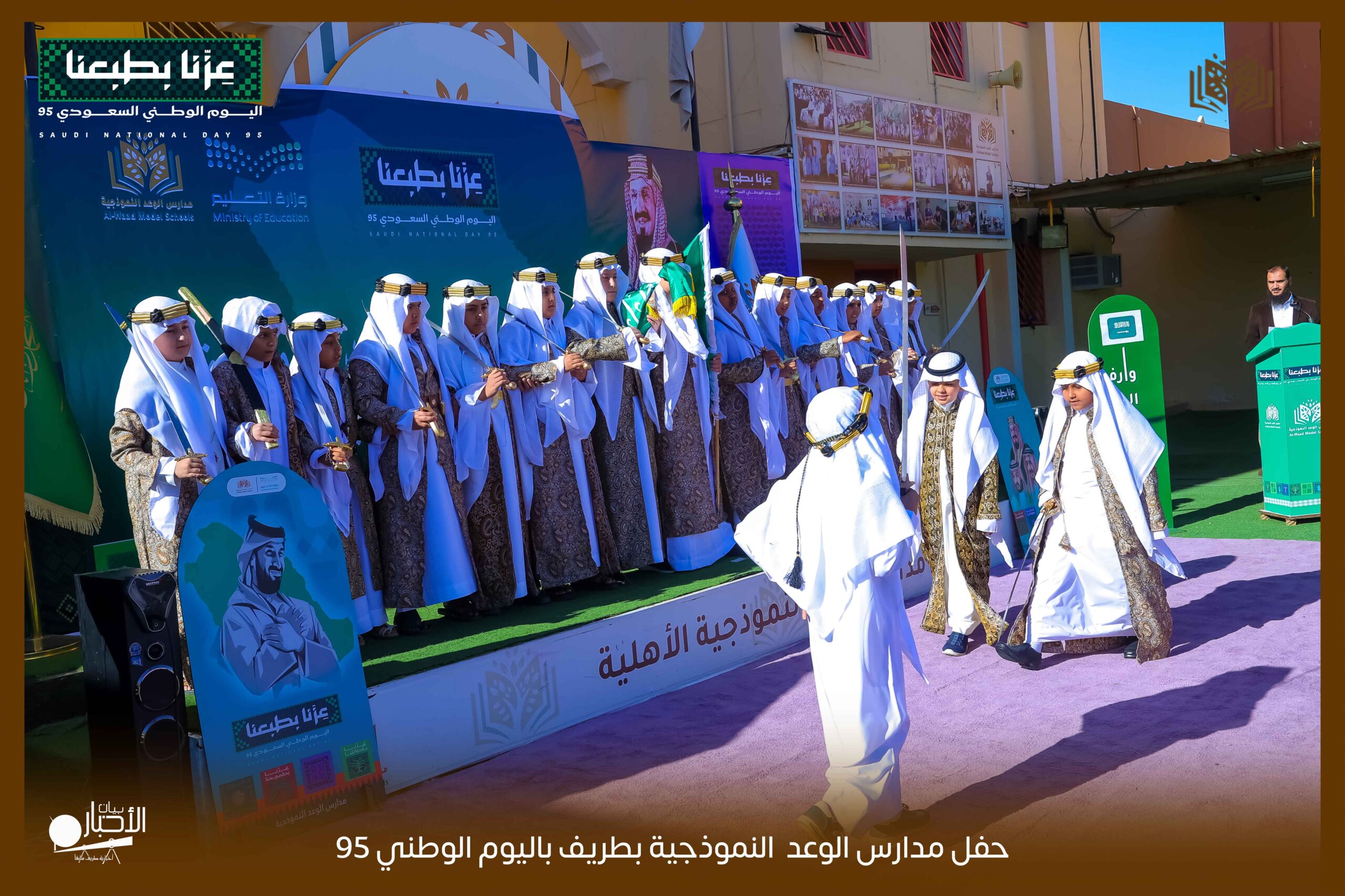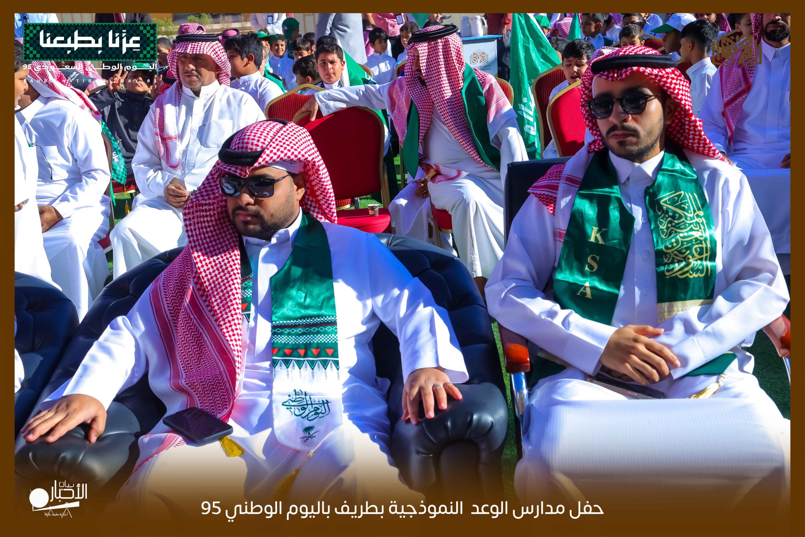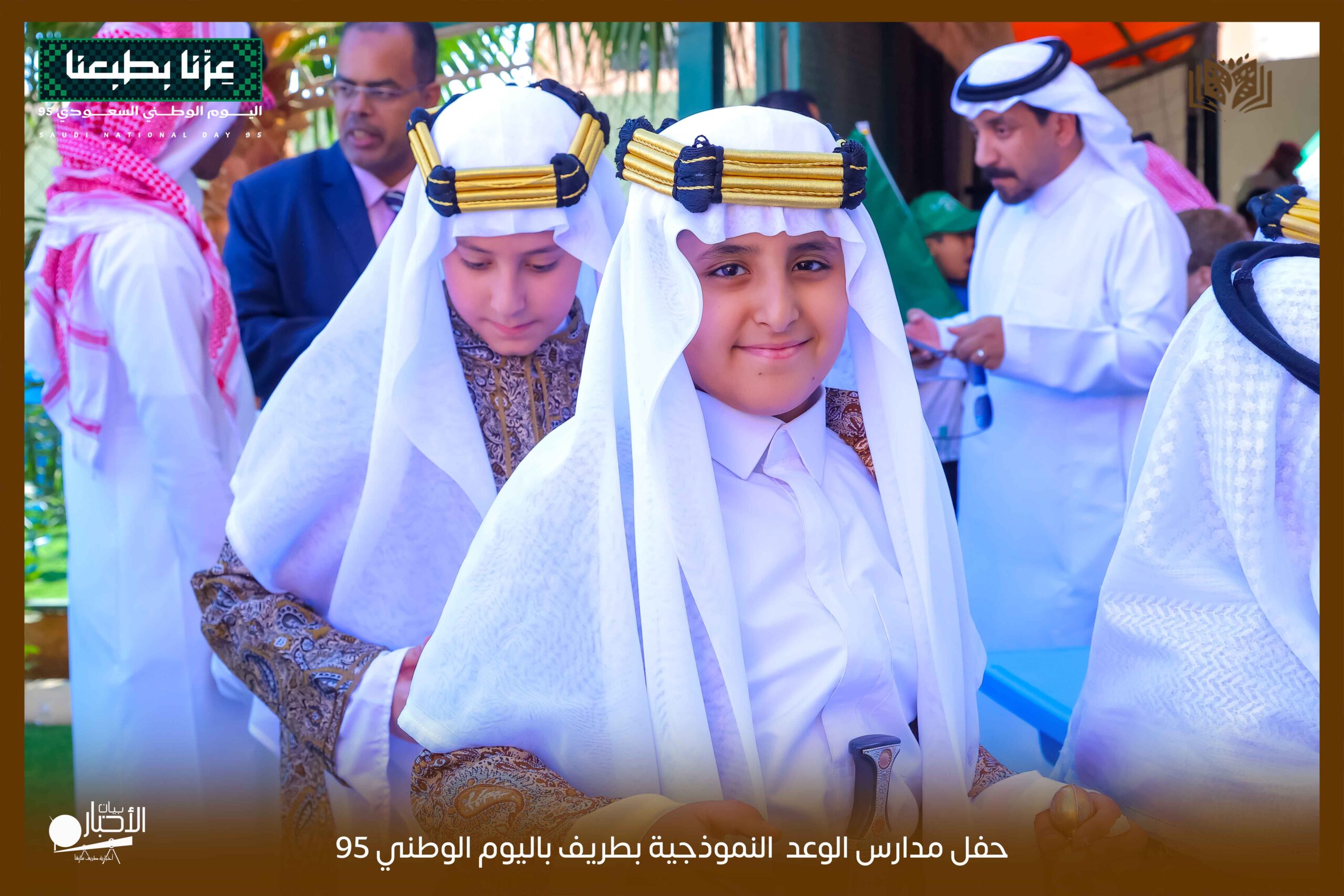 أقامت مدارس الوعد النموذجية الأهلية حفلًا بمناسبة ذكرى( اليوم الوطني السعودي ٩٥ ) ، تلك الذكرى التي تجعلنا نشعر بالاعتزاز والفخر بالانتماء لهذا الوطن العظيم ، حيث بدأ الحفل بعرض السلام الملكي ثم آيات عطرة من الذكر الحكيم ثم كلمة مدير المدرسة الأستاذ إسماعيل صالح العنزي والذي رحب بالسادة الضيوف وأولياء الأمور وتقديم التهنئة للقيادة الحكيمة والشعب السعودي بهذه المناسبة ،ثم تتابعت فقرات الحفل ما بين مشهد لملوك المملكة وعرض مسرحي بعنوان ( عزنا بطبعنا ) ثم فقرة باللغة الإنجليزية في حب الوطن ثم ختم الحفل بأداء الطلاب للعارضة السعودية ٠