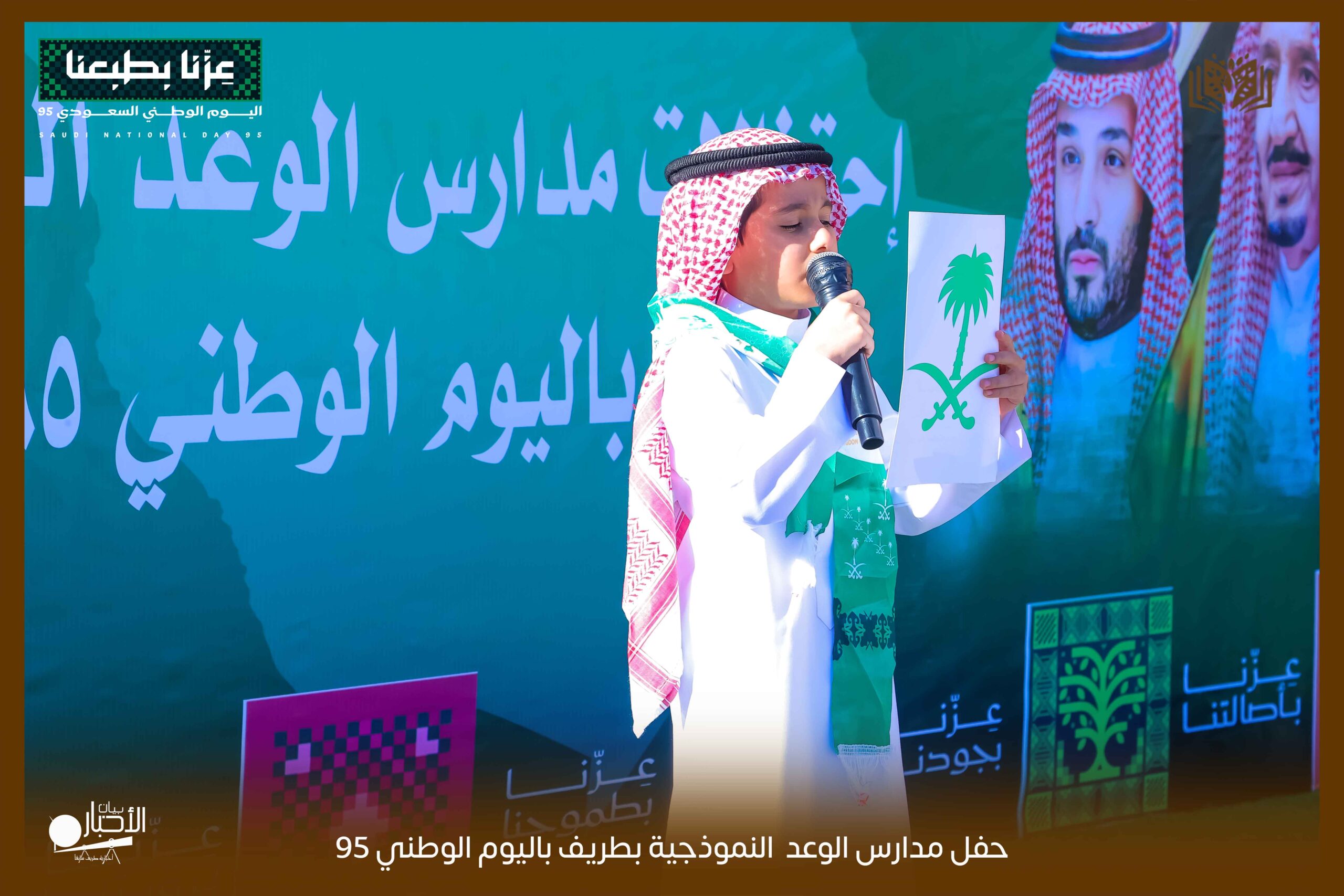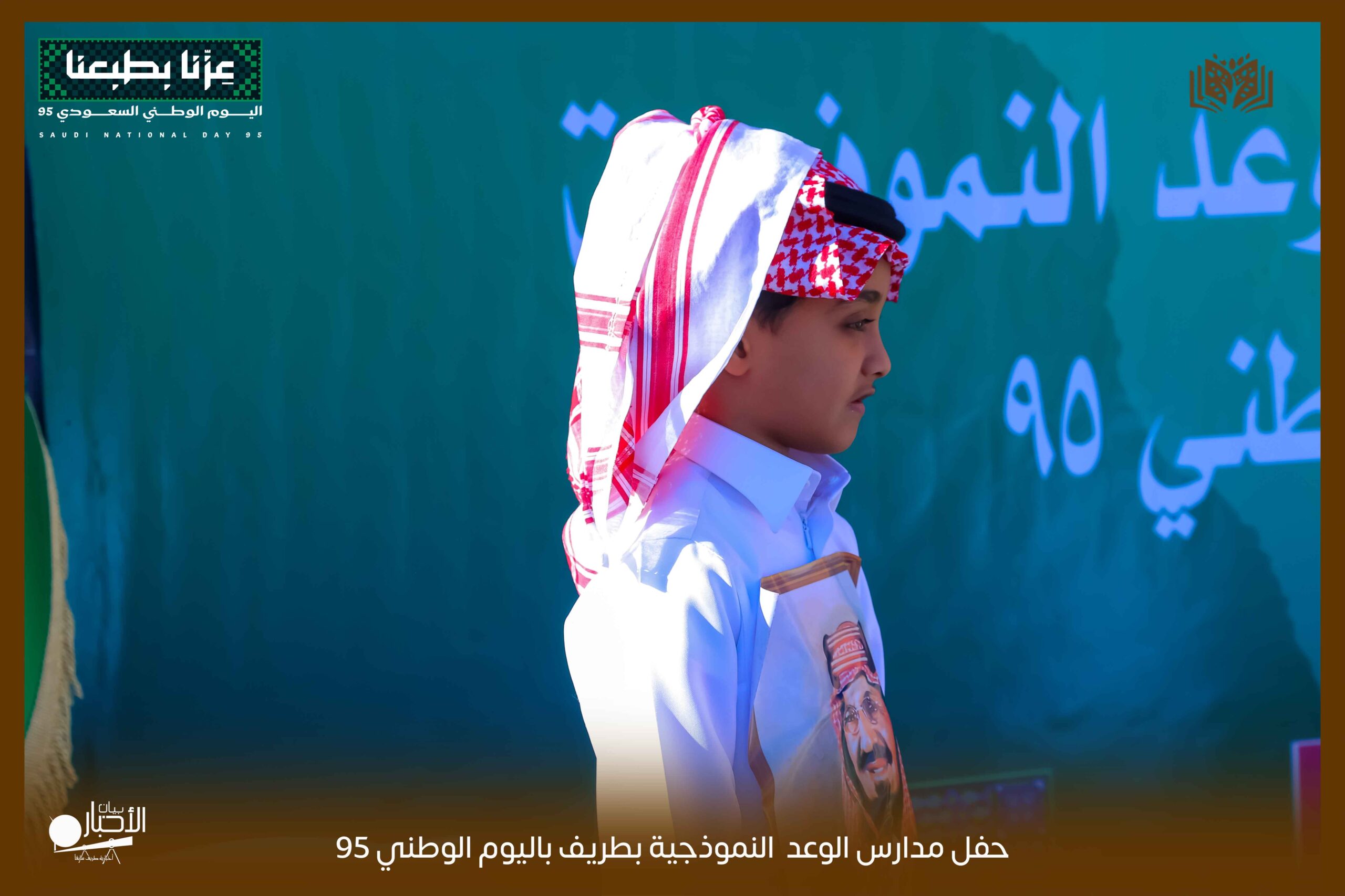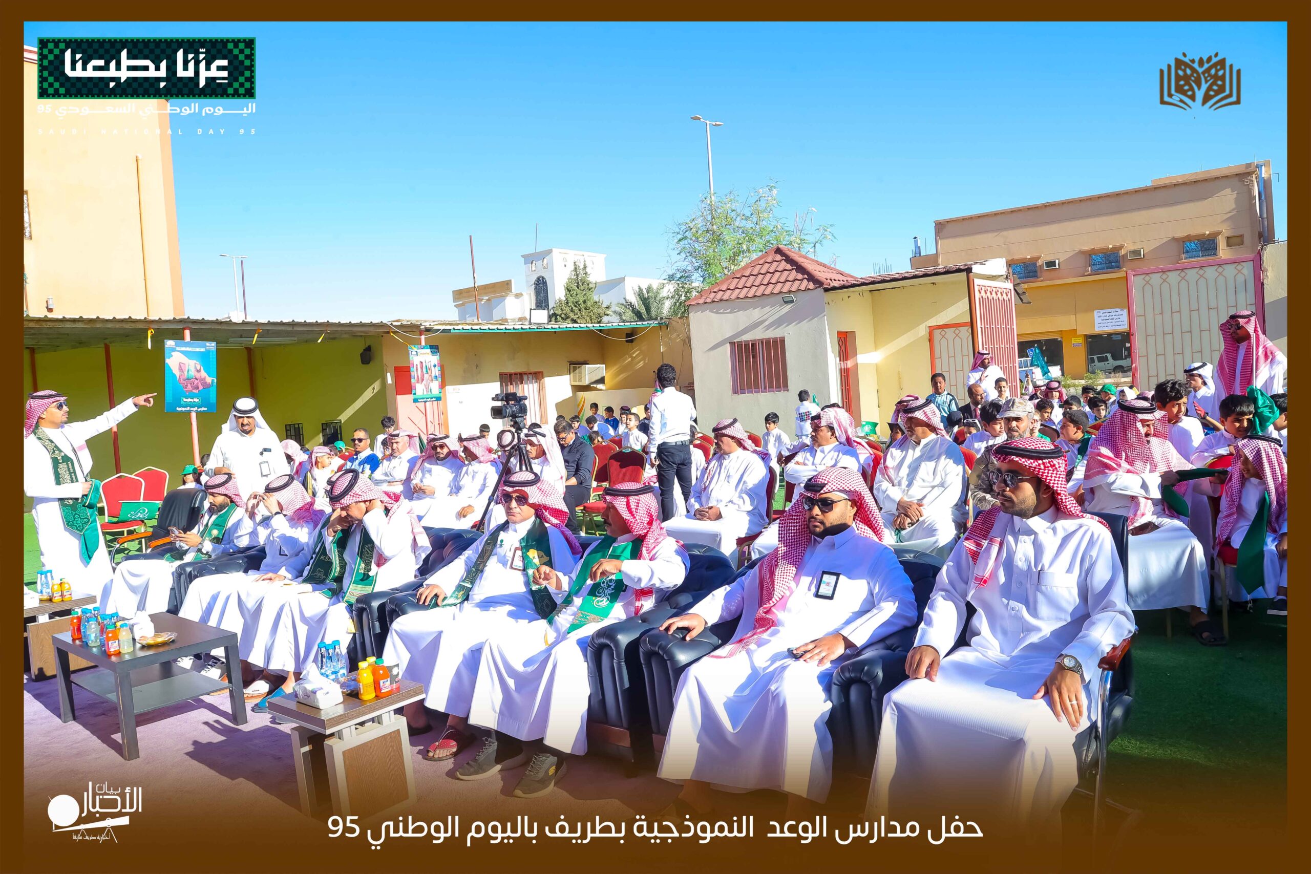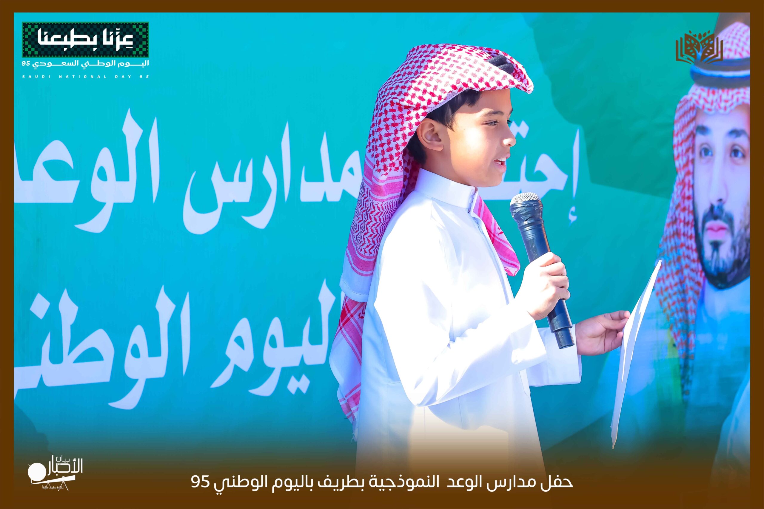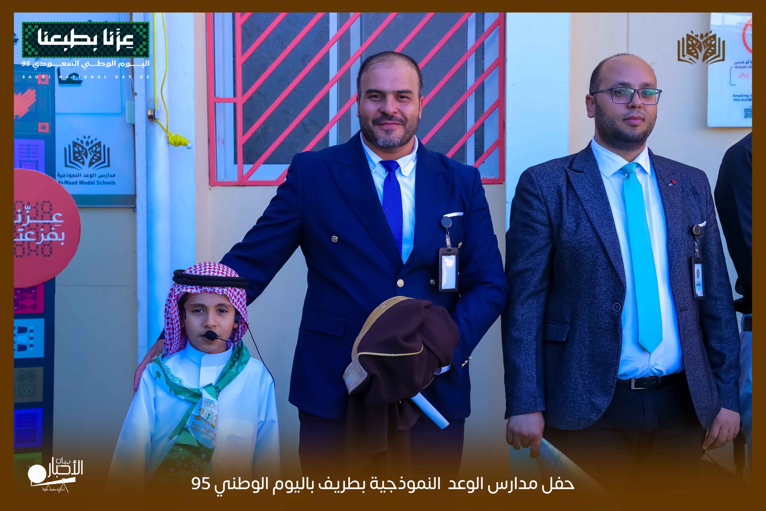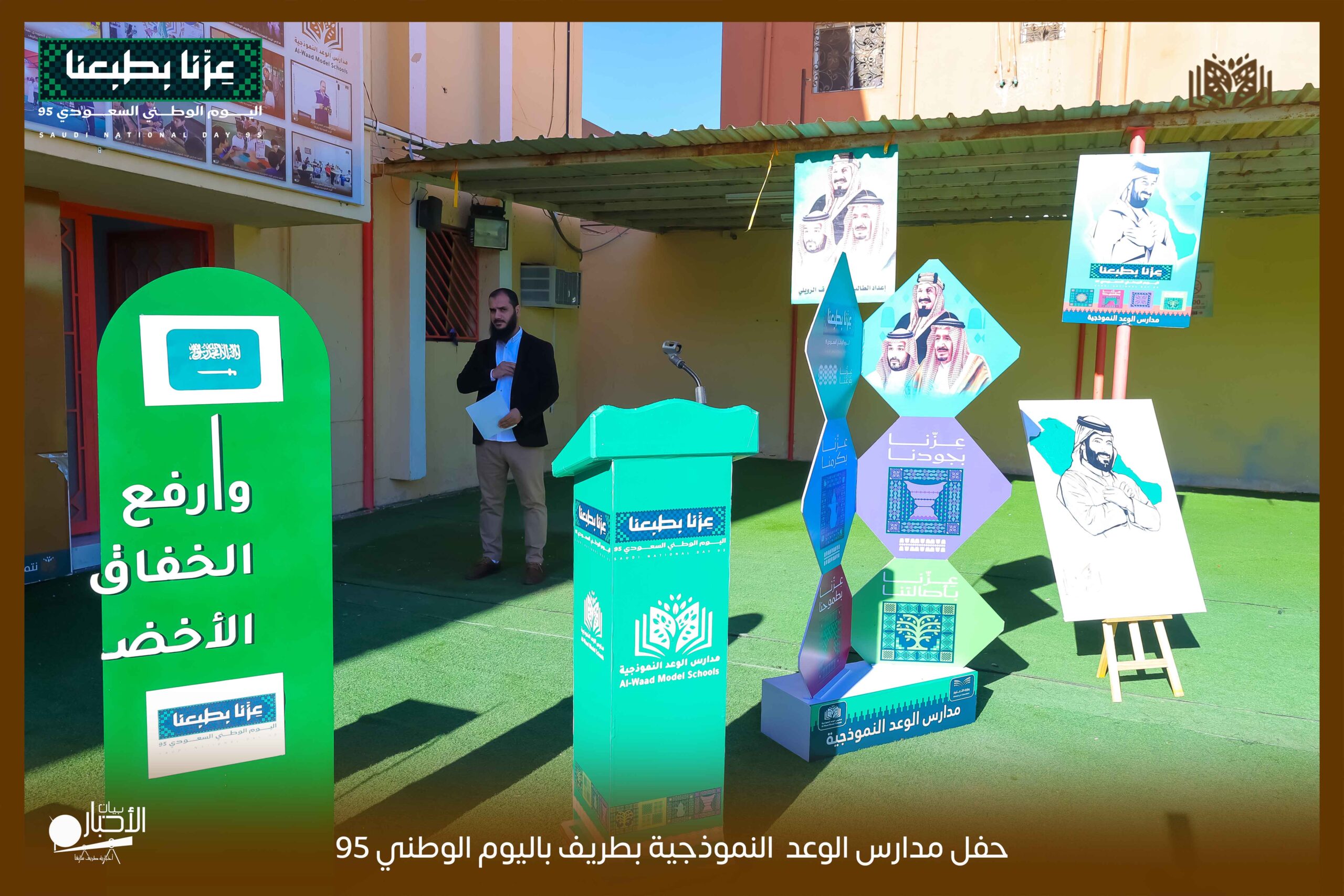 أقامت مدارس الوعد النموذجية الأهلية حفلًا بمناسبة ذكرى( اليوم الوطني السعودي ٩٥ ) ، تلك الذكرى التي تجعلنا نشعر بالاعتزاز والفخر بالانتماء لهذا الوطن العظيم ، حيث بدأ الحفل بعرض السلام الملكي ثم آيات عطرة من الذكر الحكيم ثم كلمة مدير المدرسة الأستاذ إسماعيل صالح العنزي والذي رحب بالسادة الضيوف وأولياء الأمور وتقديم التهنئة للقيادة الحكيمة والشعب السعودي بهذه المناسبة ،ثم تتابعت فقرات الحفل ما بين مشهد لملوك المملكة وعرض مسرحي بعنوان ( عزنا بطبعنا ) ثم فقرة باللغة الإنجليزية في حب الوطن ثم ختم الحفل بأداء الطلاب للعارضة السعودية ٠