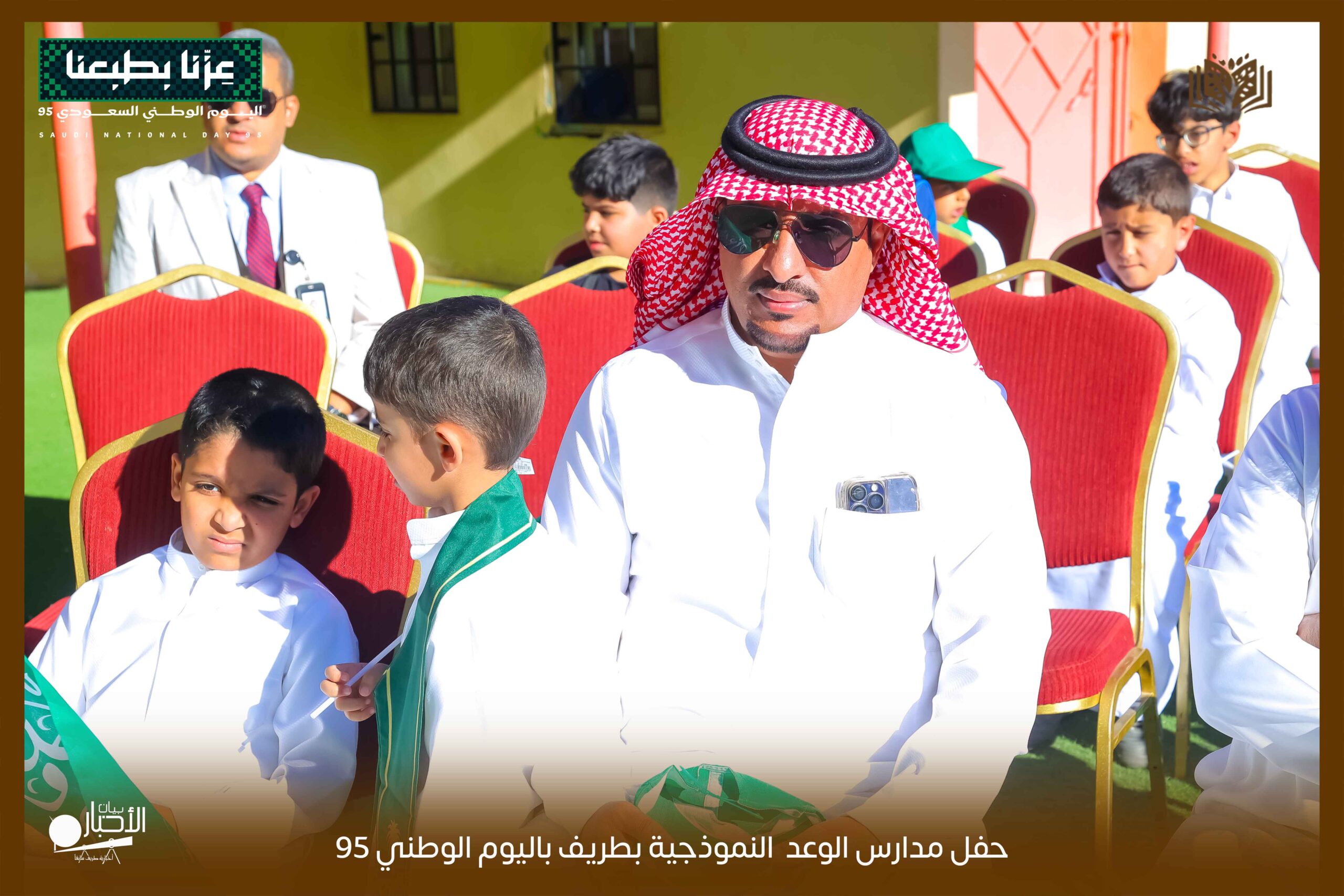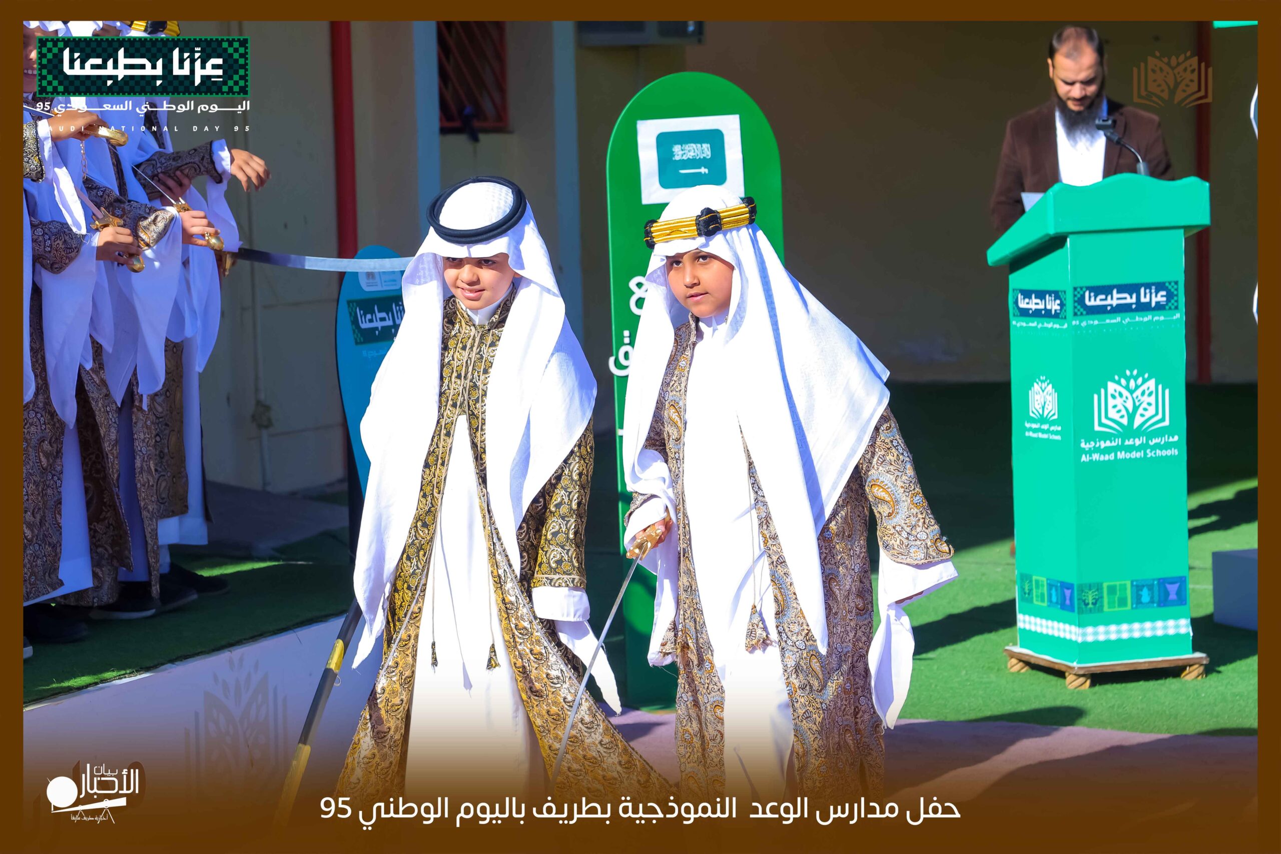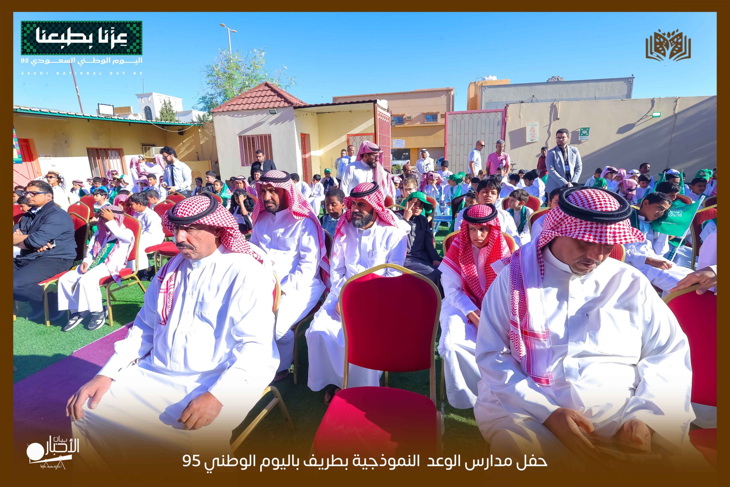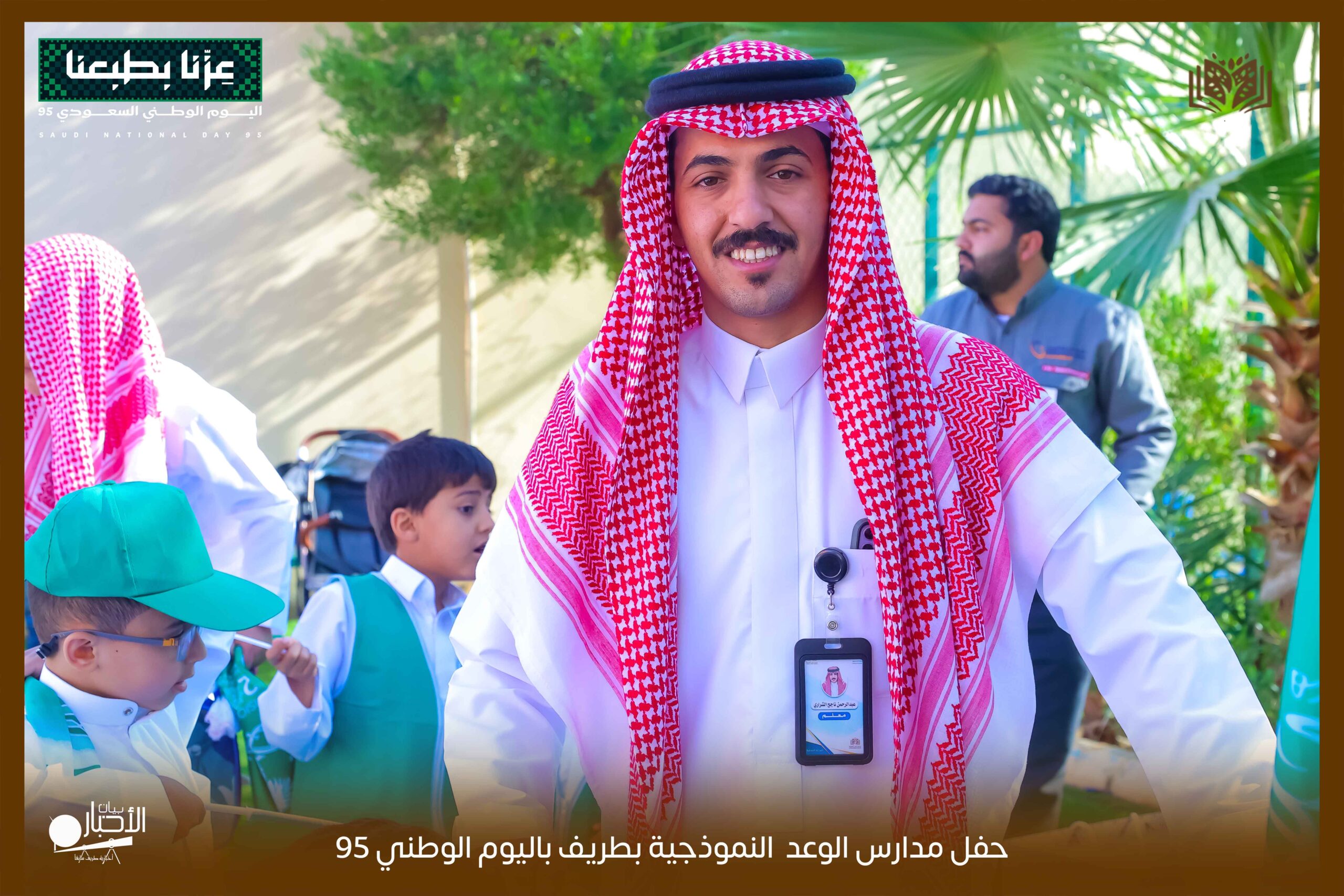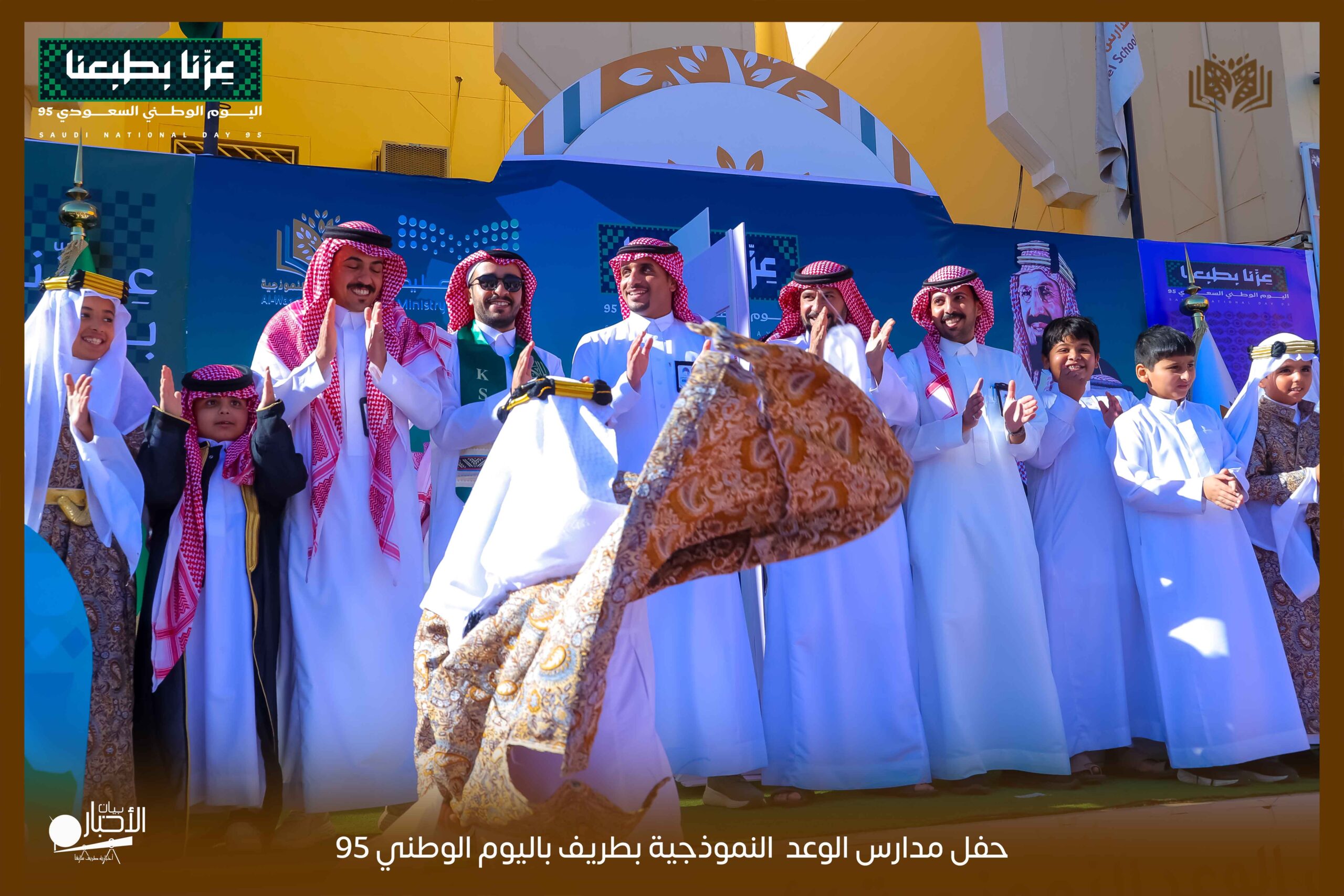 أقامت مدارس الوعد النموذجية الأهلية حفلًا بمناسبة ذكرى( اليوم الوطني السعودي ٩٥ ) ، تلك الذكرى التي تجعلنا نشعر بالاعتزاز والفخر بالانتماء لهذا الوطن العظيم ، حيث بدأ الحفل بعرض السلام الملكي ثم آيات عطرة من الذكر الحكيم ثم كلمة مدير المدرسة الأستاذ إسماعيل صالح العنزي والذي رحب بالسادة الضيوف وأولياء الأمور وتقديم التهنئة للقيادة الحكيمة والشعب السعودي بهذه المناسبة ،ثم تتابعت فقرات الحفل ما بين مشهد لملوك المملكة وعرض مسرحي بعنوان ( عزنا بطبعنا ) ثم فقرة باللغة الإنجليزية في حب الوطن ثم ختم الحفل بأداء الطلاب للعارضة السعودية ٠