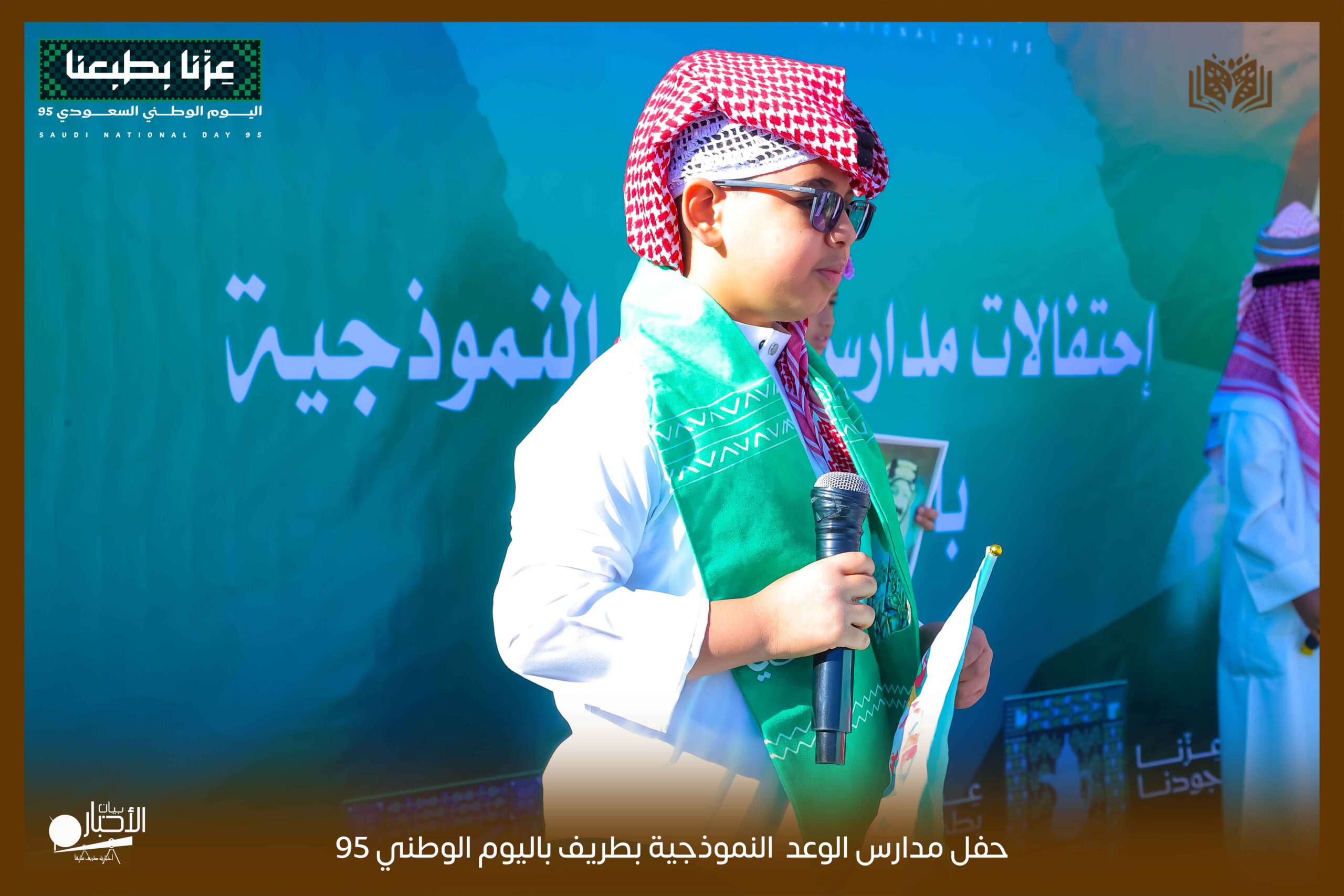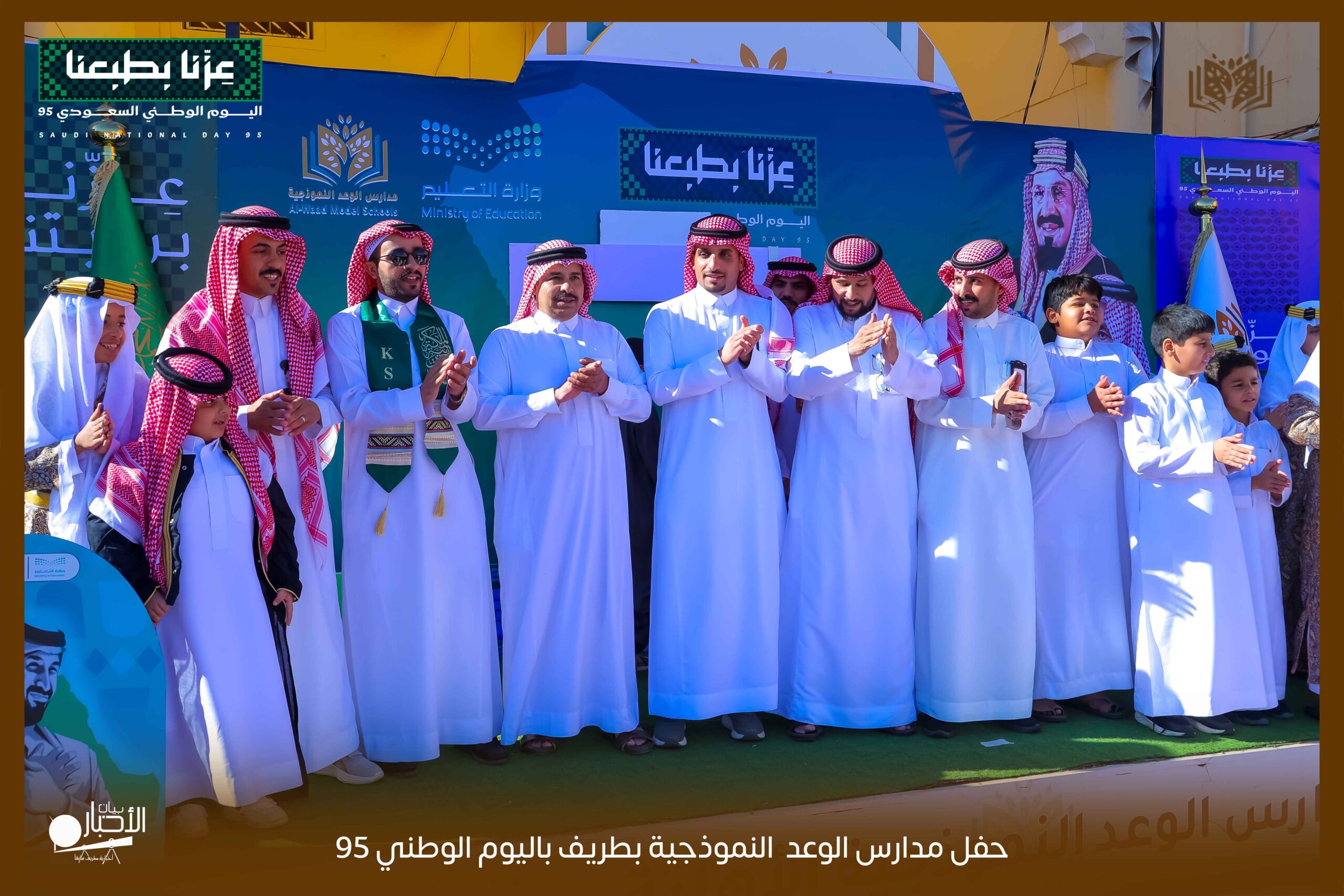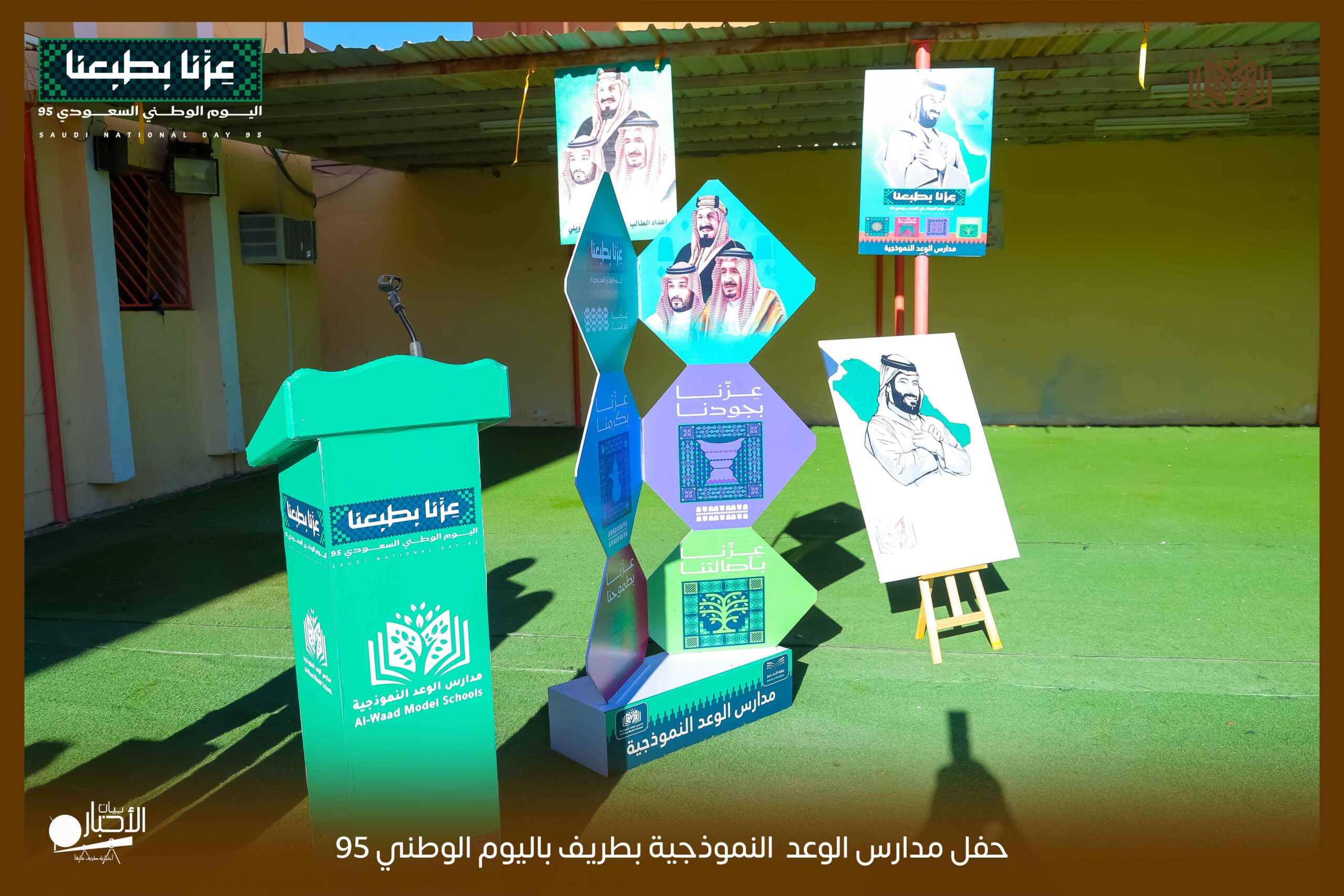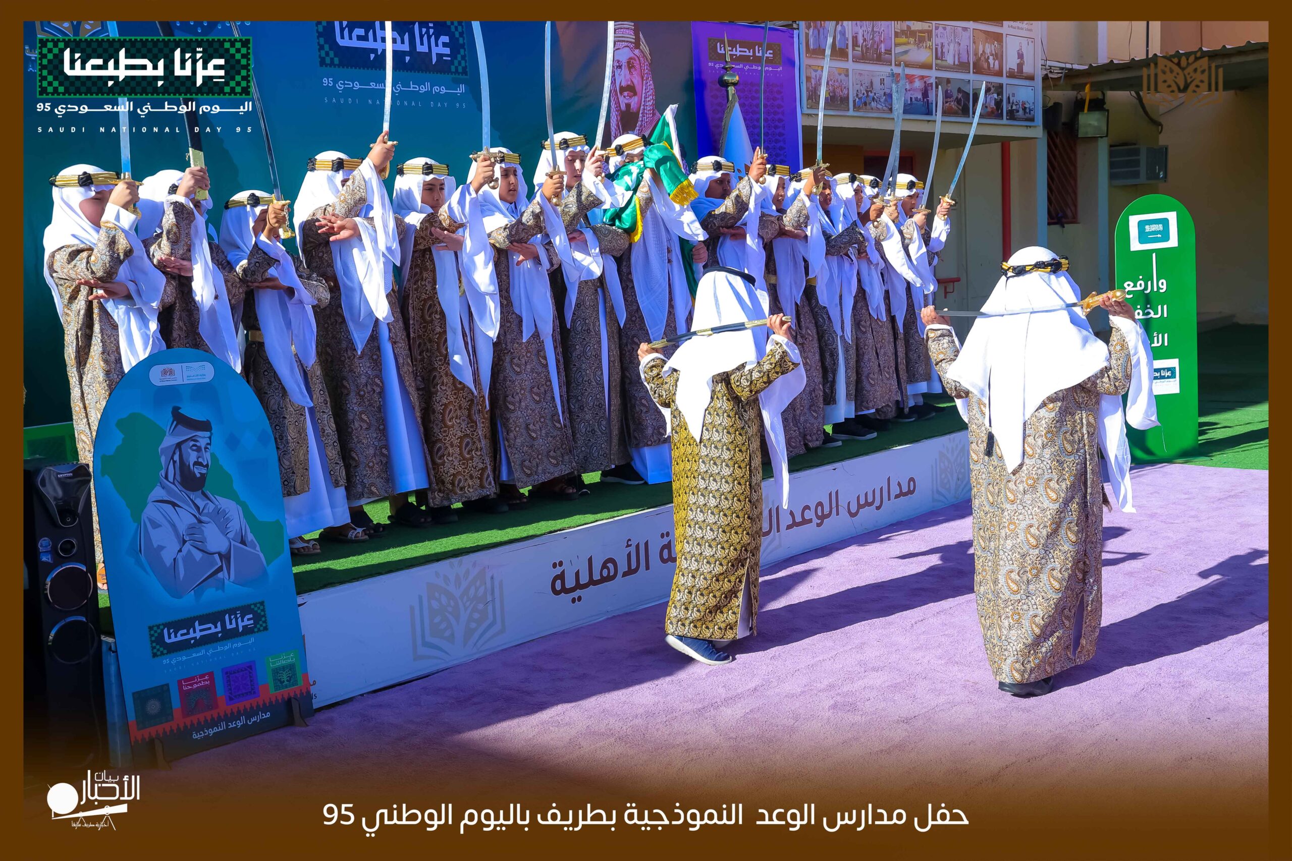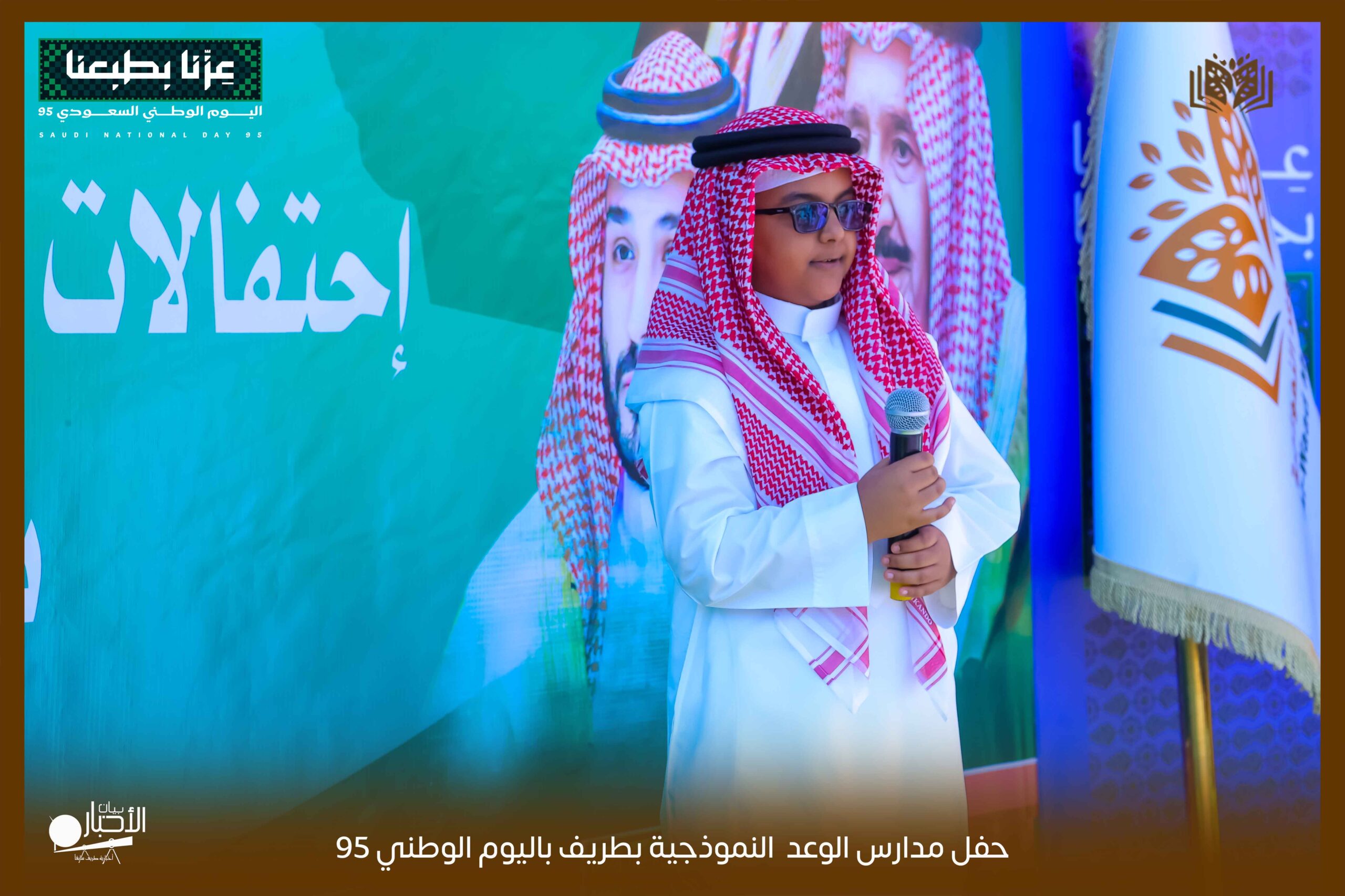 أقامت مدارس الوعد النموذجية الأهلية حفلًا بمناسبة ذكرى( اليوم الوطني السعودي ٩٥ ) ، تلك الذكرى التي تجعلنا نشعر بالاعتزاز والفخر بالانتماء لهذا الوطن العظيم ، حيث بدأ الحفل بعرض السلام الملكي ثم آيات عطرة من الذكر الحكيم ثم كلمة مدير المدرسة الأستاذ إسماعيل صالح العنزي والذي رحب بالسادة الضيوف وأولياء الأمور وتقديم التهنئة للقيادة الحكيمة والشعب السعودي بهذه المناسبة ،ثم تتابعت فقرات الحفل ما بين مشهد لملوك المملكة وعرض مسرحي بعنوان ( عزنا بطبعنا ) ثم فقرة باللغة الإنجليزية في حب الوطن ثم ختم الحفل بأداء الطلاب للعارضة السعودية ٠