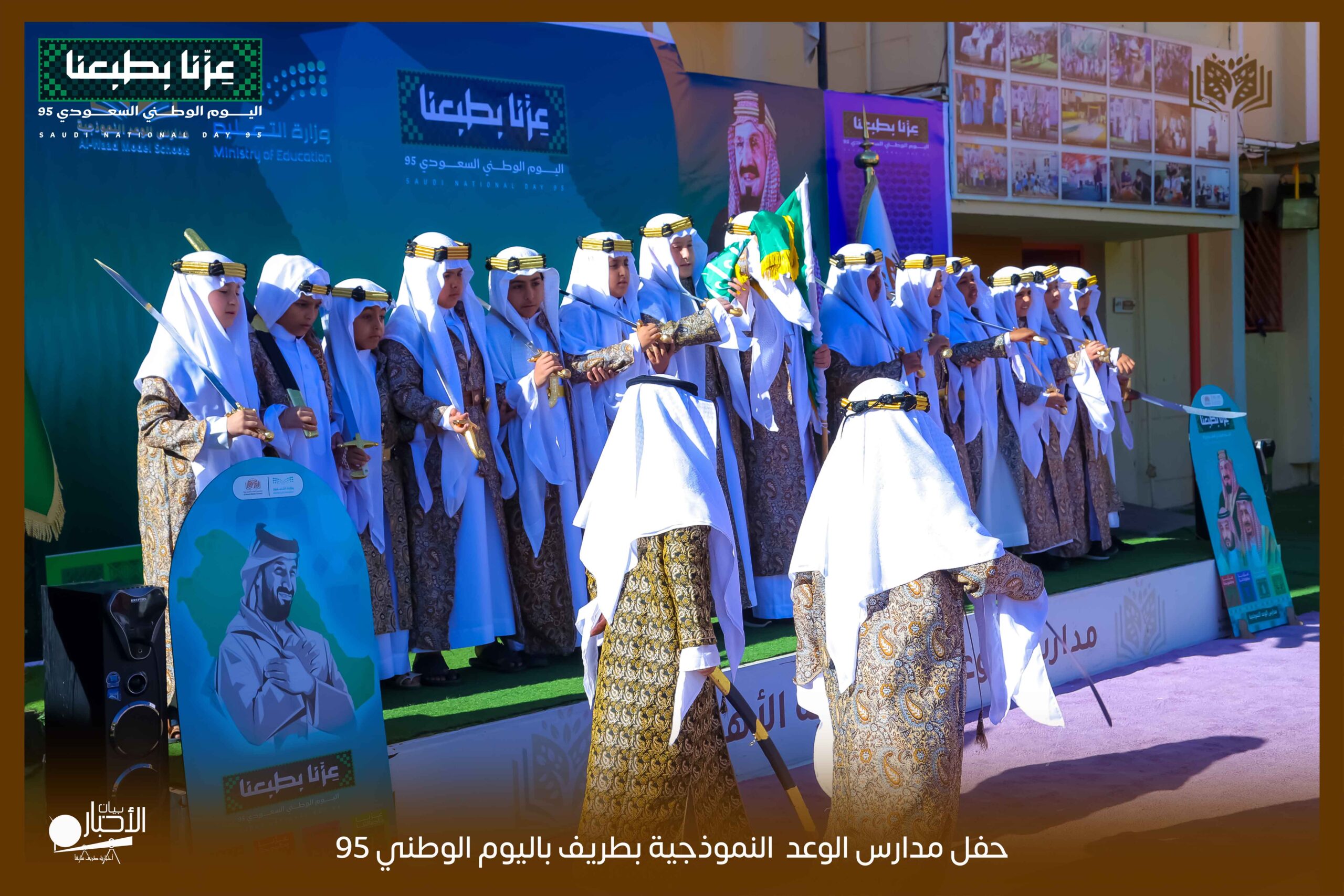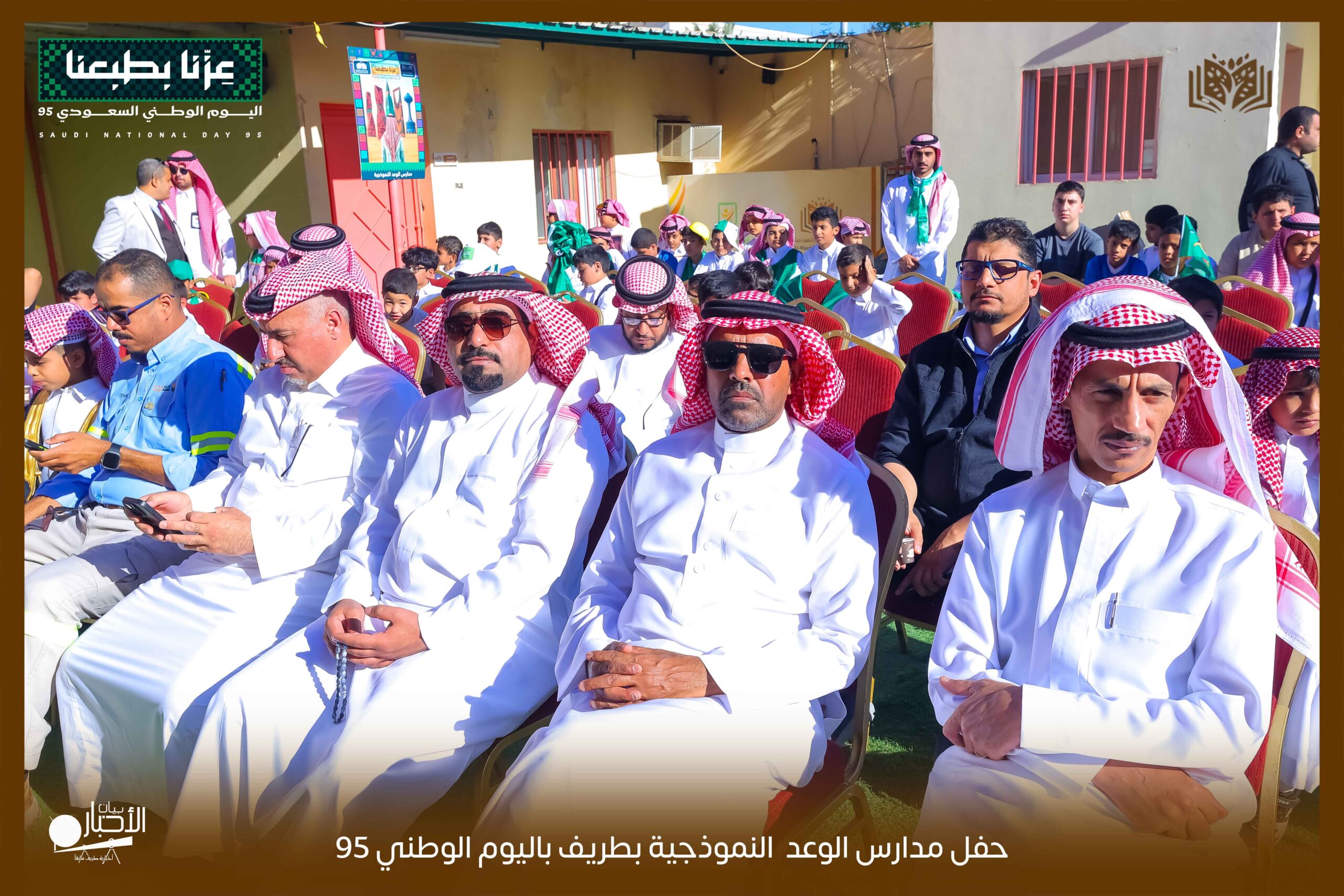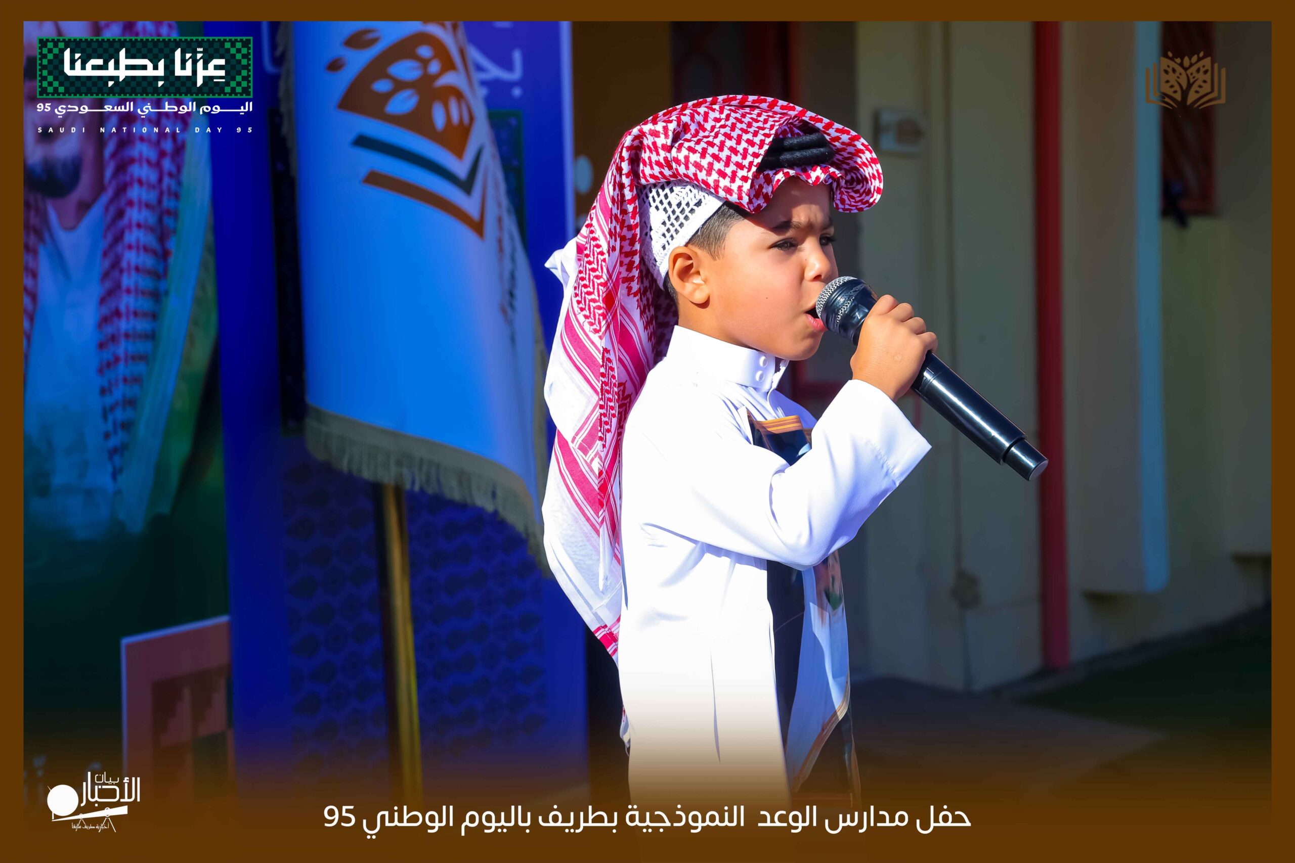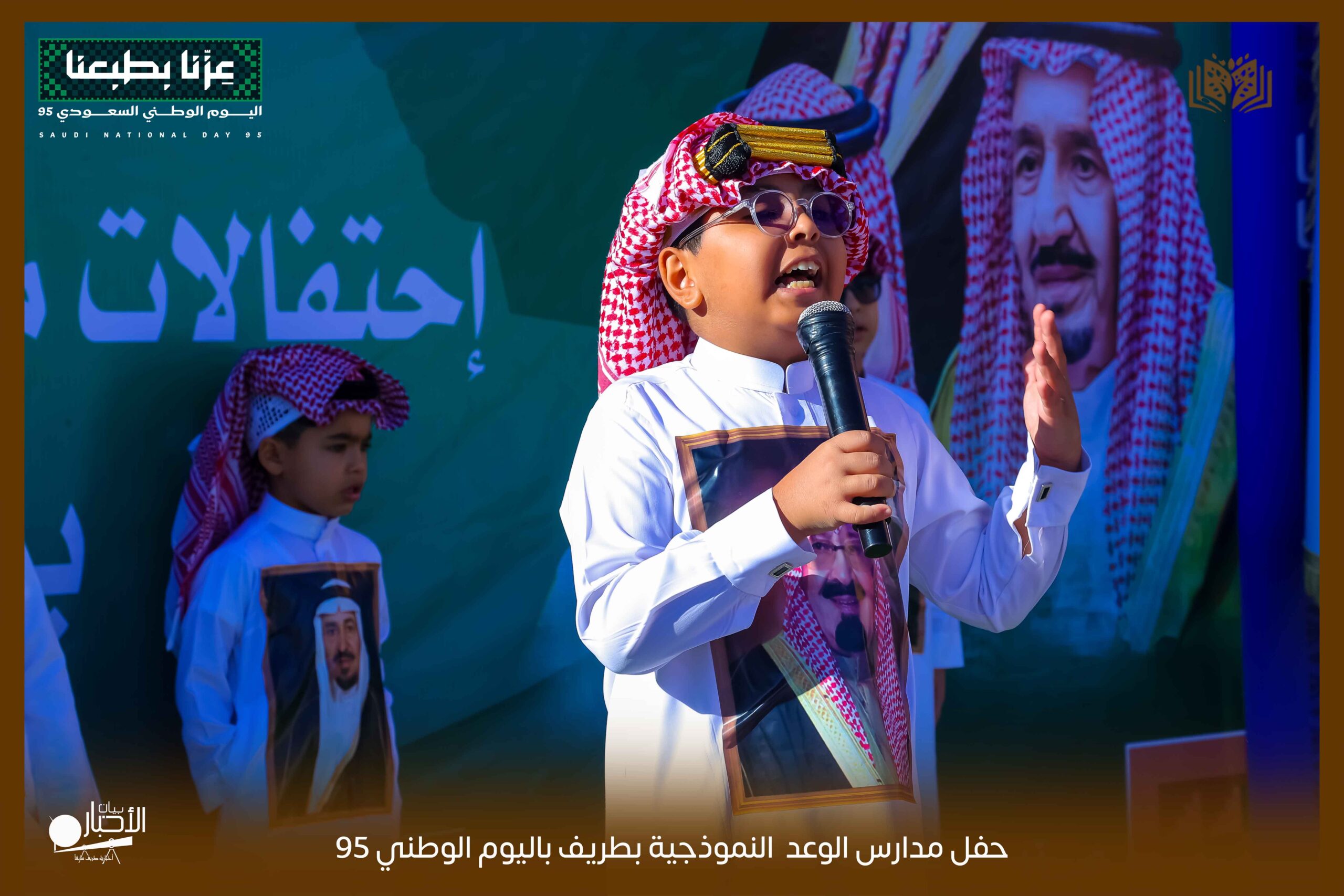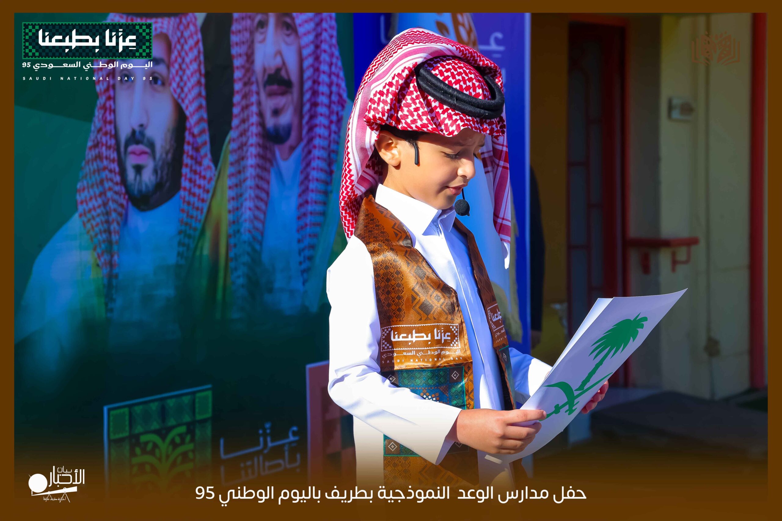 أقامت مدارس الوعد النموذجية الأهلية حفلًا بمناسبة ذكرى( اليوم الوطني السعودي ٩٥ ) ، تلك الذكرى التي تجعلنا نشعر بالاعتزاز والفخر بالانتماء لهذا الوطن العظيم ، حيث بدأ الحفل بعرض السلام الملكي ثم آيات عطرة من الذكر الحكيم ثم كلمة مدير المدرسة الأستاذ إسماعيل صالح العنزي والذي رحب بالسادة الضيوف وأولياء الأمور وتقديم التهنئة للقيادة الحكيمة والشعب السعودي بهذه المناسبة ،ثم تتابعت فقرات الحفل ما بين مشهد لملوك المملكة وعرض مسرحي بعنوان ( عزنا بطبعنا ) ثم فقرة باللغة الإنجليزية في حب الوطن ثم ختم الحفل بأداء الطلاب للعارضة السعودية ٠