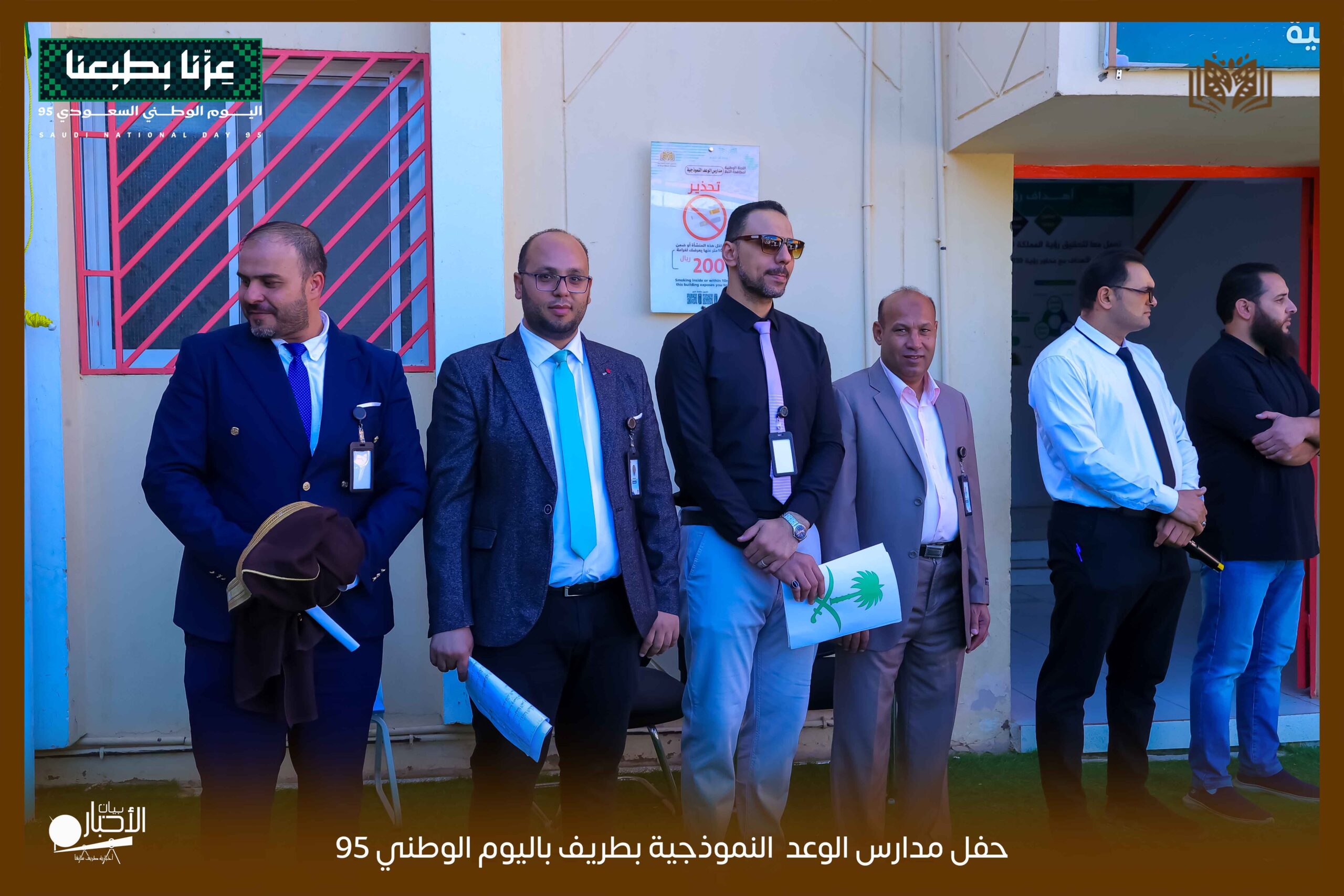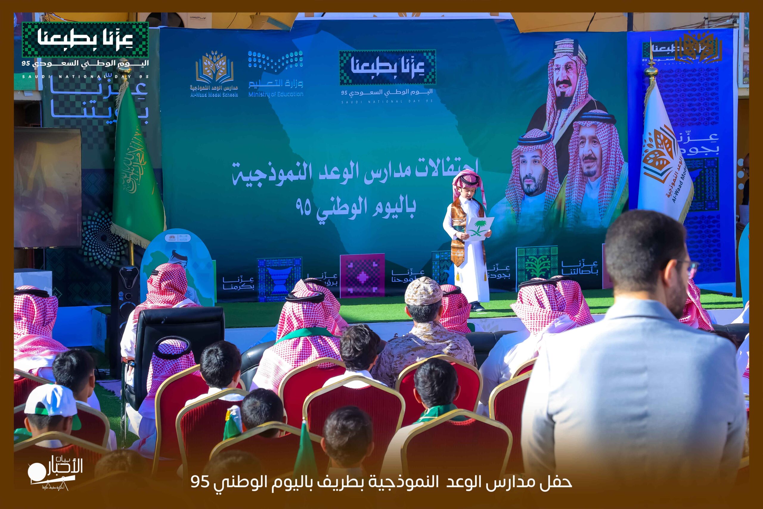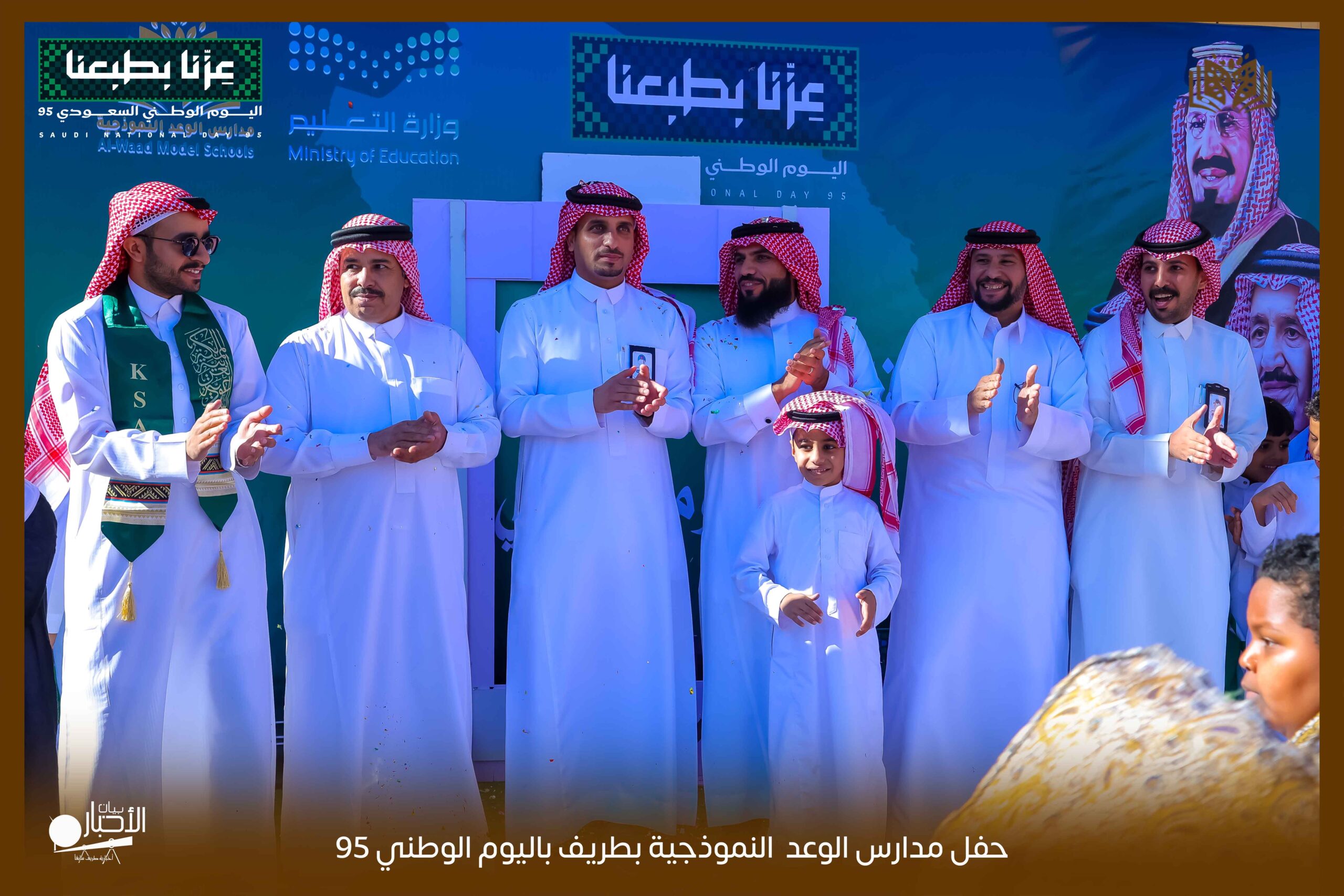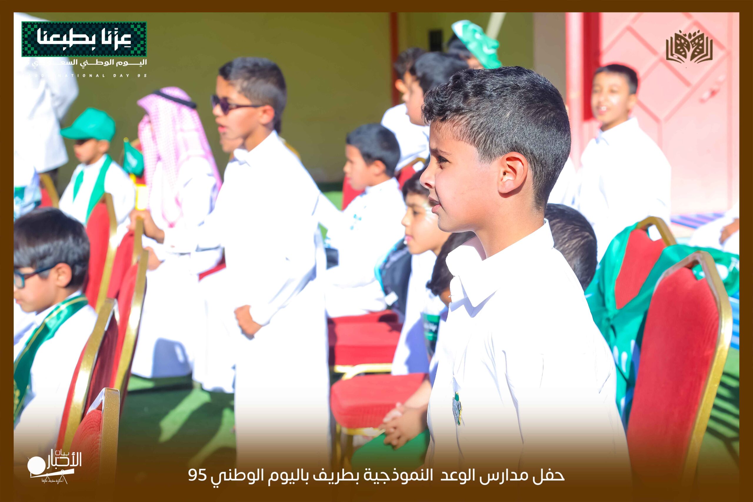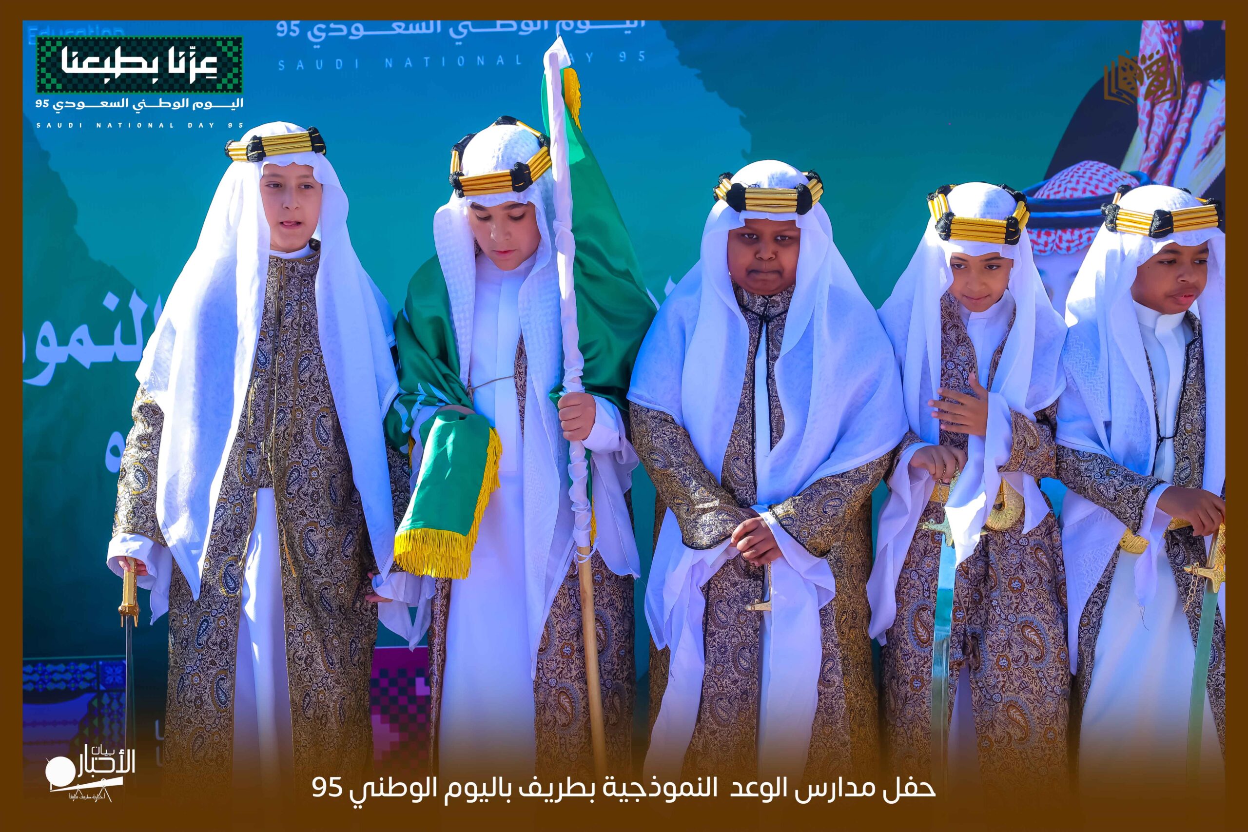 أقامت مدارس الوعد النموذجية الأهلية حفلًا بمناسبة ذكرى( اليوم الوطني السعودي ٩٥ ) ، تلك الذكرى التي تجعلنا نشعر بالاعتزاز والفخر بالانتماء لهذا الوطن العظيم ، حيث بدأ الحفل بعرض السلام الملكي ثم آيات عطرة من الذكر الحكيم ثم كلمة مدير المدرسة الأستاذ إسماعيل صالح العنزي والذي رحب بالسادة الضيوف وأولياء الأمور وتقديم التهنئة للقيادة الحكيمة والشعب السعودي بهذه المناسبة ،ثم تتابعت فقرات الحفل ما بين مشهد لملوك المملكة وعرض مسرحي بعنوان ( عزنا بطبعنا ) ثم فقرة باللغة الإنجليزية في حب الوطن ثم ختم الحفل بأداء الطلاب للعارضة السعودية ٠