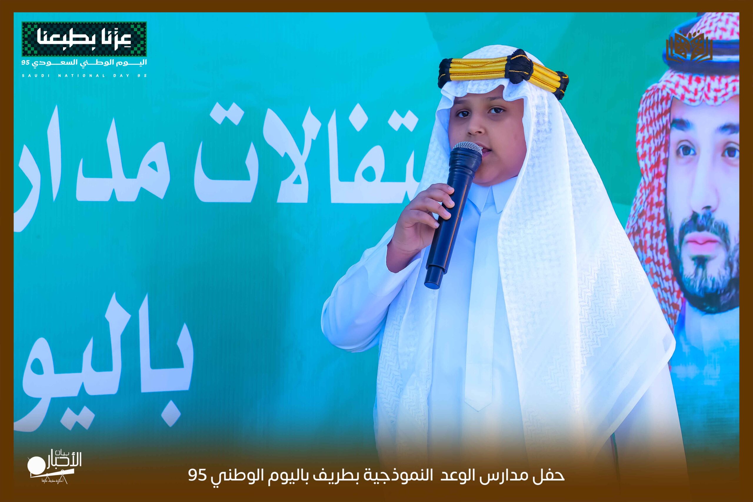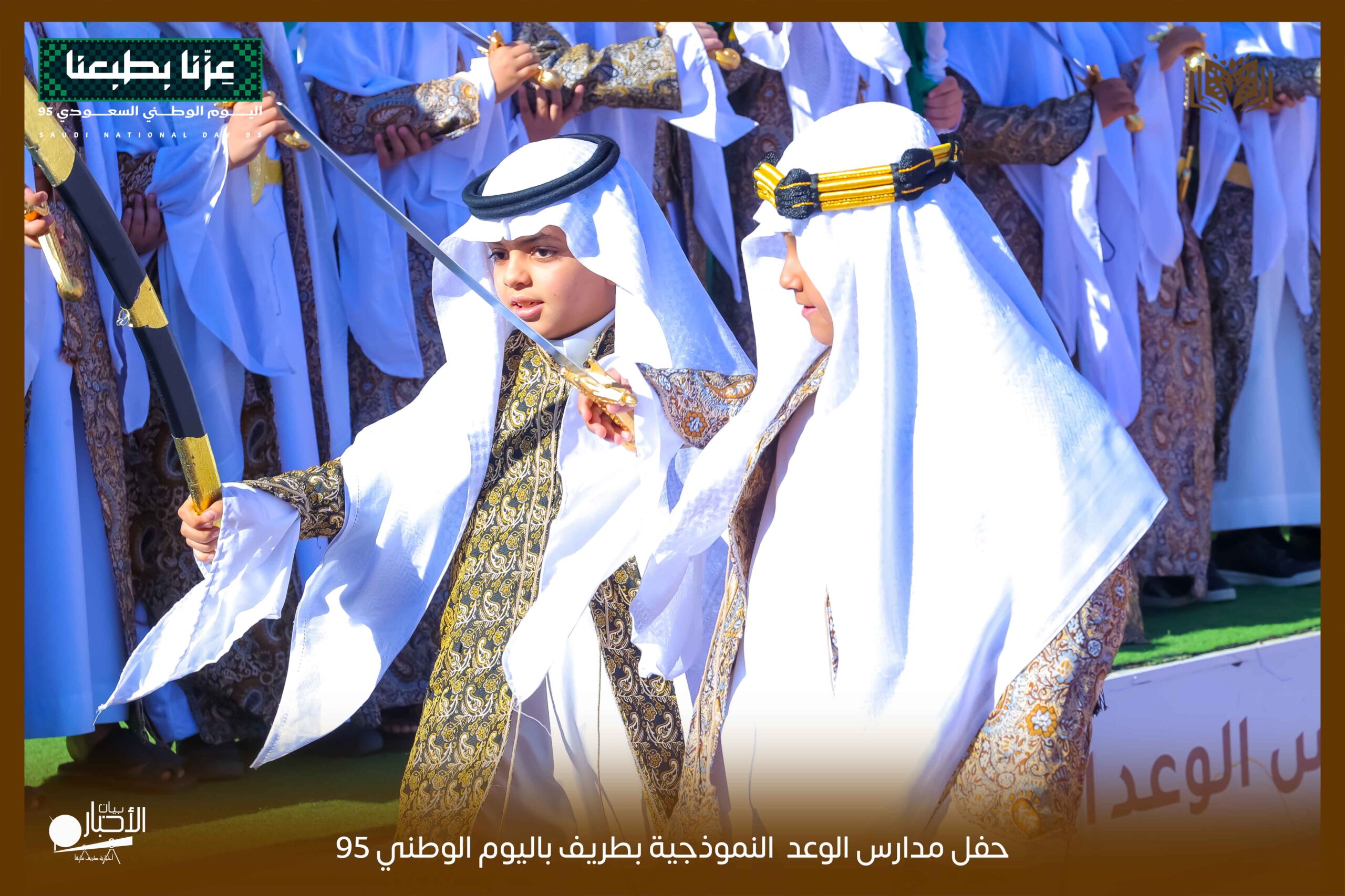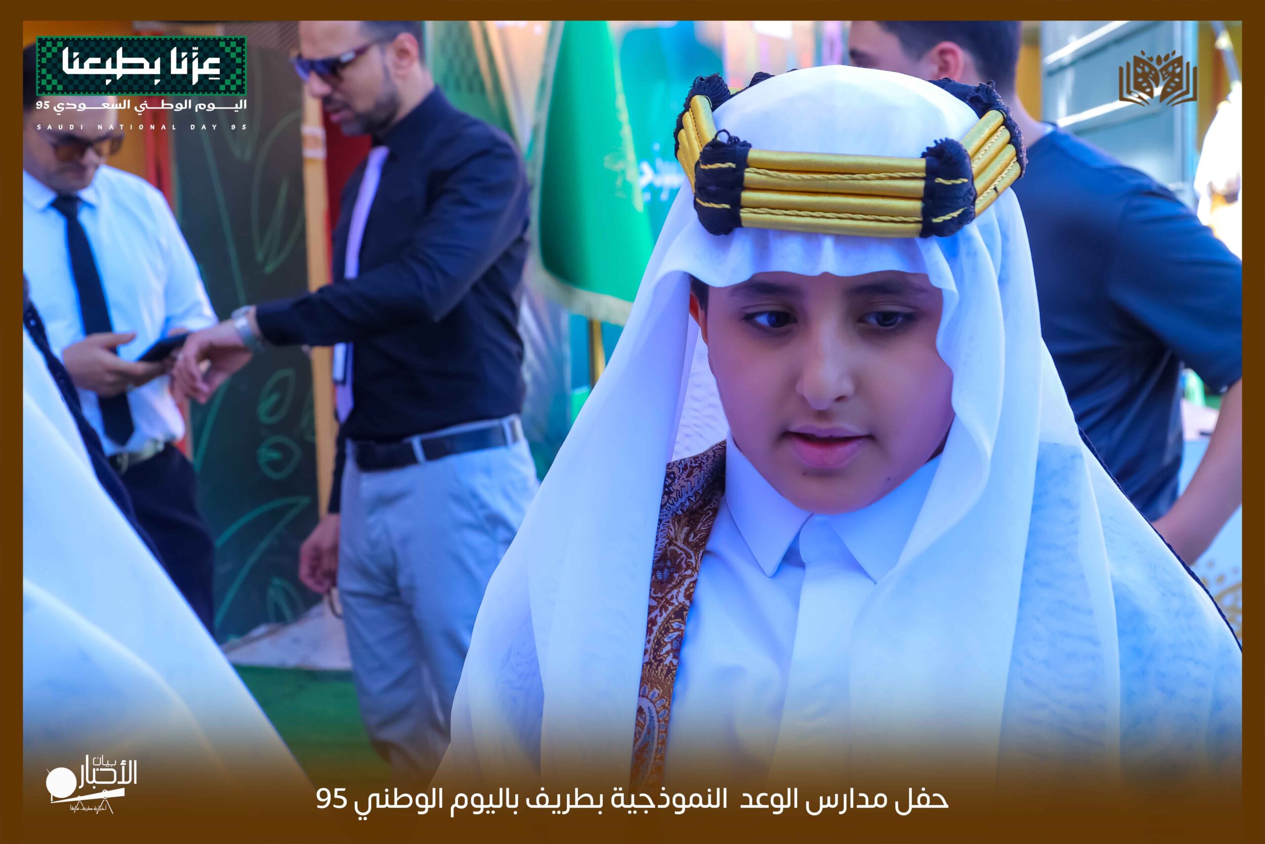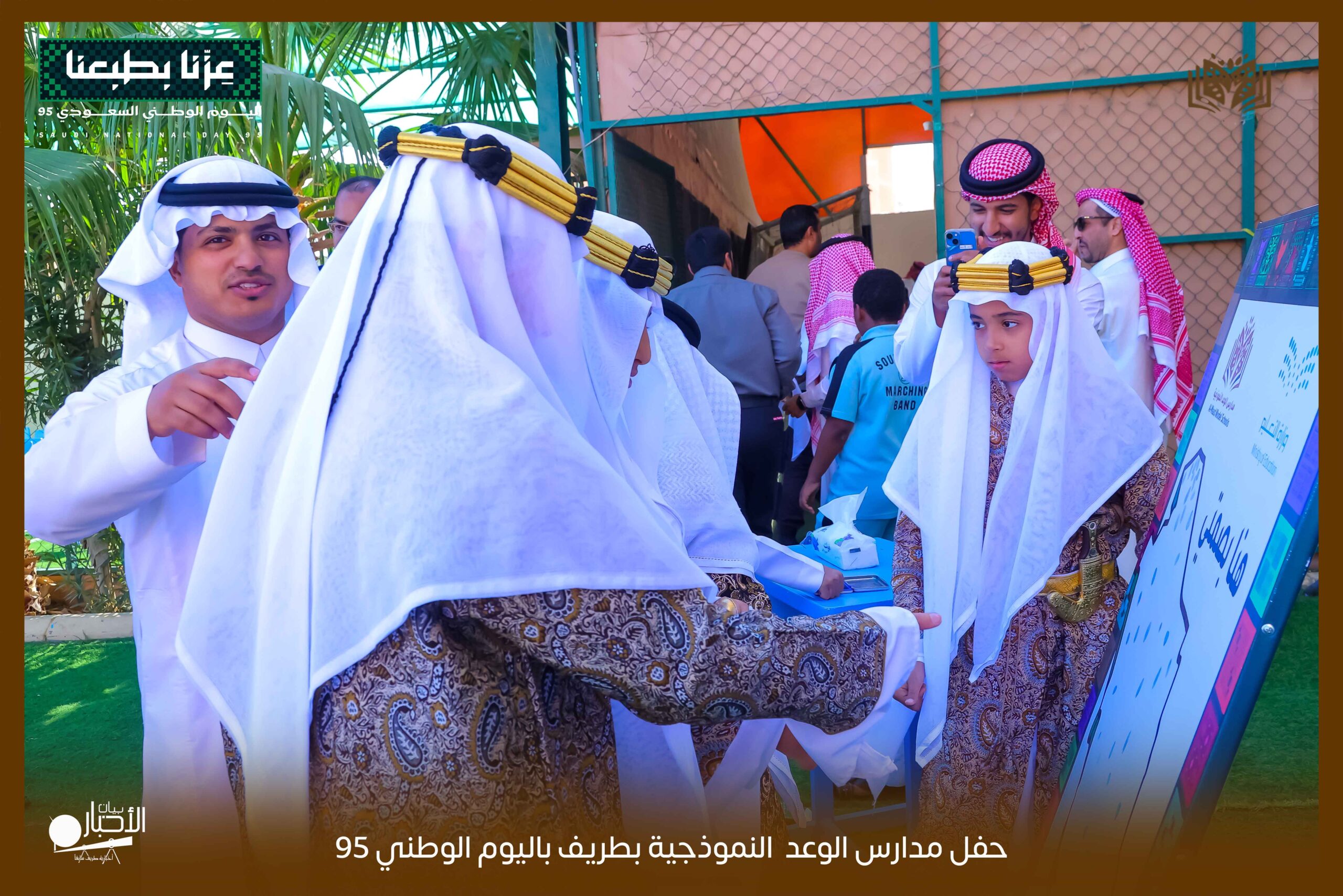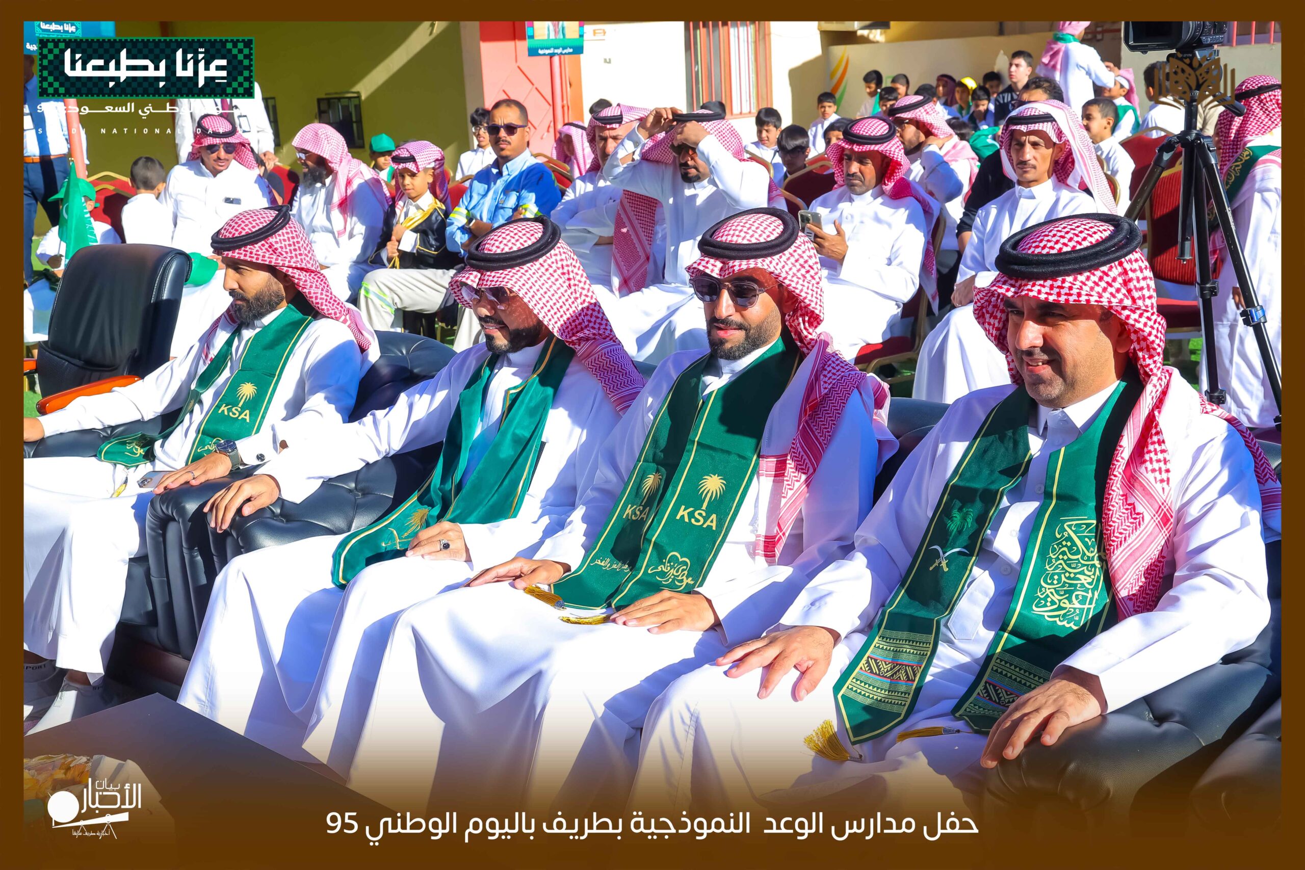 أقامت مدارس الوعد النموذجية الأهلية حفلًا بمناسبة ذكرى( اليوم الوطني السعودي ٩٥ ) ، تلك الذكرى التي تجعلنا نشعر بالاعتزاز والفخر بالانتماء لهذا الوطن العظيم ، حيث بدأ الحفل بعرض السلام الملكي ثم آيات عطرة من الذكر الحكيم ثم كلمة مدير المدرسة الأستاذ إسماعيل صالح العنزي والذي رحب بالسادة الضيوف وأولياء الأمور وتقديم التهنئة للقيادة الحكيمة والشعب السعودي بهذه المناسبة ،ثم تتابعت فقرات الحفل ما بين مشهد لملوك المملكة وعرض مسرحي بعنوان ( عزنا بطبعنا ) ثم فقرة باللغة الإنجليزية في حب الوطن ثم ختم الحفل بأداء الطلاب للعارضة السعودية ٠